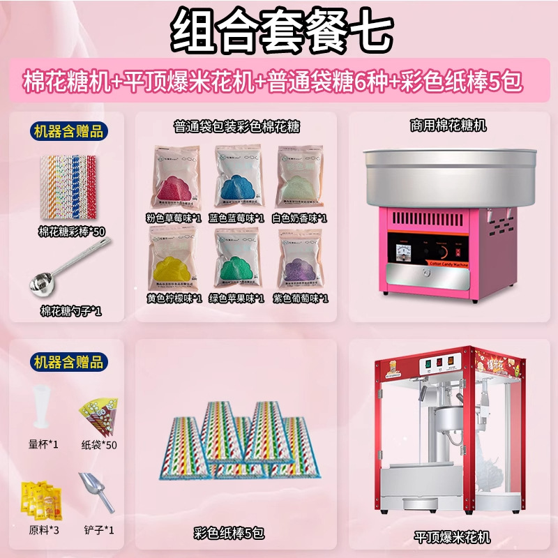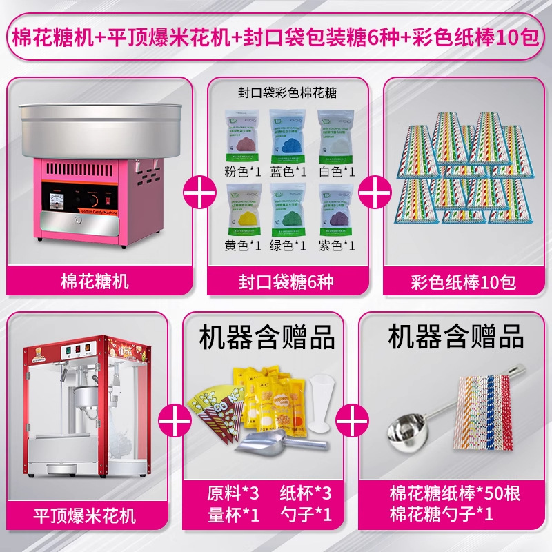 • [특별 추천 패키지] 마시멜로 기계 + 06A 플랫탑 팝콘 기계 + 밀봉 봉지 포장 설탕 6종, 각 1000g + 색종이 스틱 10팩 500개