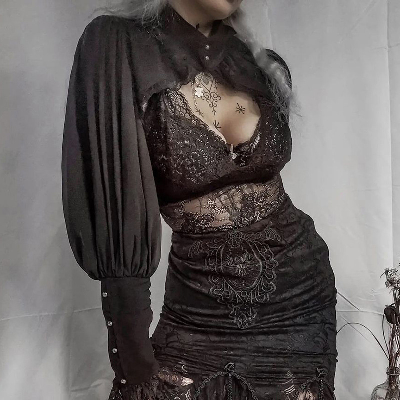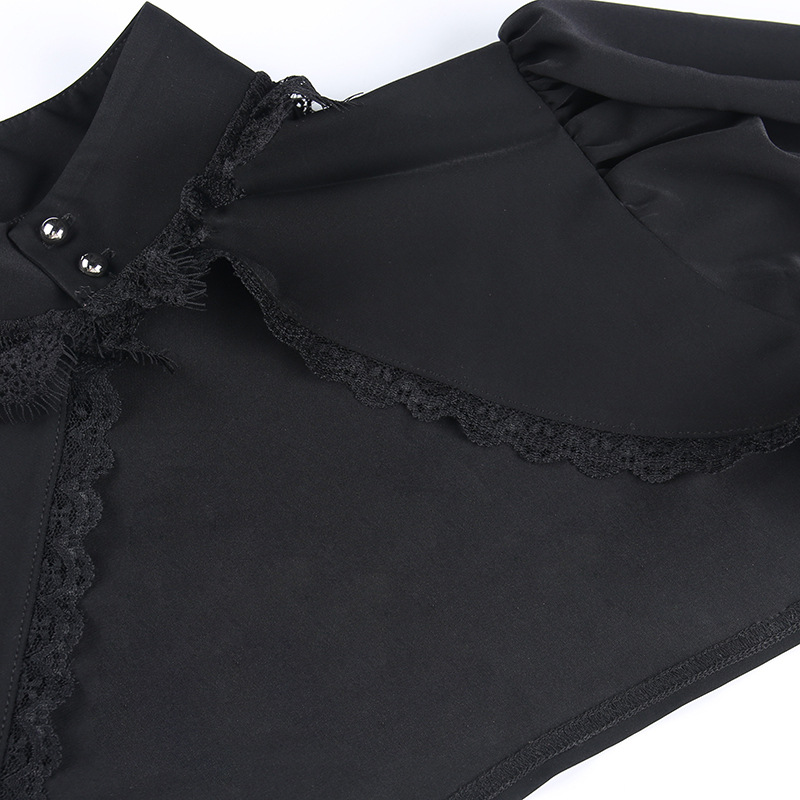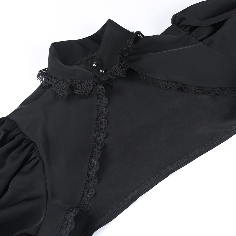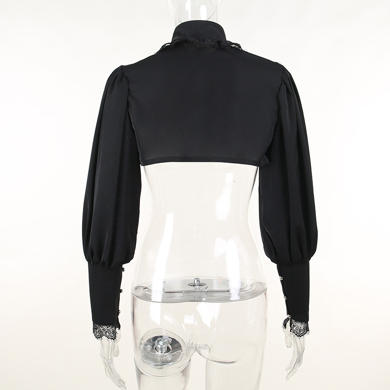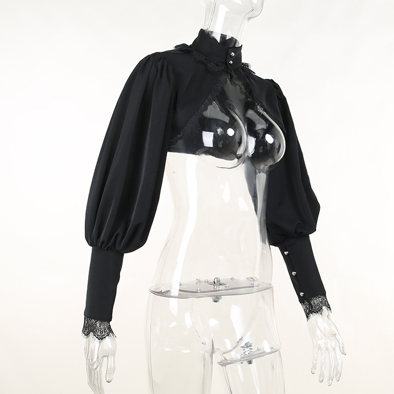 레이스 마감 디자인과 다크 코트 스타일의 하이넥 긴팔 조끼 탑이 돋보이는 여성용 쇼트 블라우스