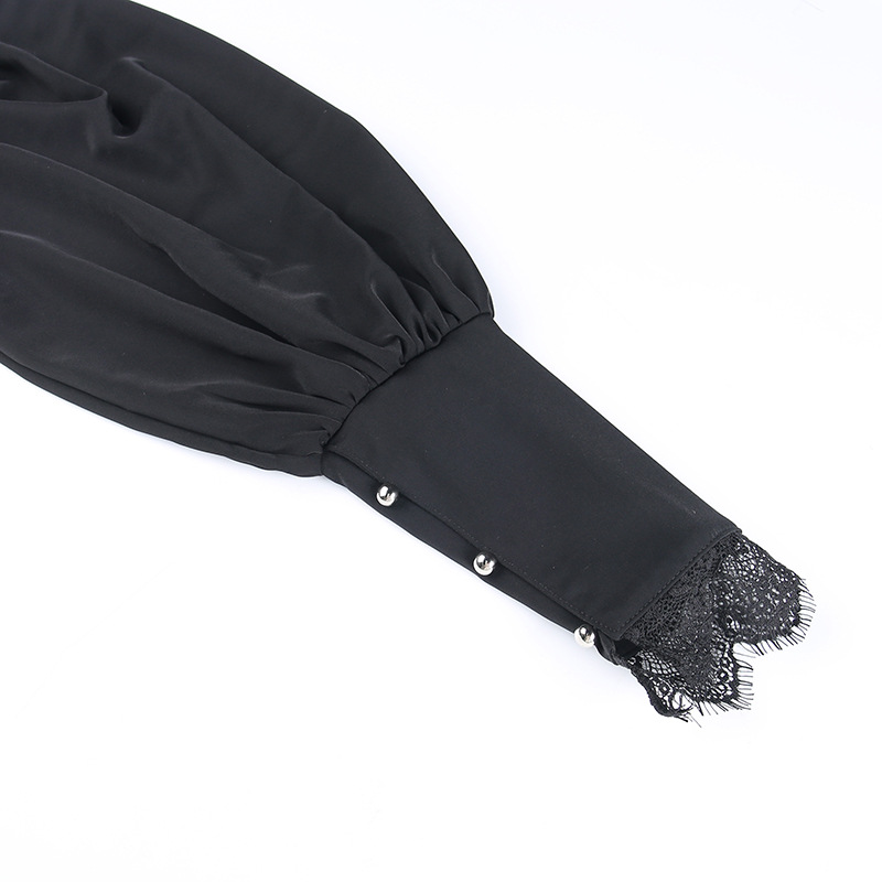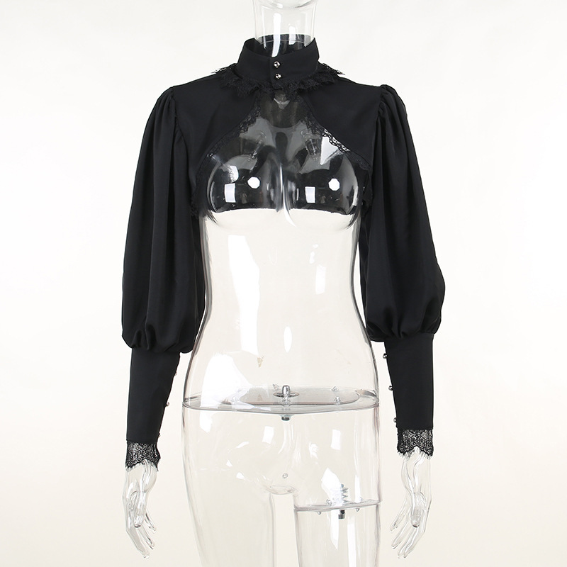 레이스 마감 디자인과 다크 코트 스타일의 하이넥 긴팔 조끼 탑이 돋보이는 여성용 쇼트 블라우스스토어 가기