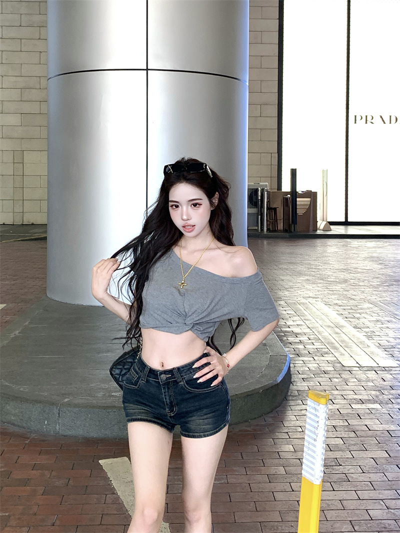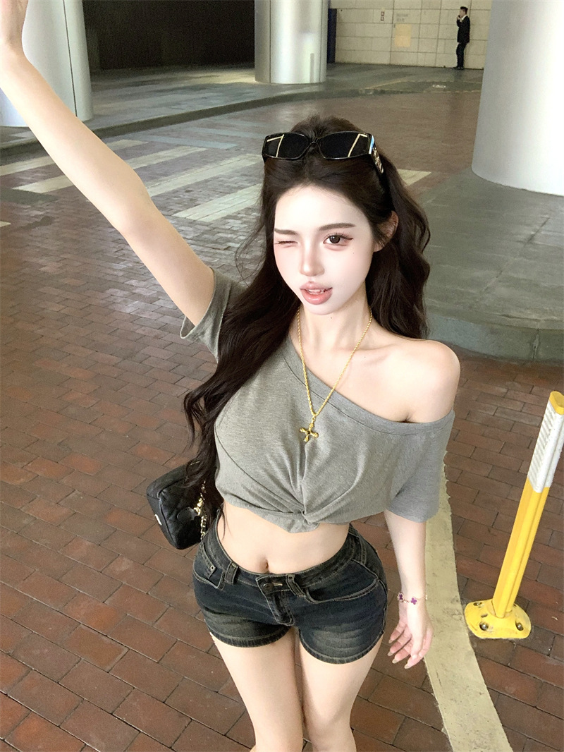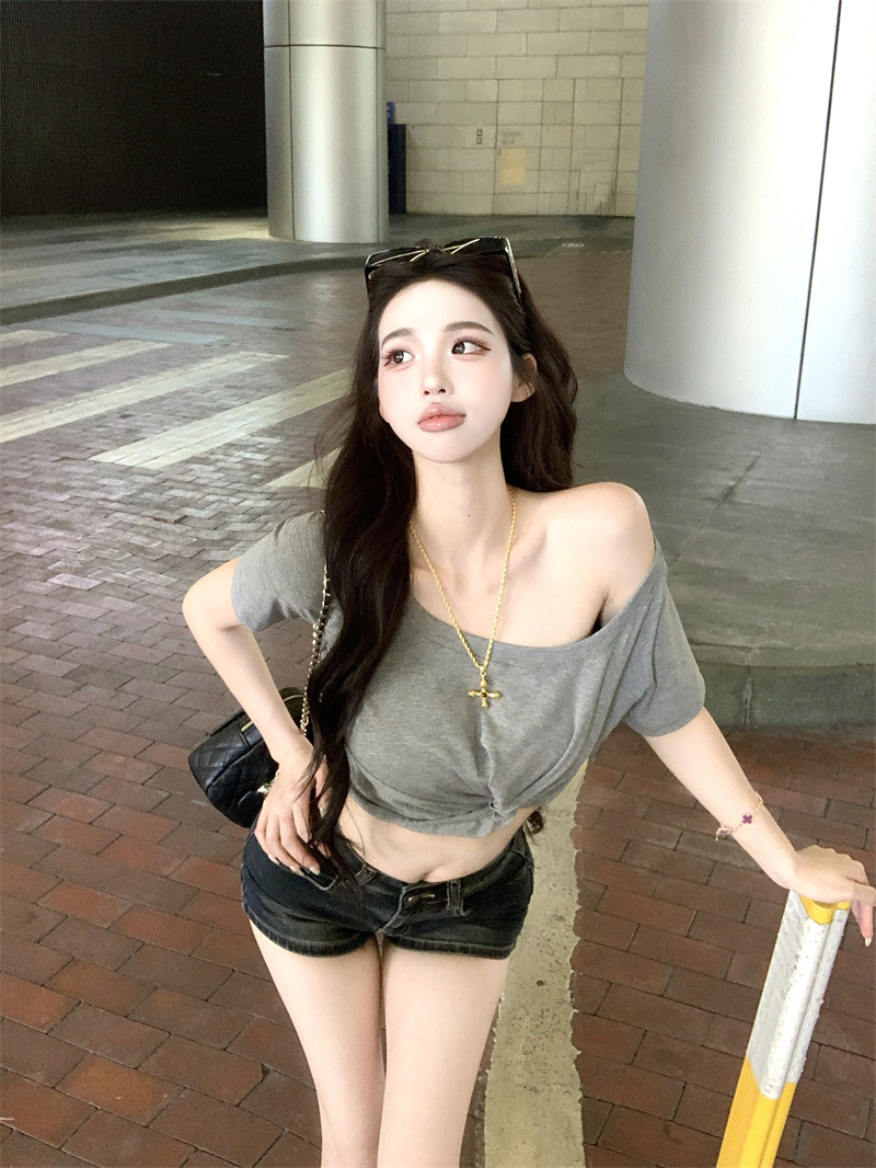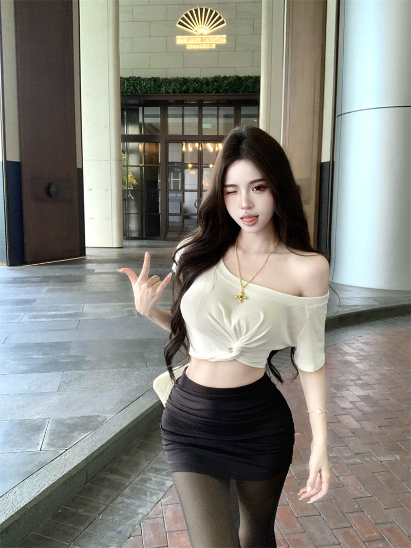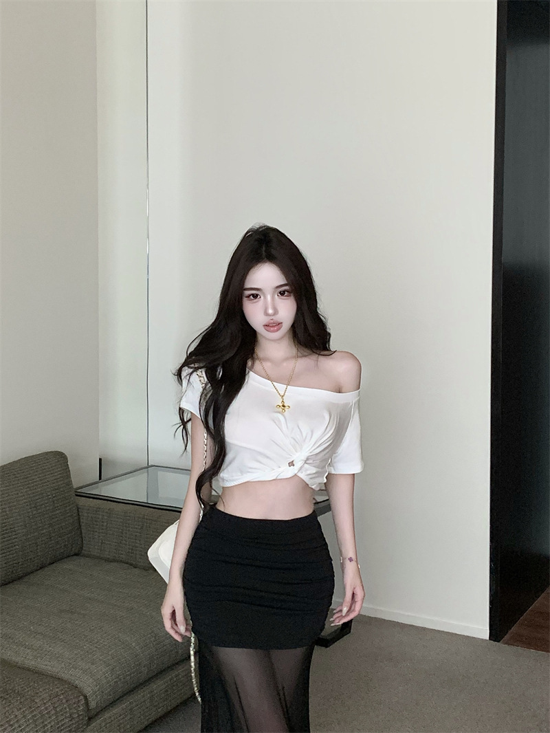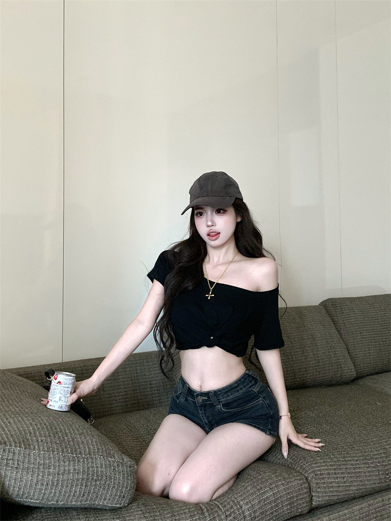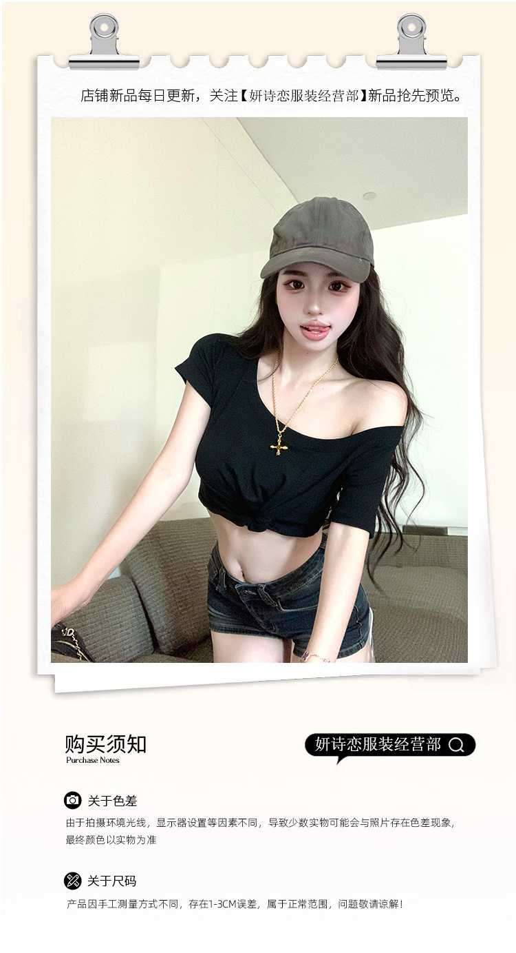 纯欲风露肩短袖黑色T恤女夏季扭结修身辣妹性感显瘦短款露脐上衣스토어 가기