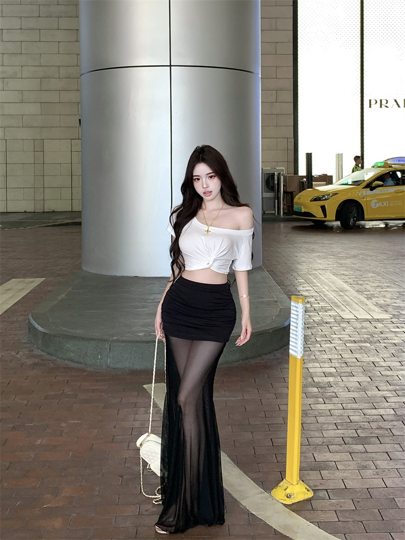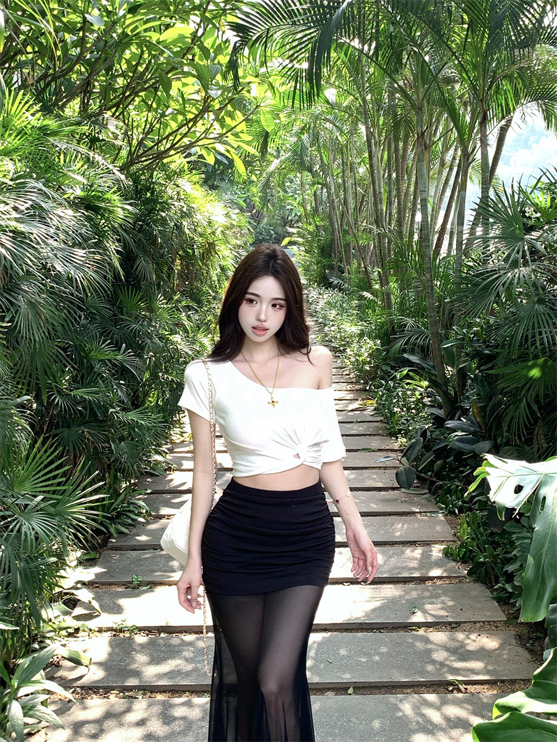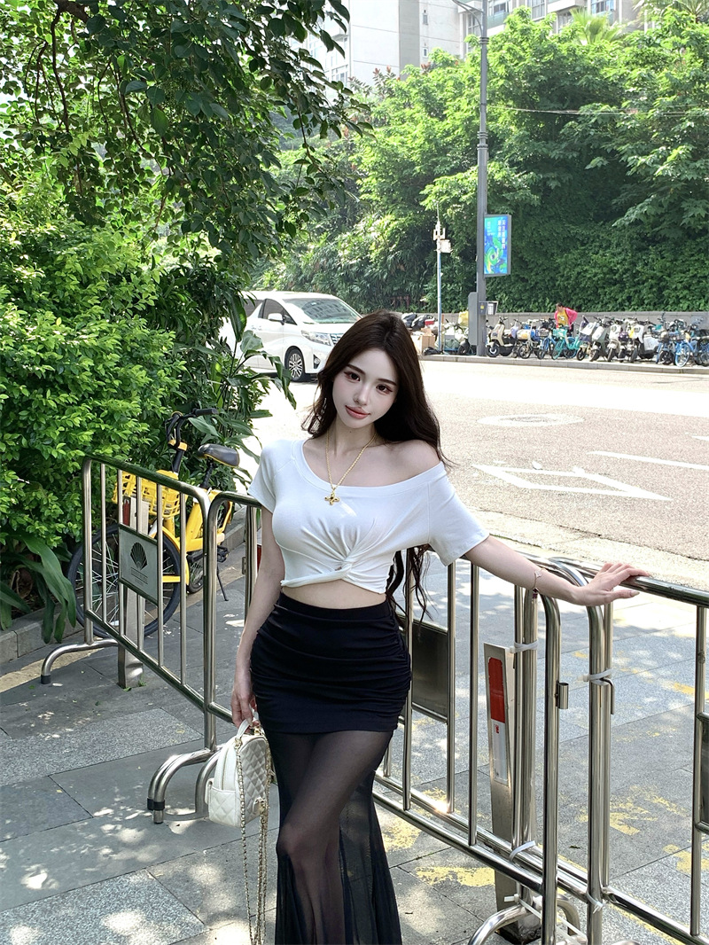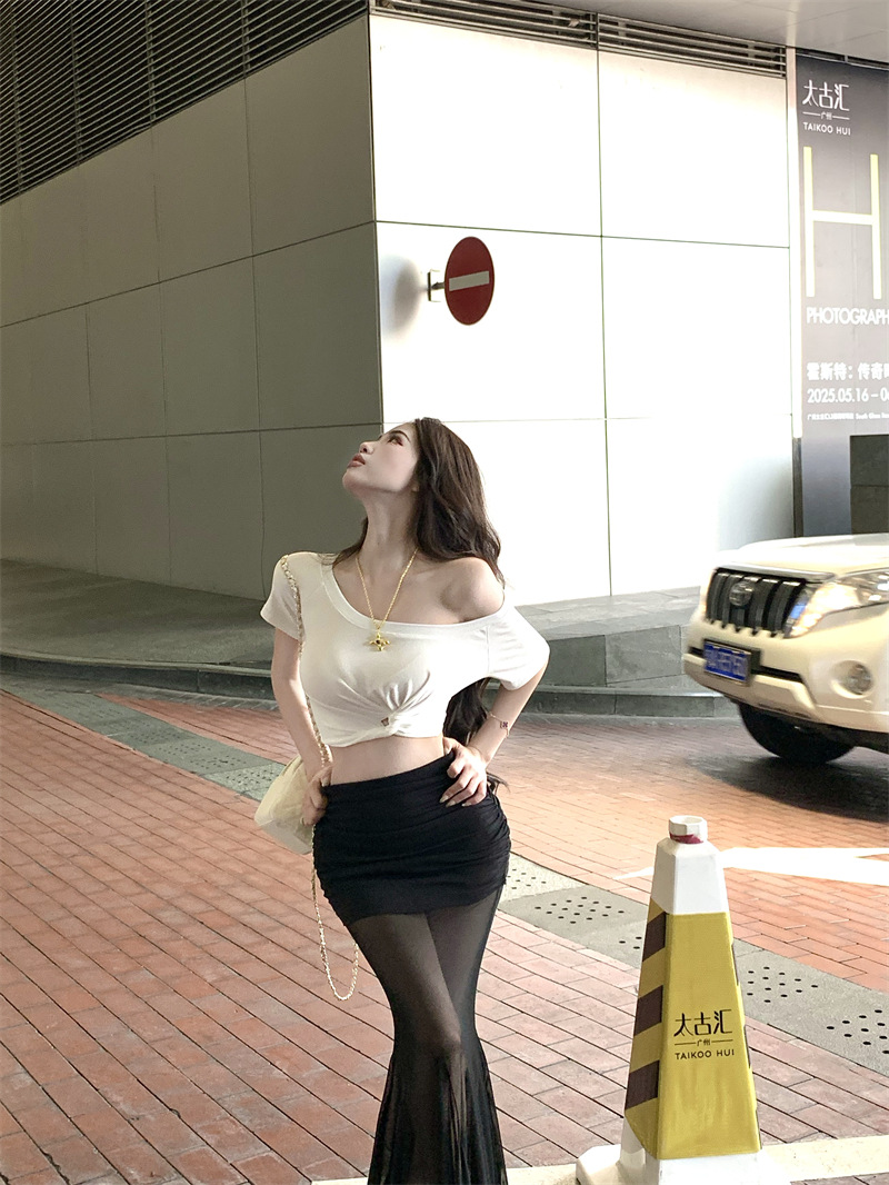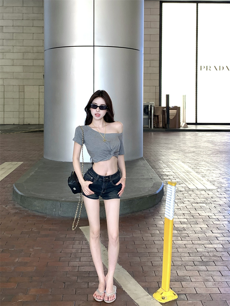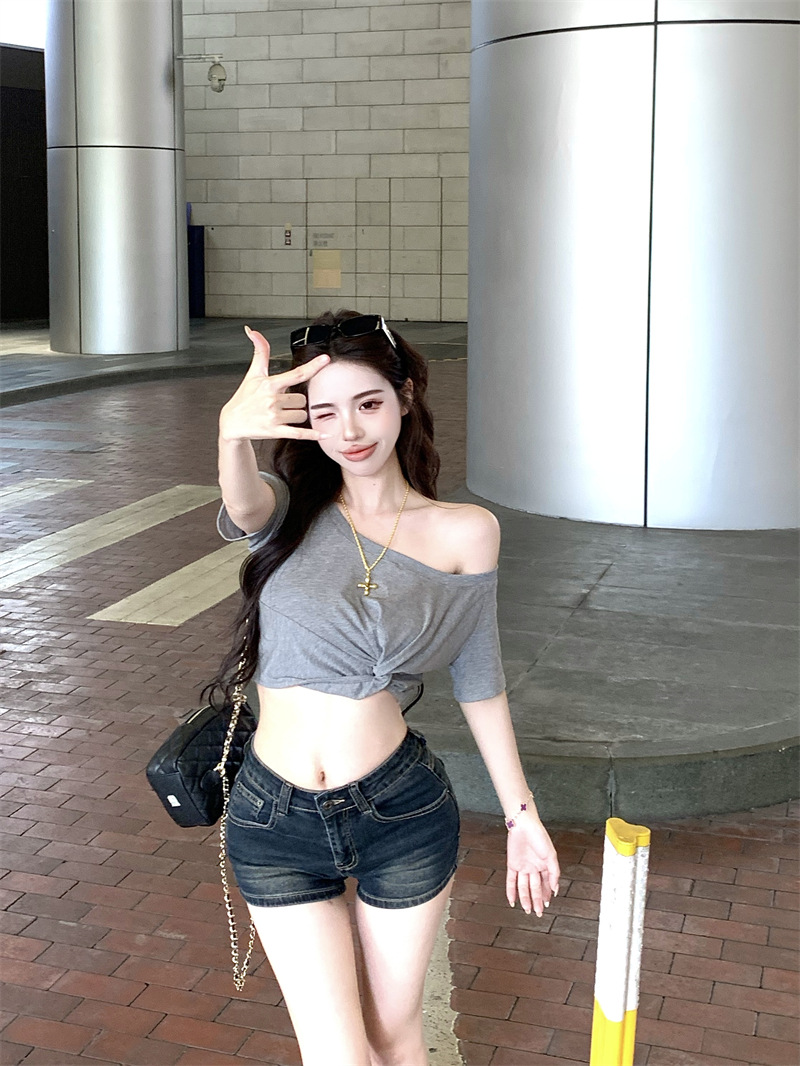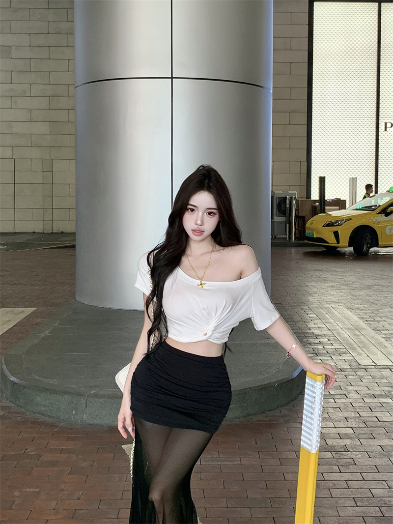 纯欲风露肩短袖黑色T恤女夏季扭结修身辣妹性感显瘦短款露脐上衣스토어 가기