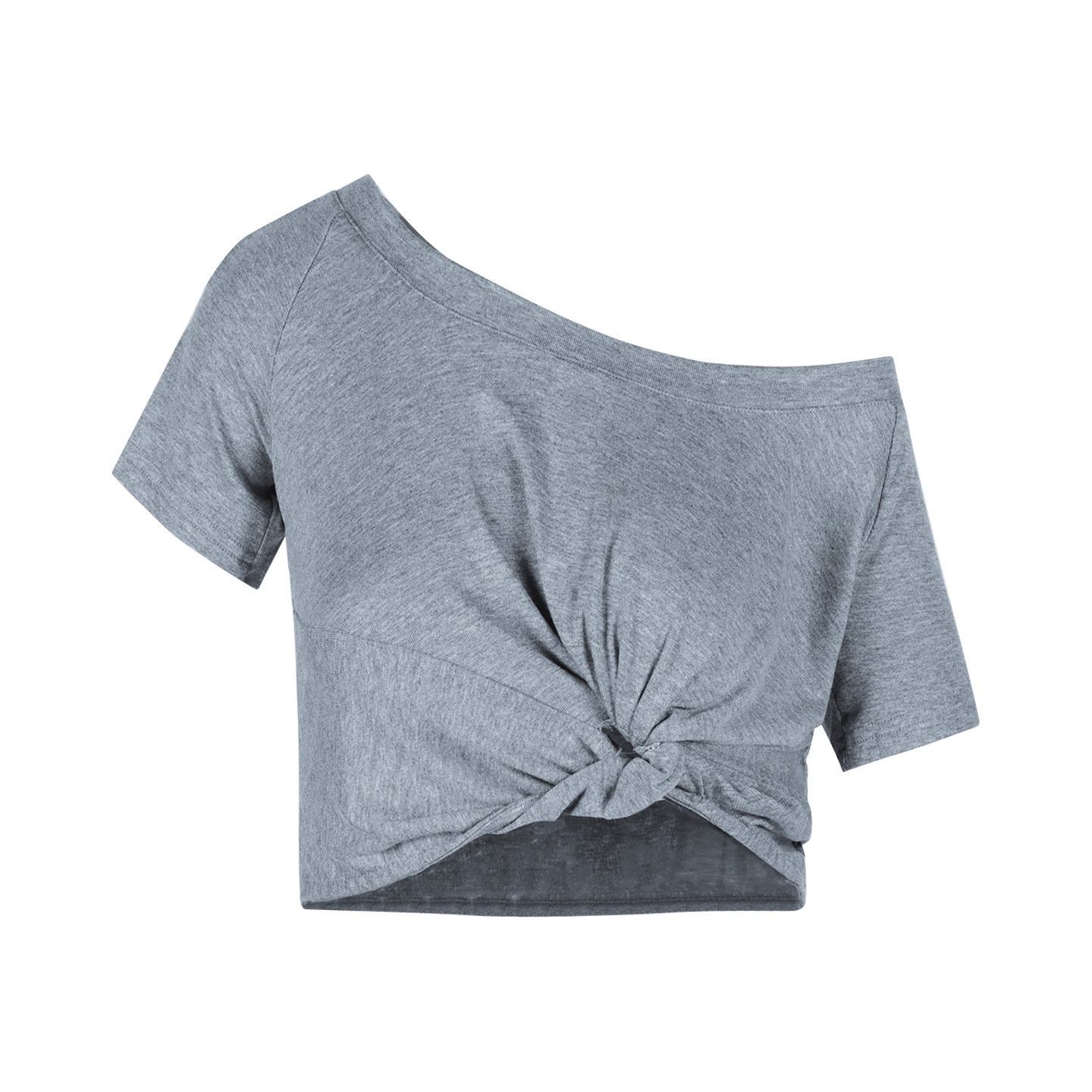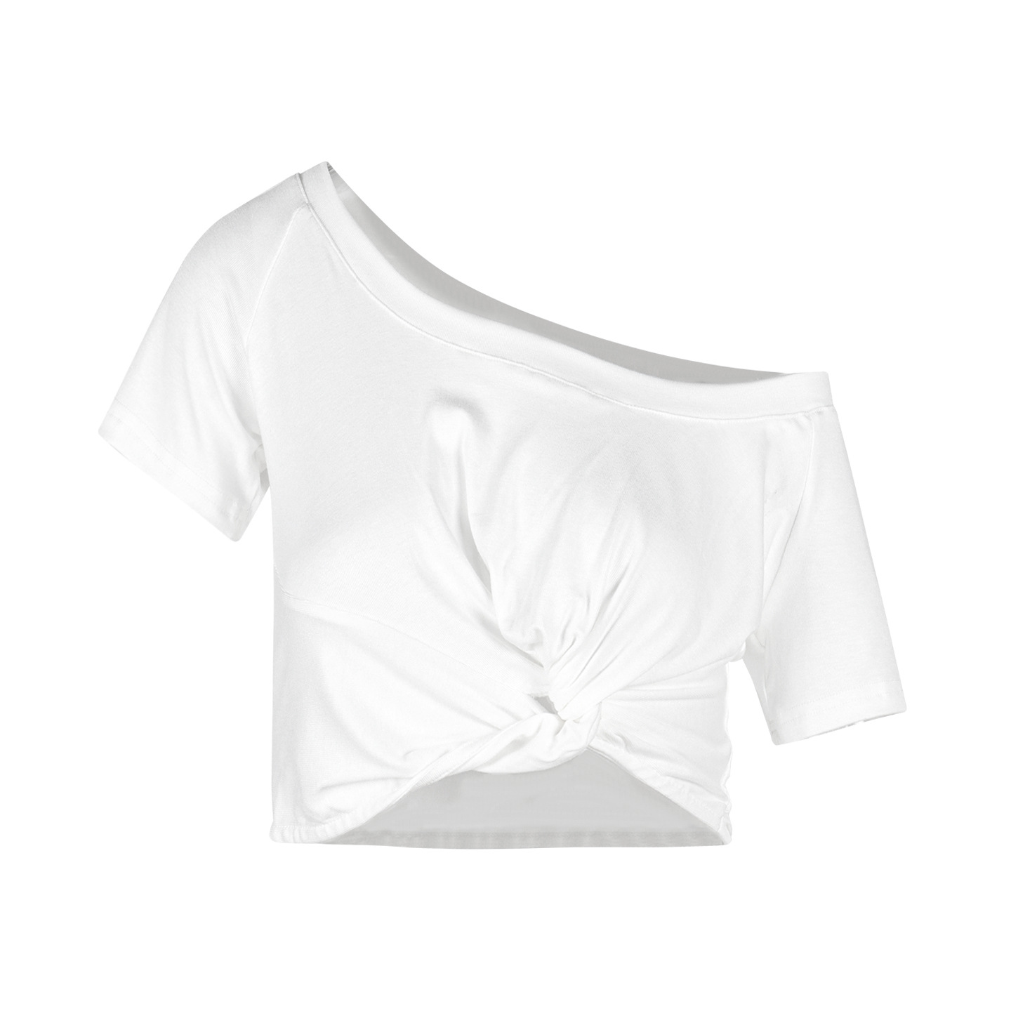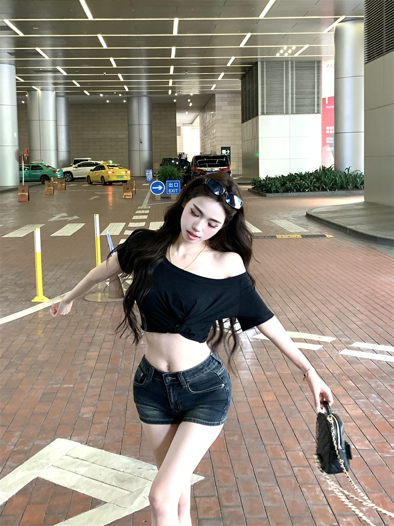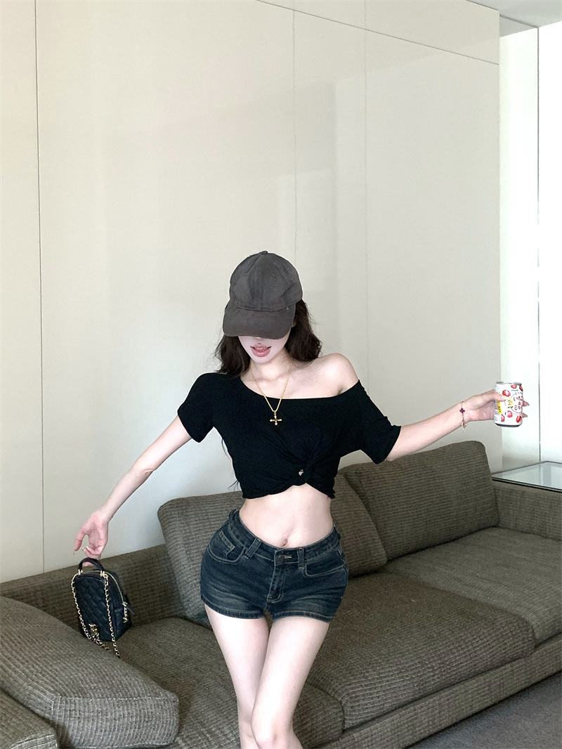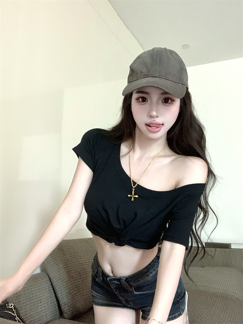 纯欲风露肩短袖黑色T恤女夏季扭结修身辣妹性感显瘦短款露脐上衣