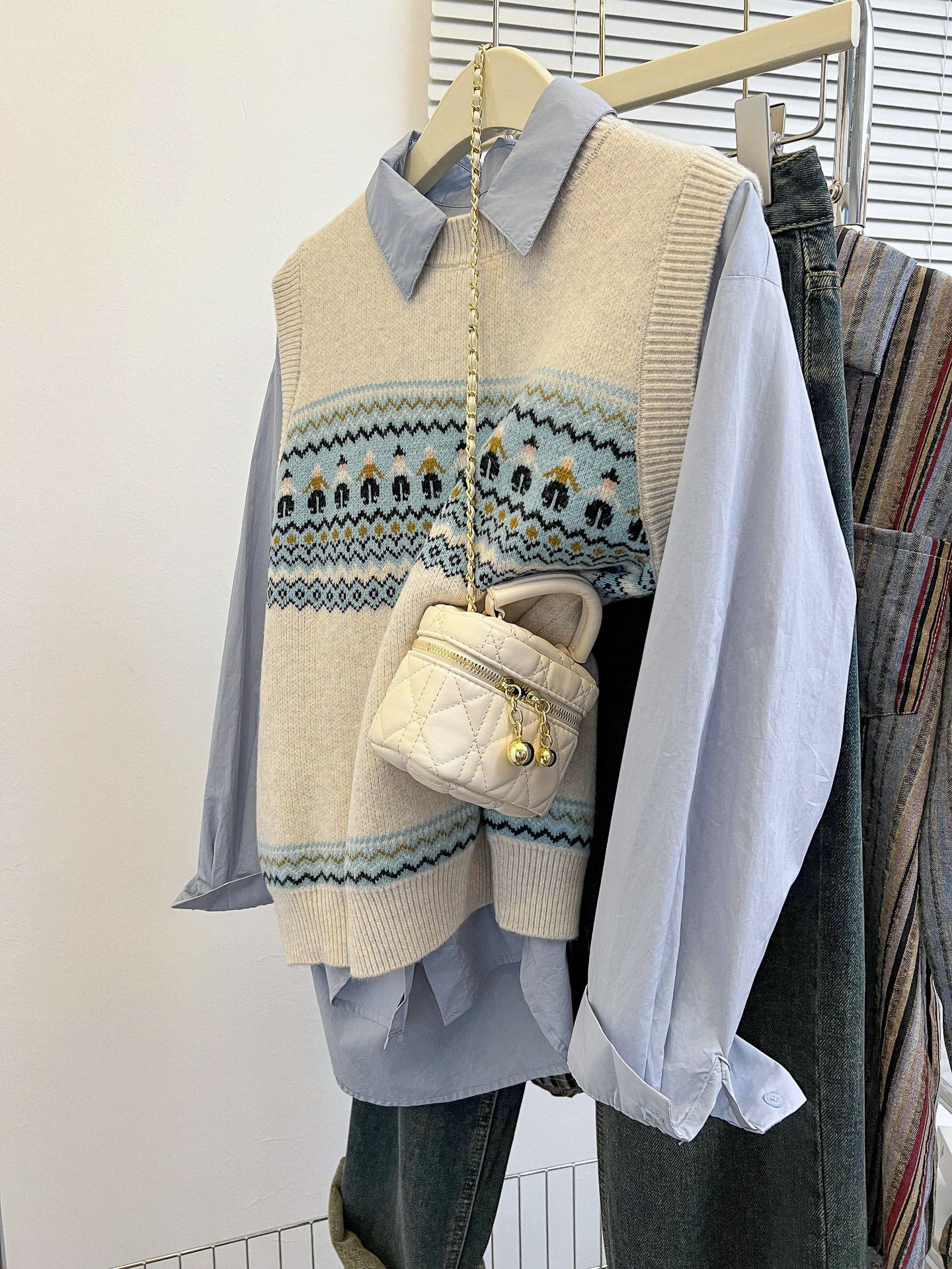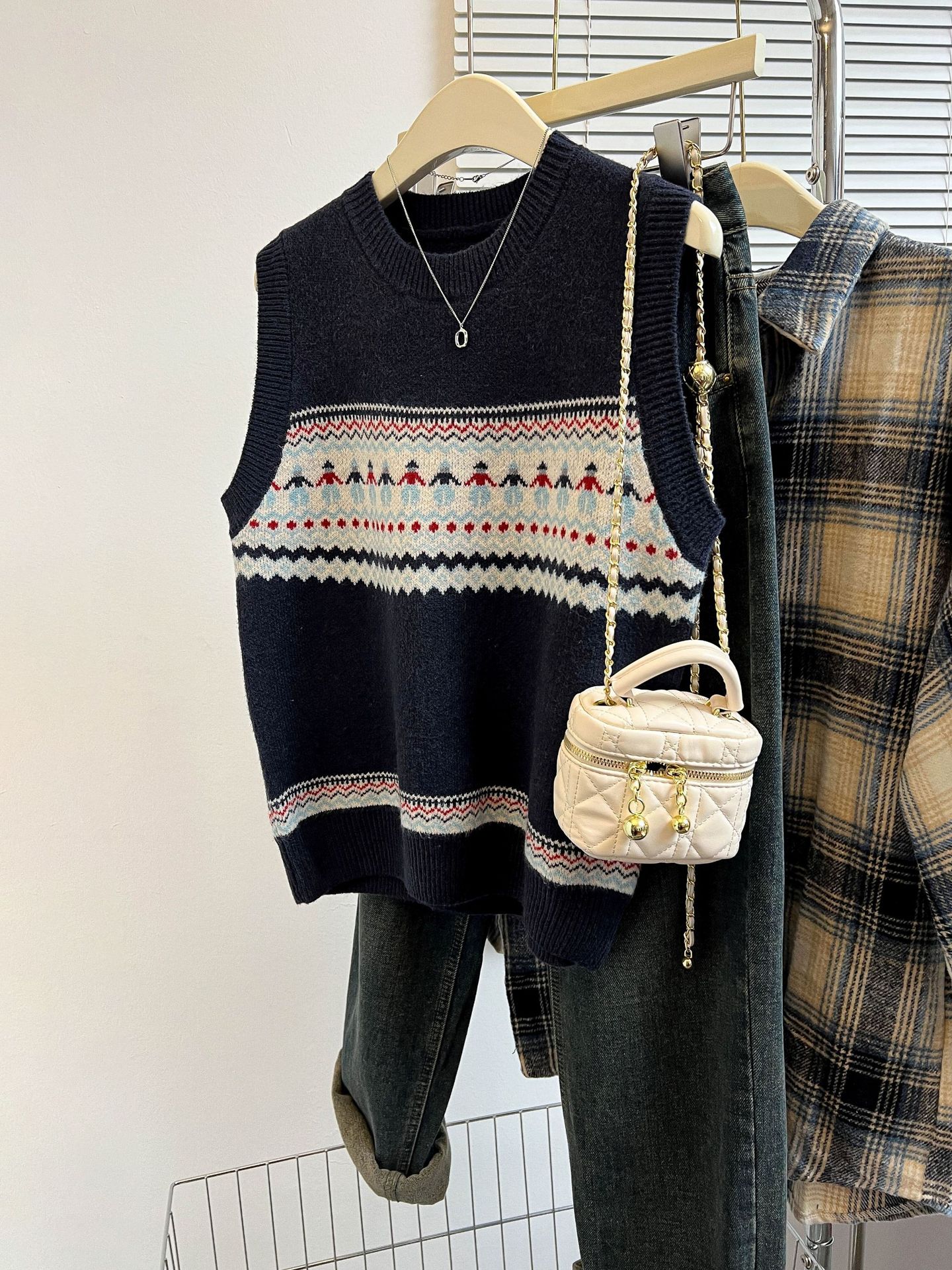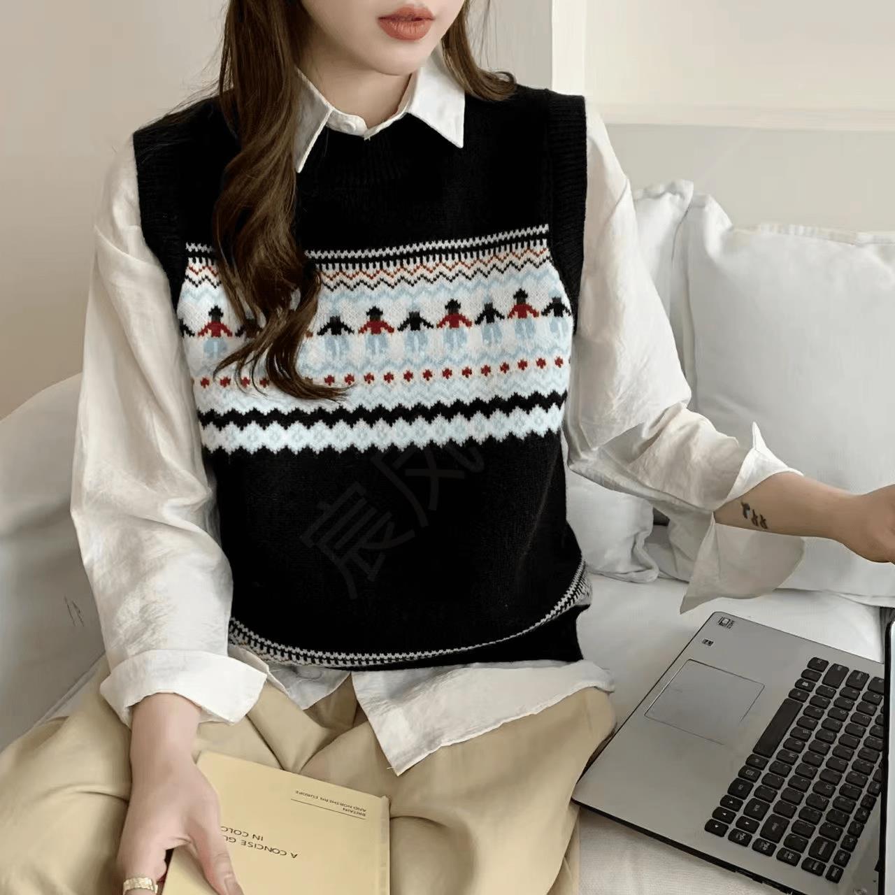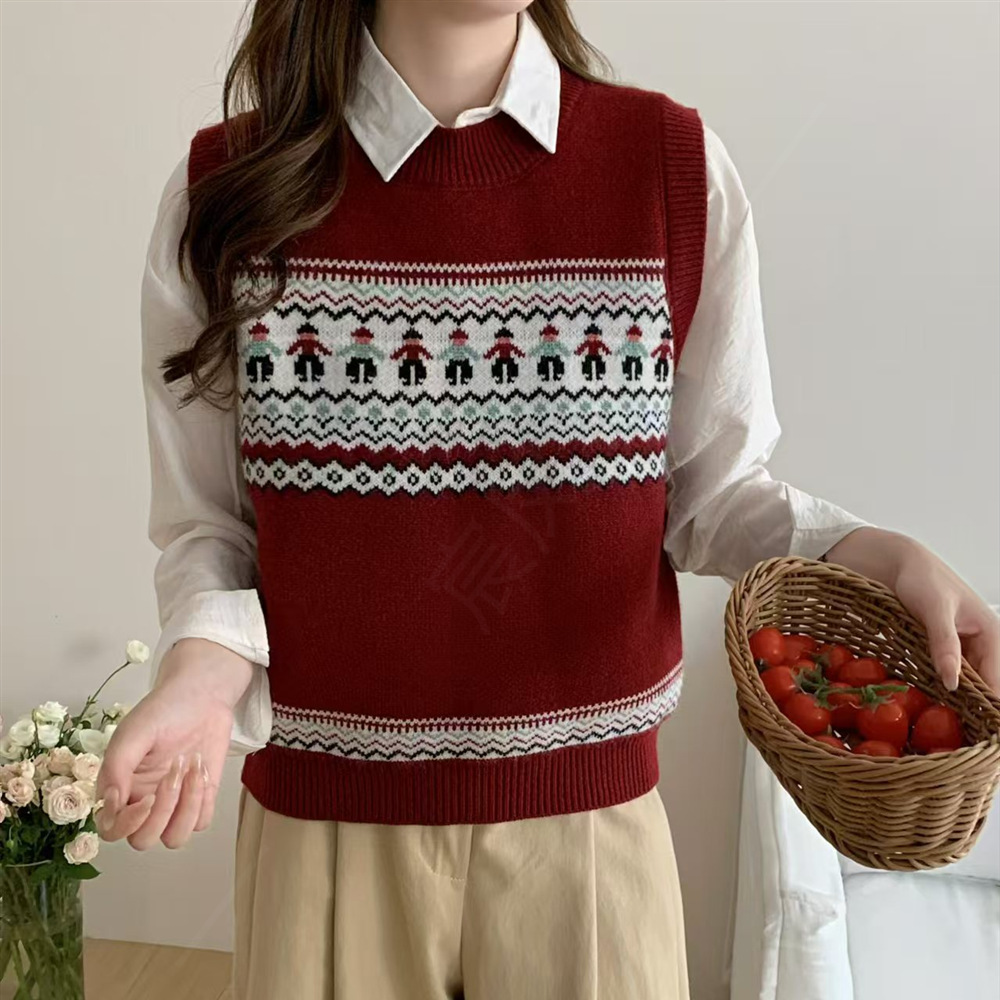 봄과 가을 복고풍 간단한 한국 스타일 대비 색상 니트 조끼, 세련된 겉옷, 여성용 다용도 라운드 넥 스웨터 조끼스토어 가기