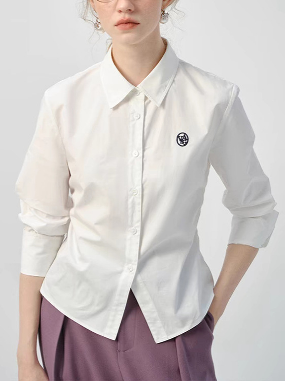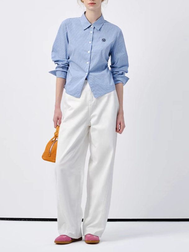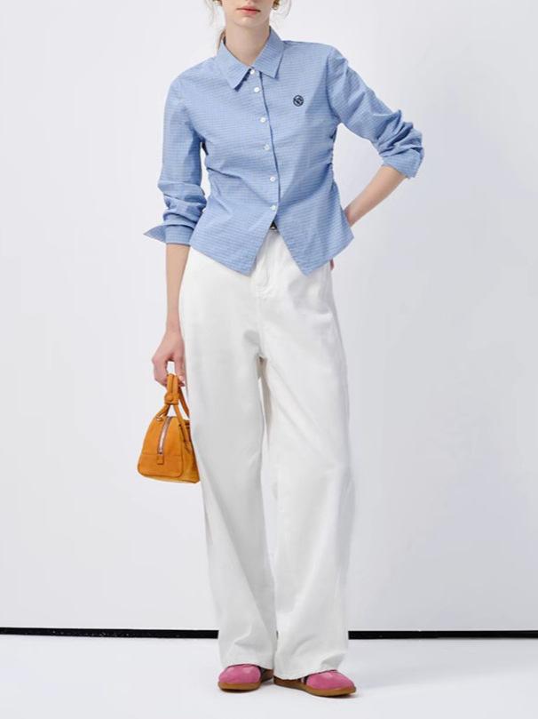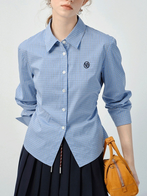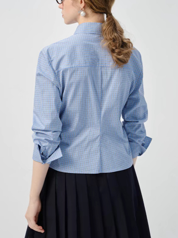 베가 블루 셔츠 여성 2025 가을 새로운 허리 프렌치 슬림 긴팔 체크 무늬 탑스토어 가기