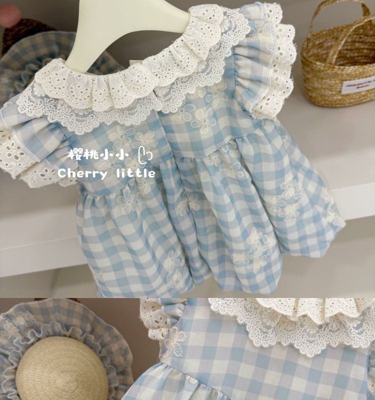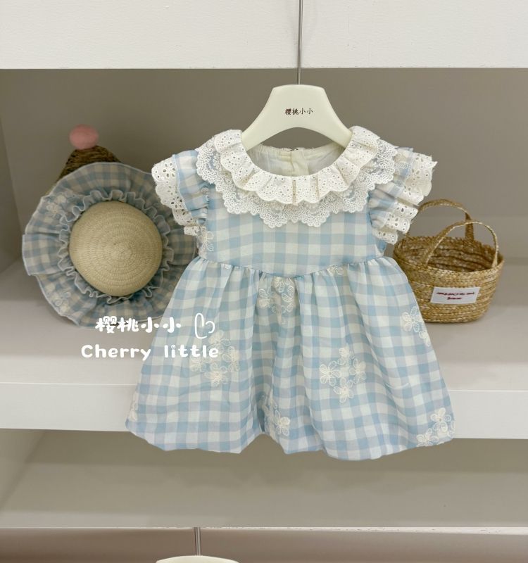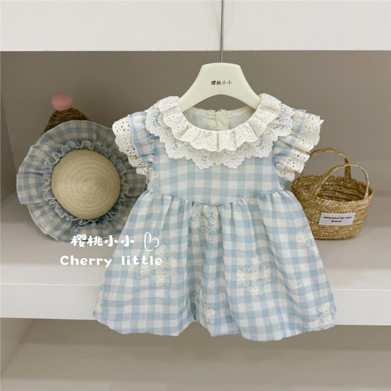 (무료 모자) 여아 2025 새로운 여름 스타일 여아 파란색과 흰색 격자 무늬 레이스 버드 드레스 인형 칼라스토어 가기