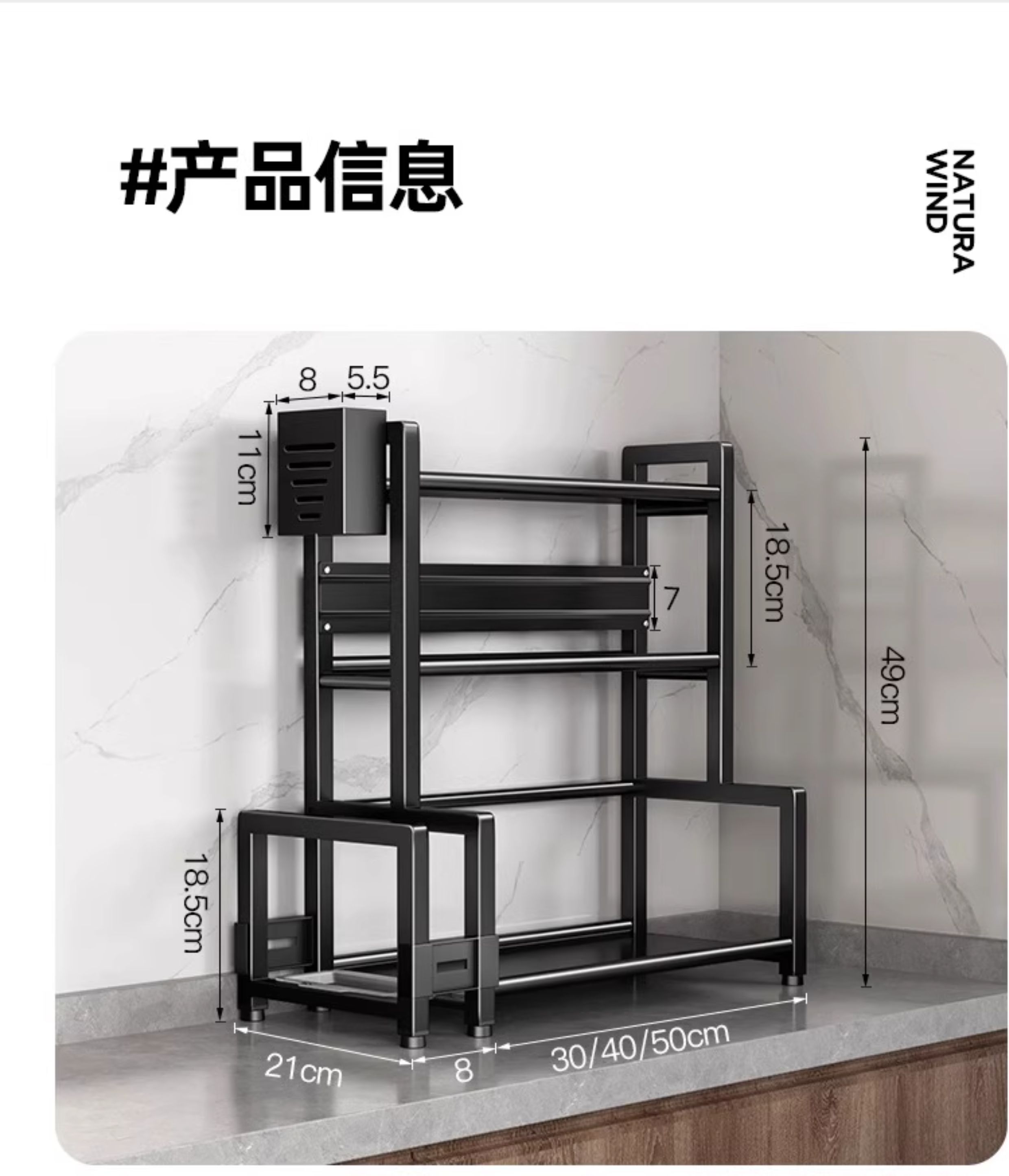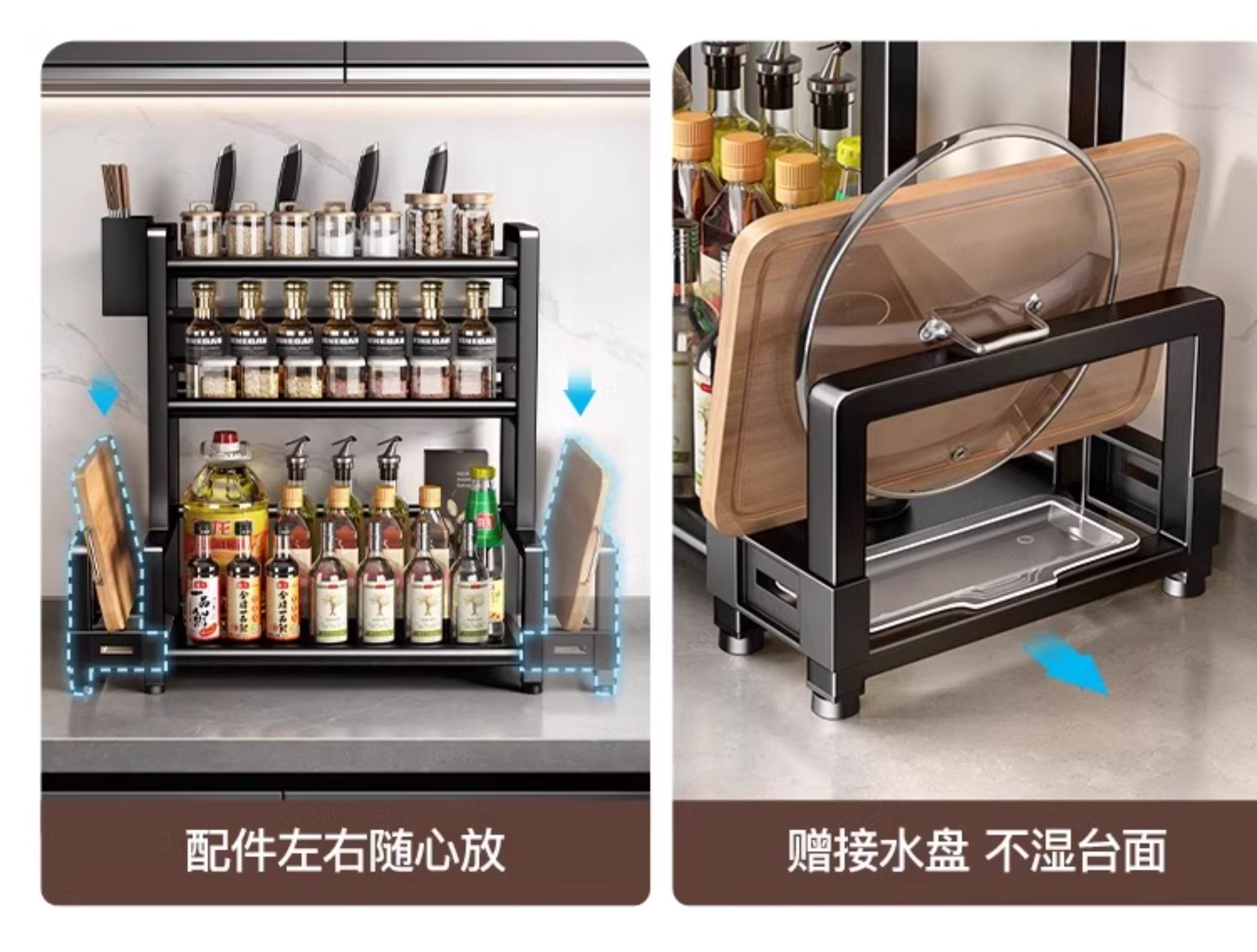 • [블록 블레이드가 있는 굵은 검정색 3단 50] 양념통 + 칼꽂이 + 젓가락통 + 도마걸이 + 후크 6개, 나사 없는 설치