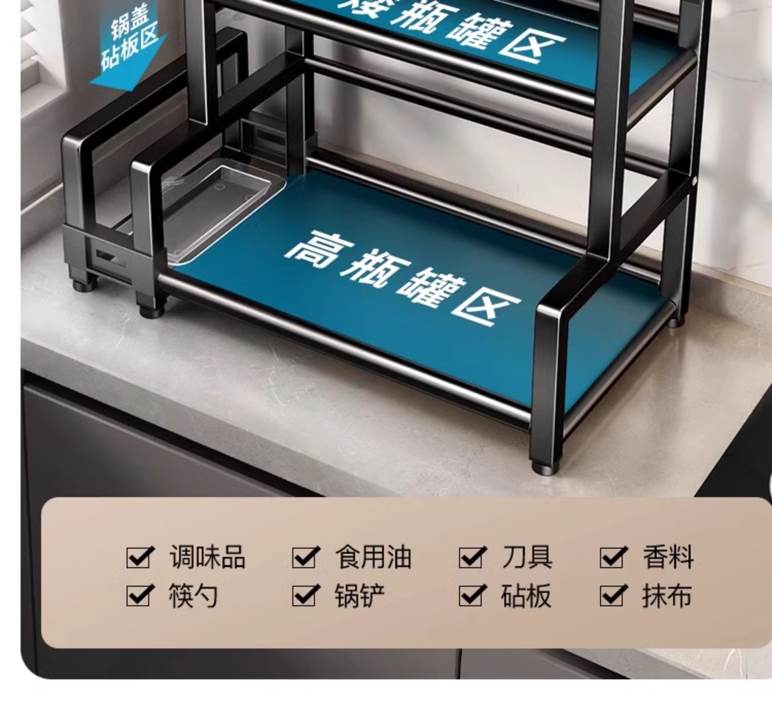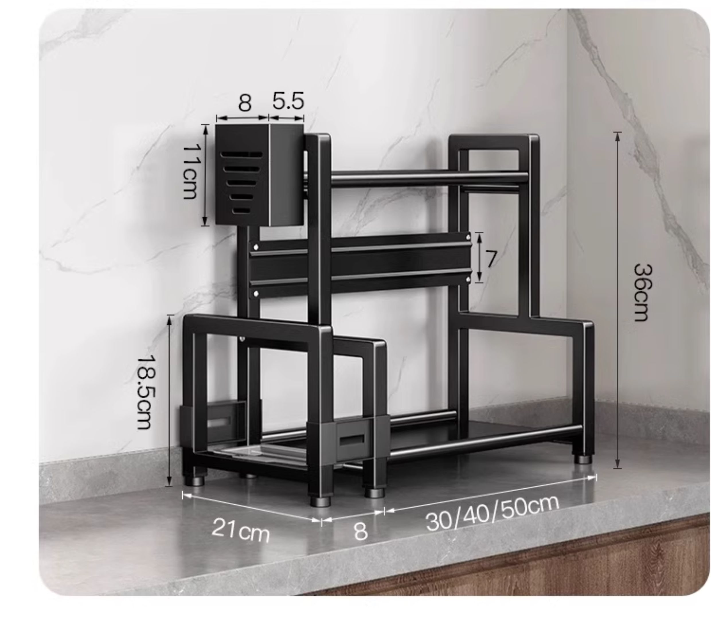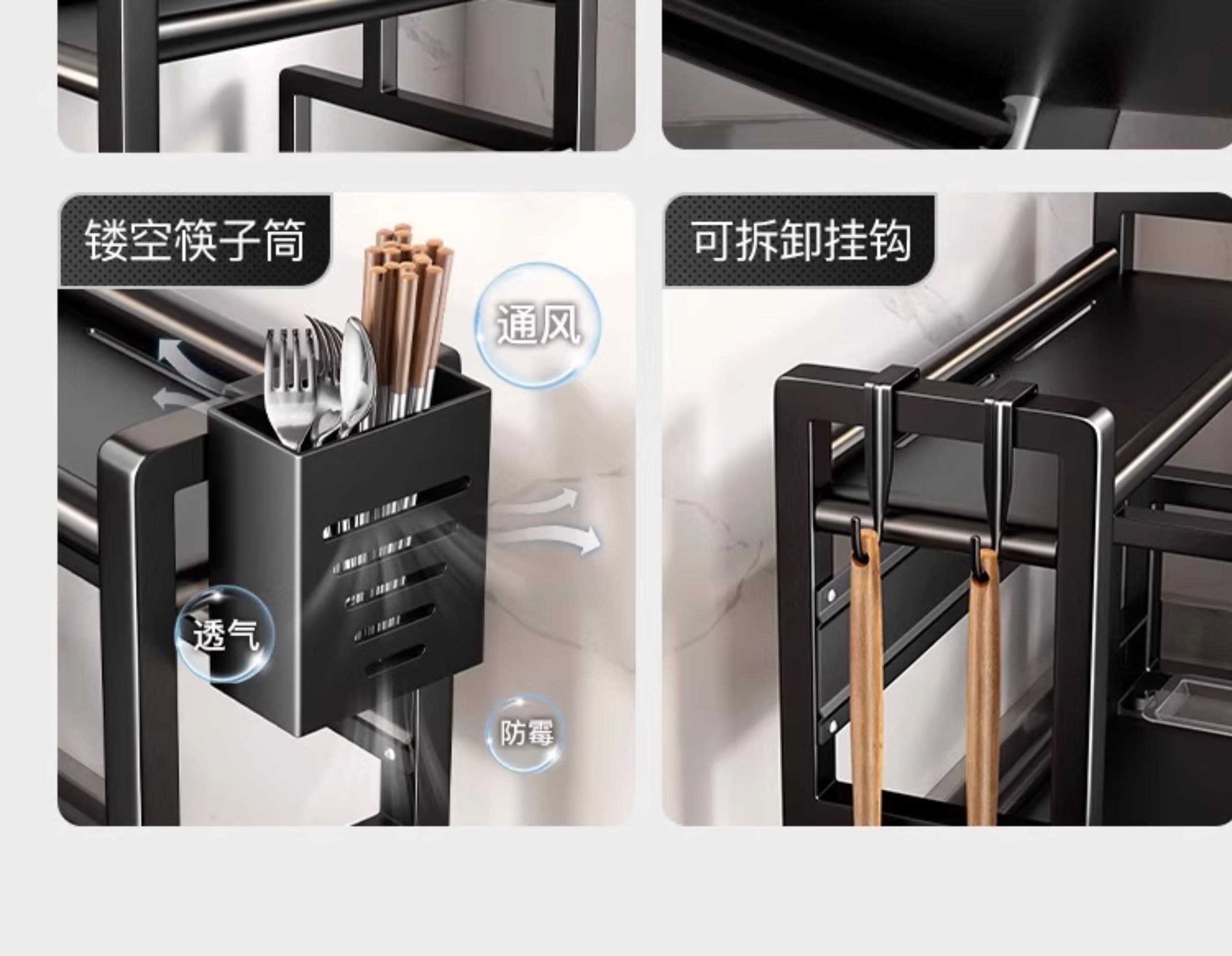 • [블랙 두꺼운 2층 칼 가드 포함 50] 양념통 + 칼 꽂이 + 젓가락 꽂이 + 도마 꽂이 + 후크 6개, 나사 없이 설치 가능