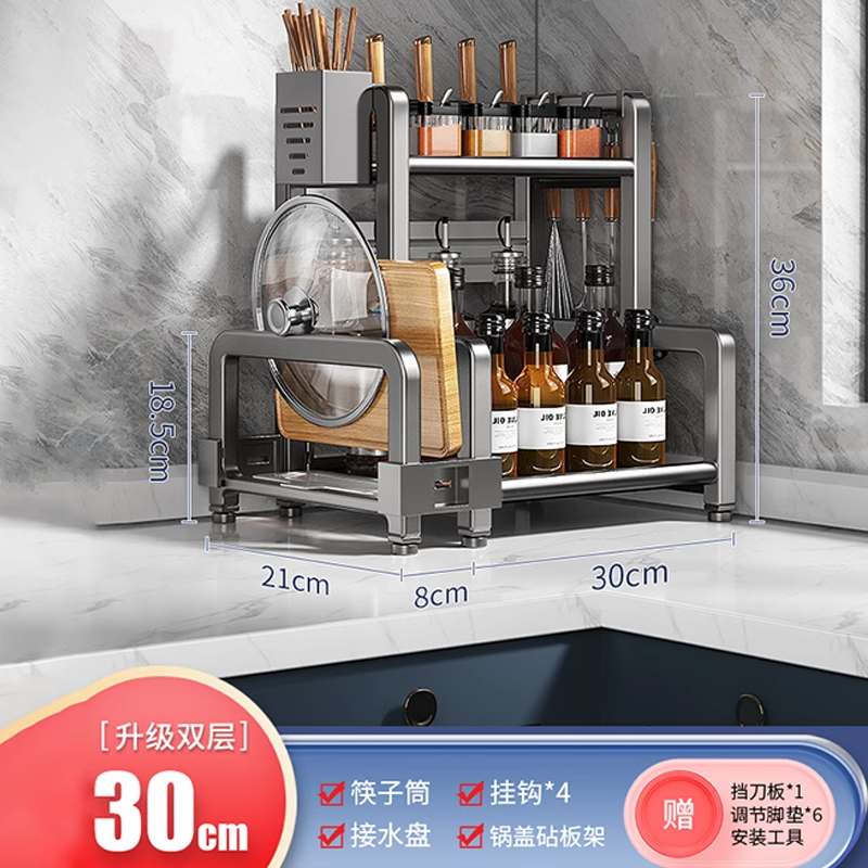 • [볼드건그레이 2층 30 칼가드 포함] 양념걸이 + 칼꽂이 + 젓가락통 + 도마걸이 + 후크 6개, 나사없는 설치