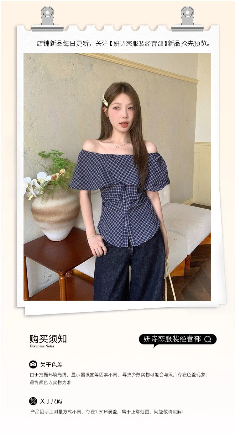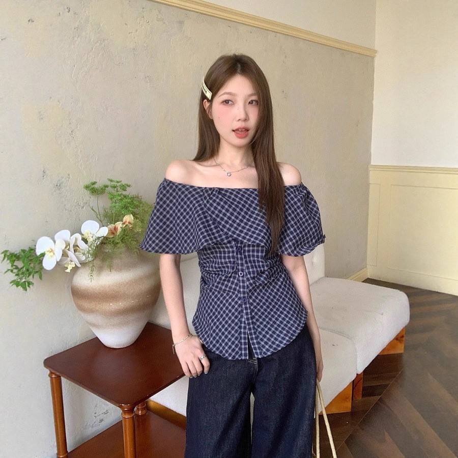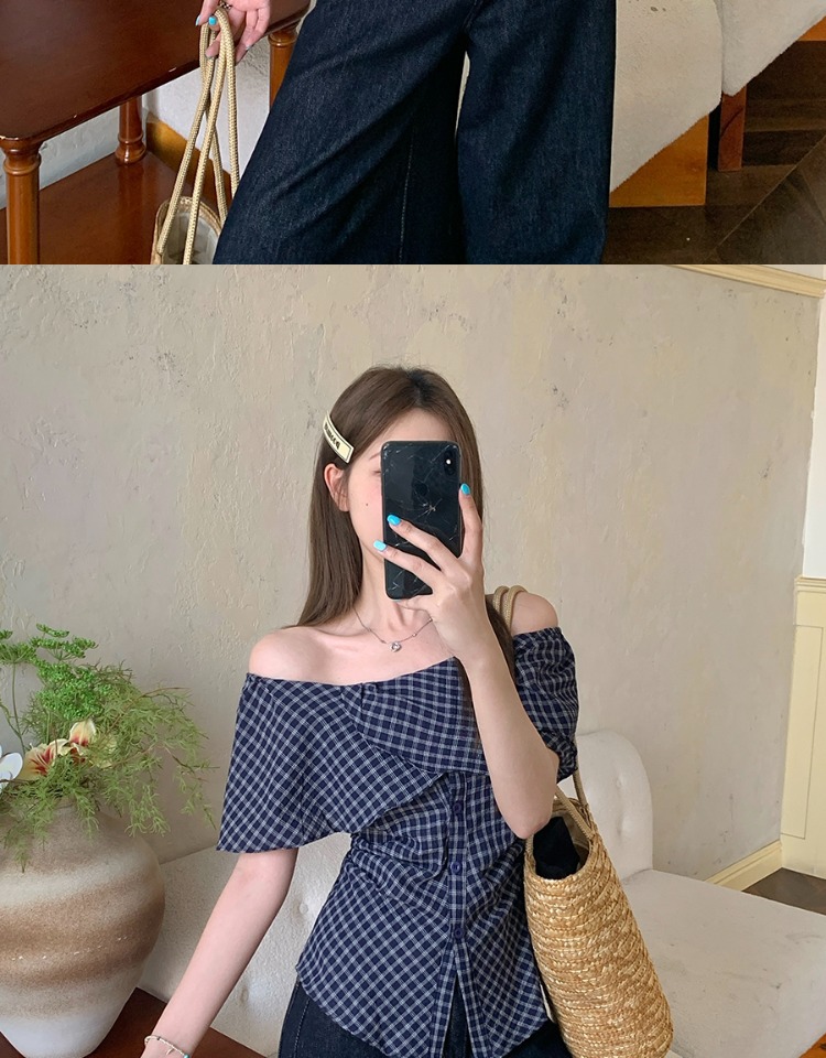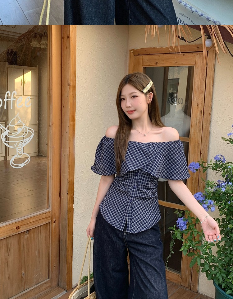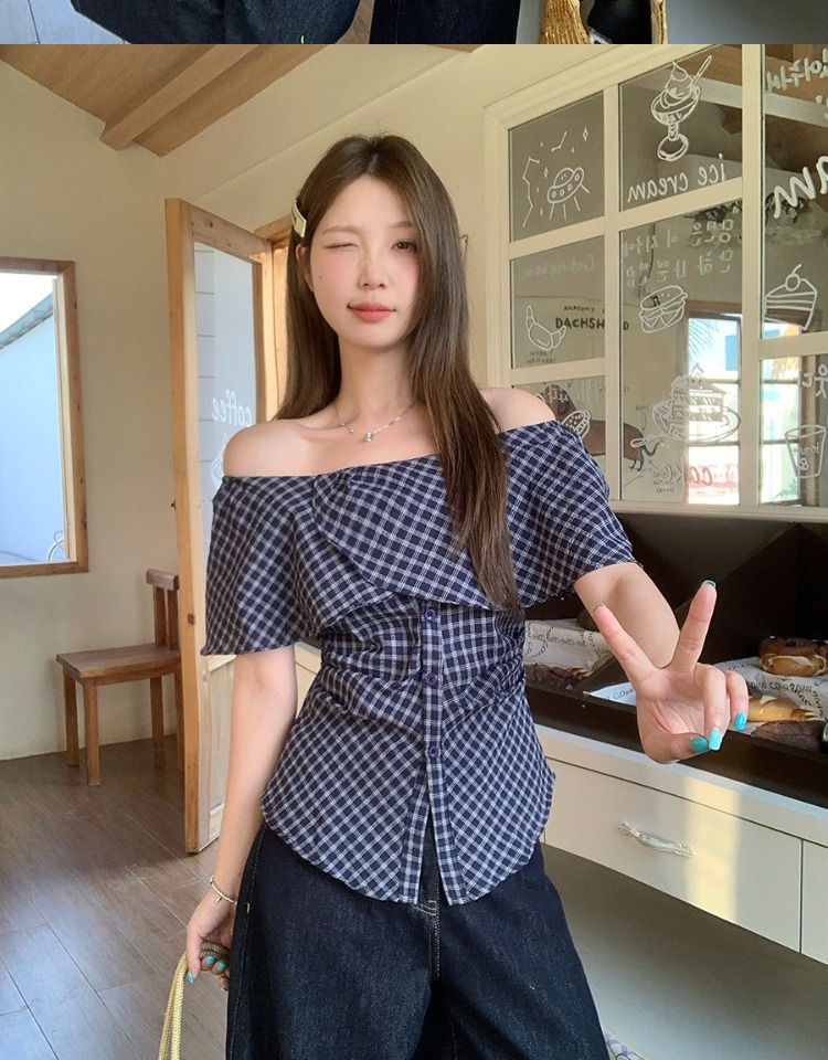한국식 원숄더 체크무늬 허리 주름 체크무늬 셔츠 여성 여름 디자인 슬림핏 오프숄더 탑스토어 가기