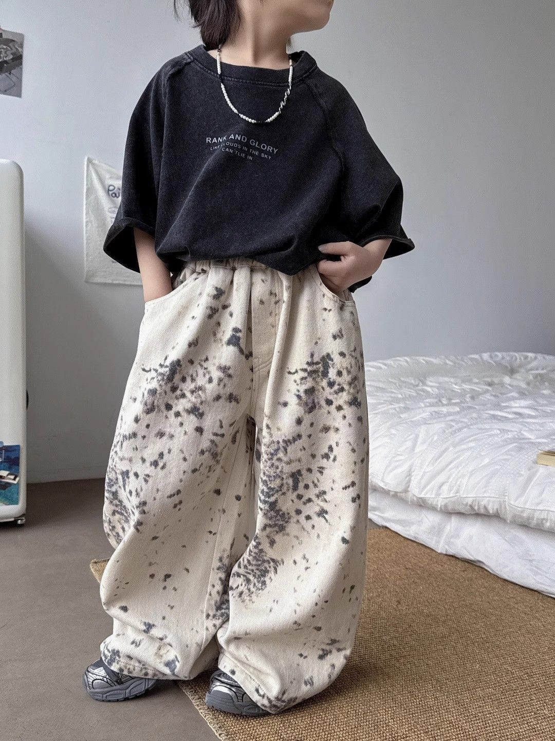 봄 소년 레오파드 청바지 2025 새로운 어린이 느슨한 넓은 다리 스트레이트 바지 봄 청바지 잘 생긴 스타일