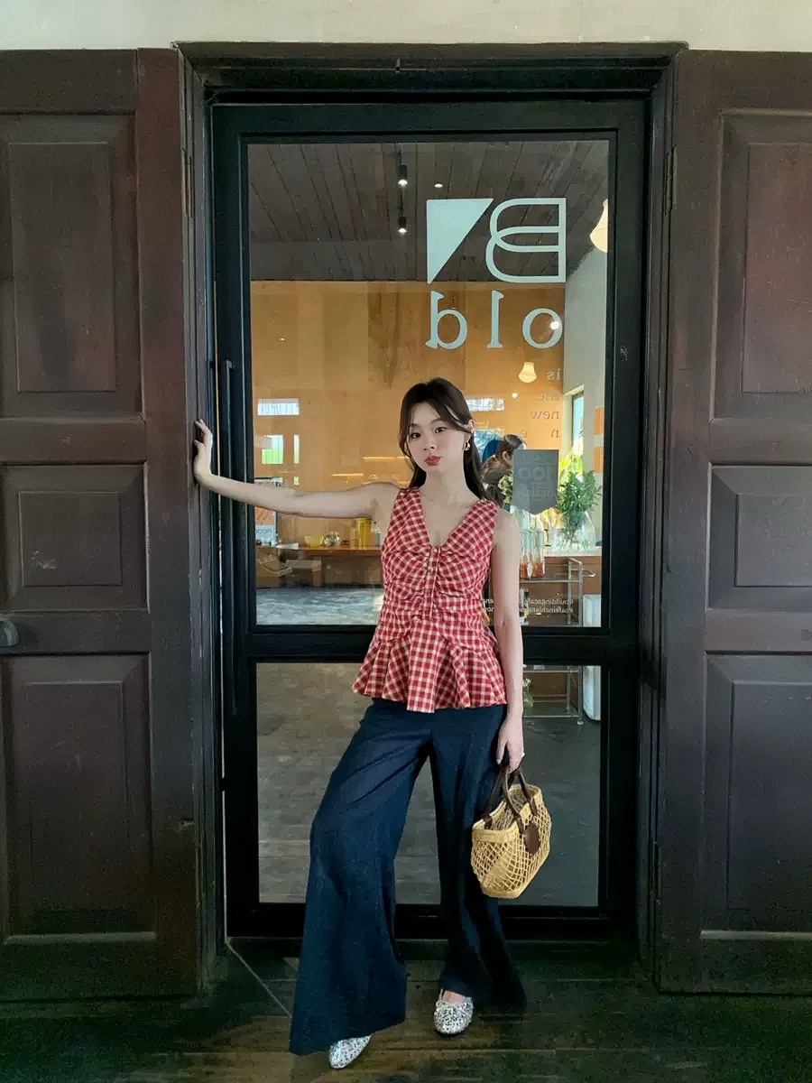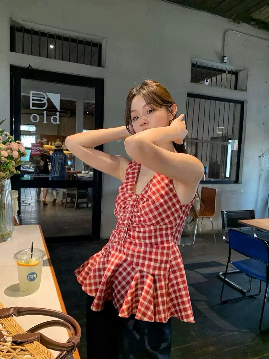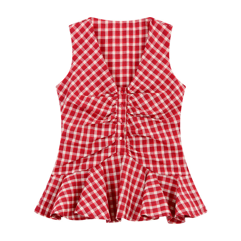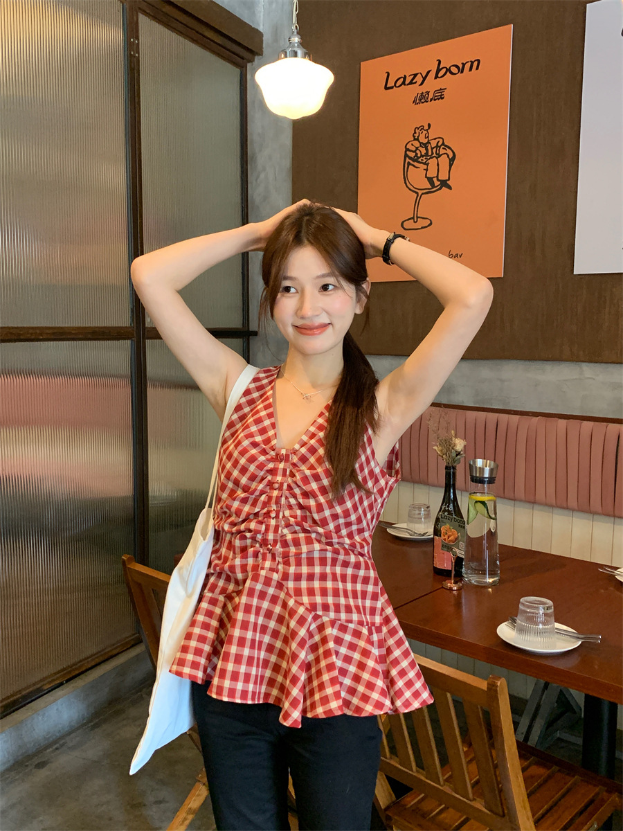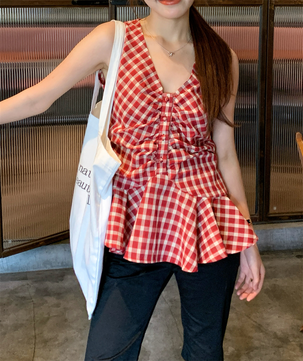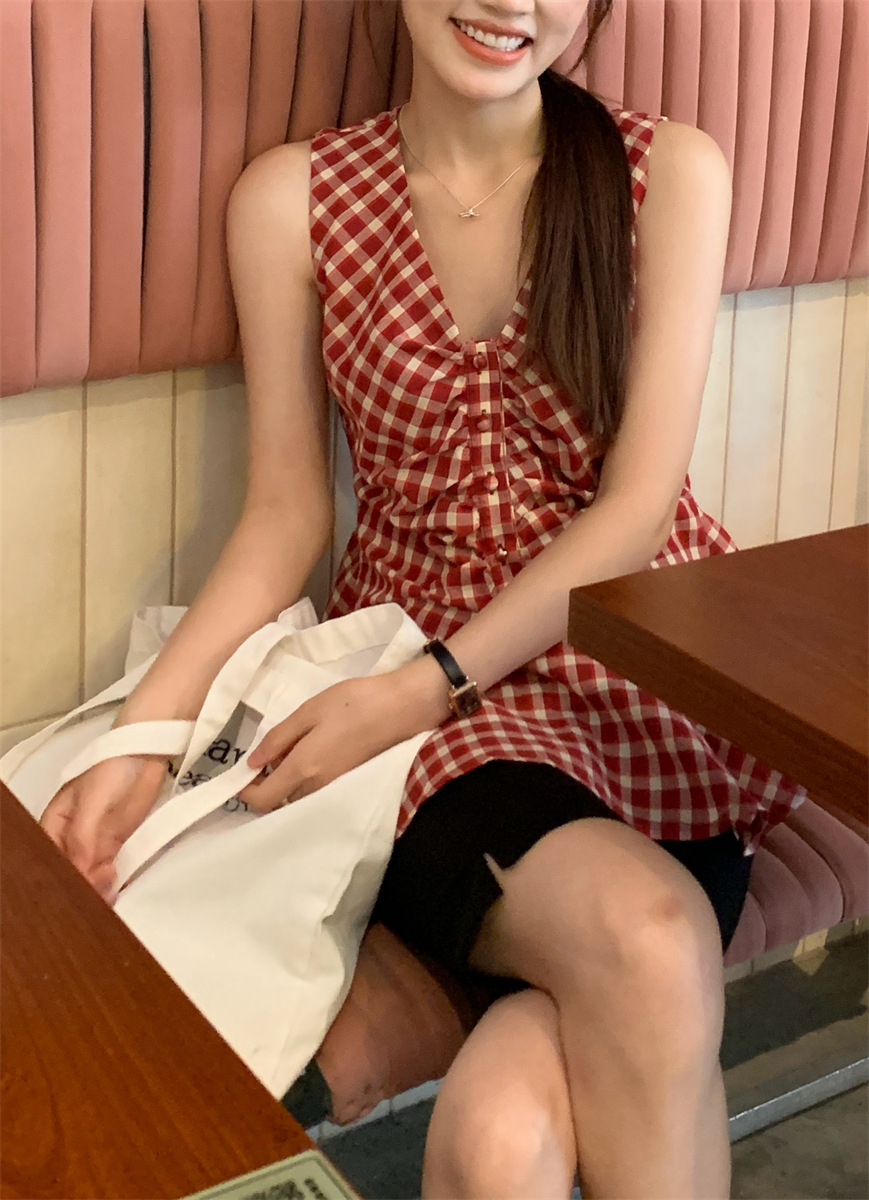레트로 홍콩 스타일 붉은 격자 무늬 v 넥 캐미솔 여성 여름 틈새 연령 감소 다목적 슬리밍 민소매 탑스토어 가기