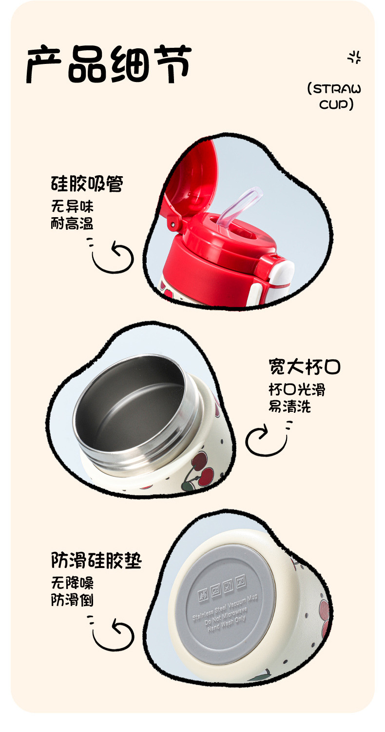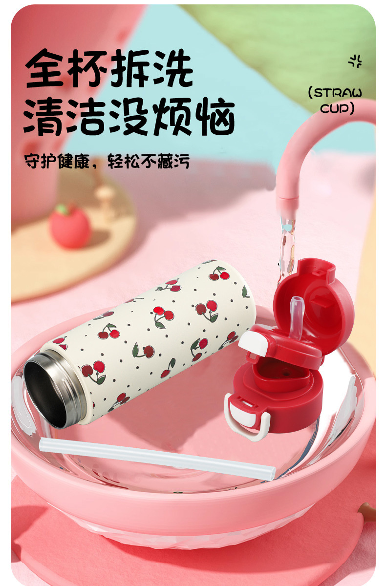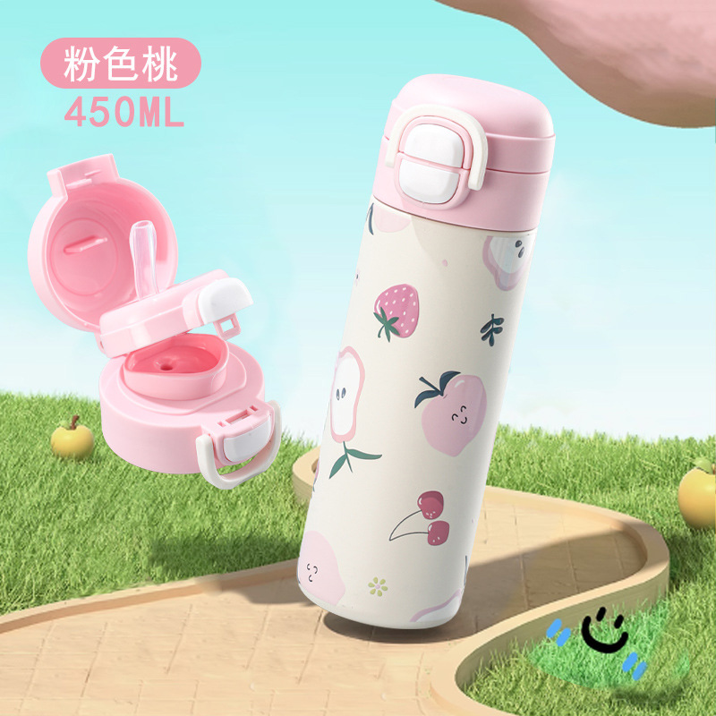 귀여운 학생 만화 보온병 컵, 학교용 휴대용 물컵, 간단한 스테인레스 스틸 팝업 커버, 이중 마시는 빨대 컵