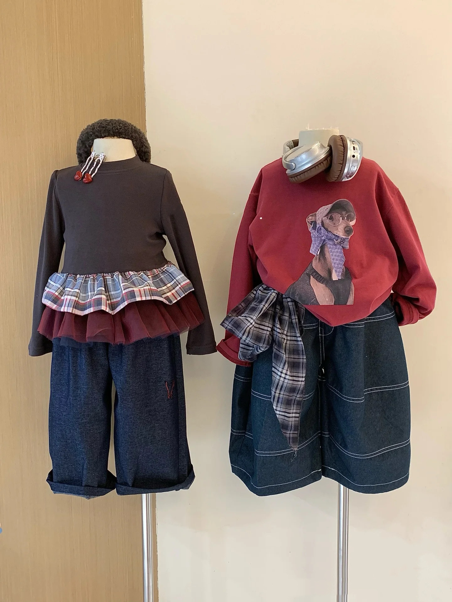 2025秋季中大女童拼接蕾丝花边牛仔裤中裤长裤设计感喇叭裤阔腿裤
