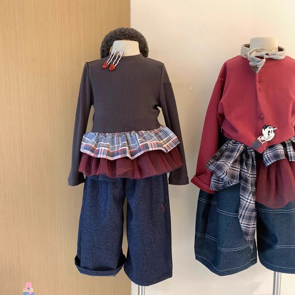 초가을 한국식 심플 스타일 체크 무늬 스플라이싱 가짜 투피스 긴팔 여아 상의 2025 여아용 새 아우터웨어