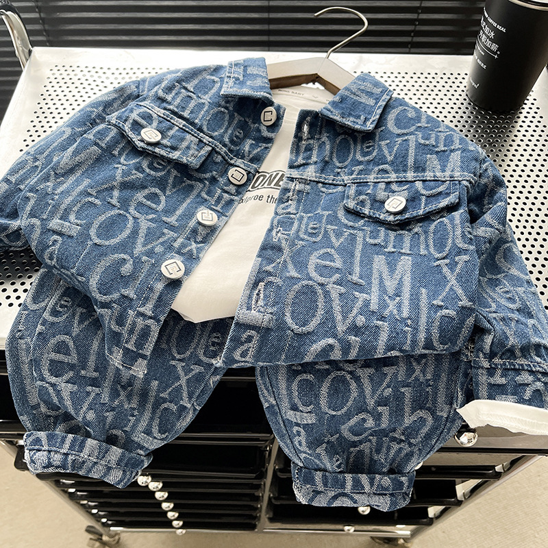소년 봄, 가을 정장 2025 새로운 잘 생긴 어린이 알파벳 데님 3 피스 세트 아기 봄, 가을 옷 유행스토어 가기