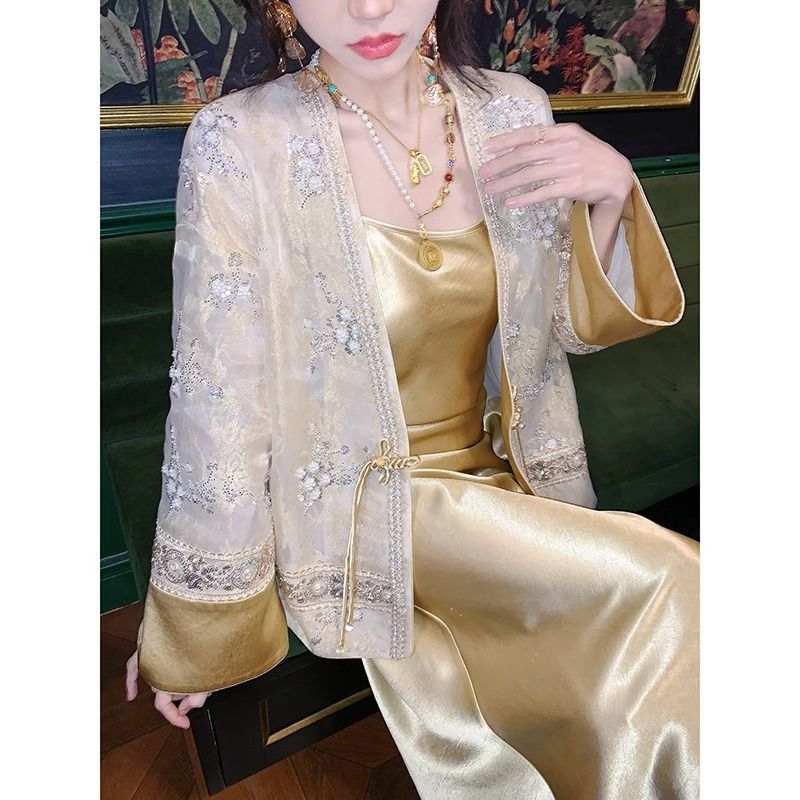 새로운 중국 스타일 투피스 슈트, 기질 자수, 골동품 자카드 짧은 코트, 긴팔 여성용 봄 서스펜더 드레스스토어 가기