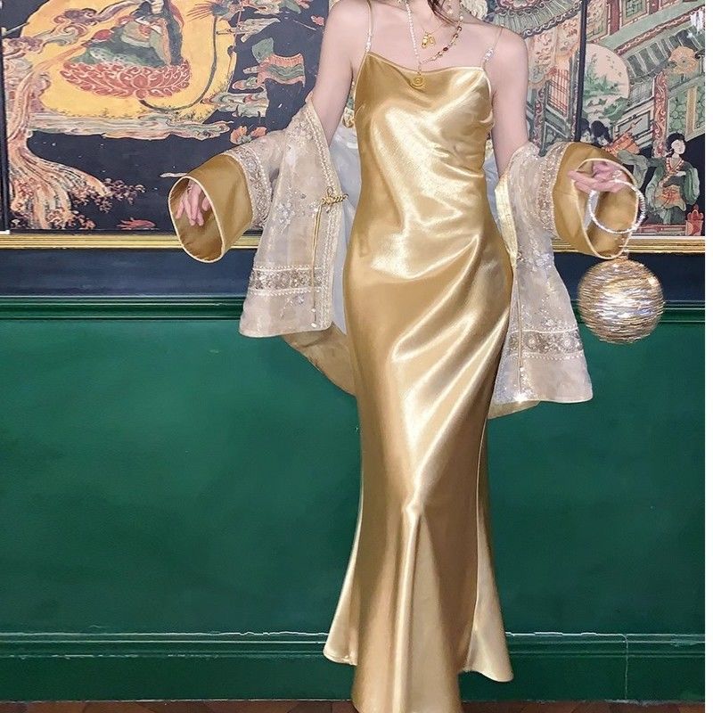 새로운 중국 스타일 투피스 슈트, 기질 자수, 골동품 자카드 짧은 코트, 긴팔 여성용 봄 서스펜더 드레스