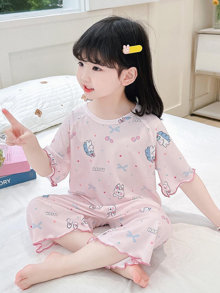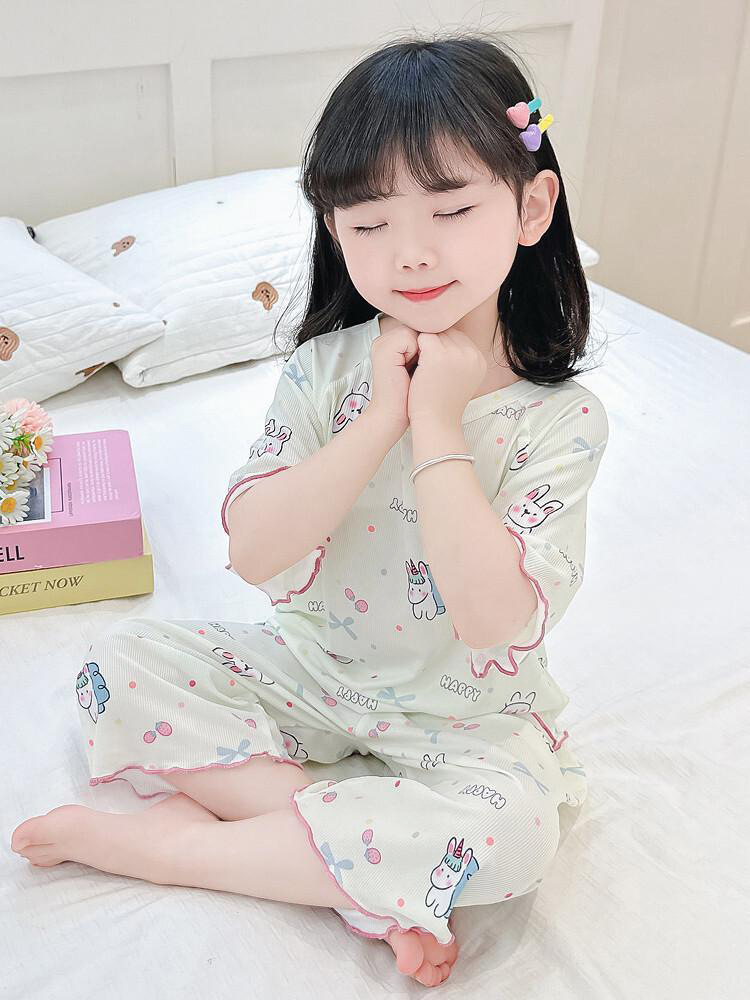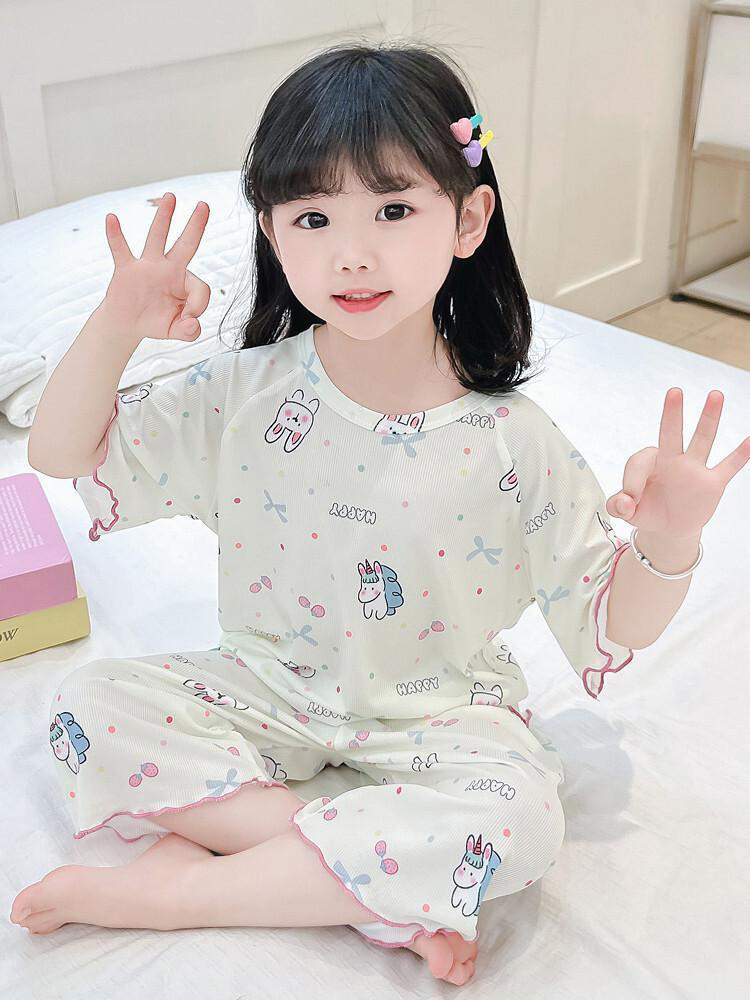 여자 잠옷 여름 정장 얇은 7 점 아기 반팔 새로운 에어컨 옷 어린이 얼음 실크 여자 가정 옷