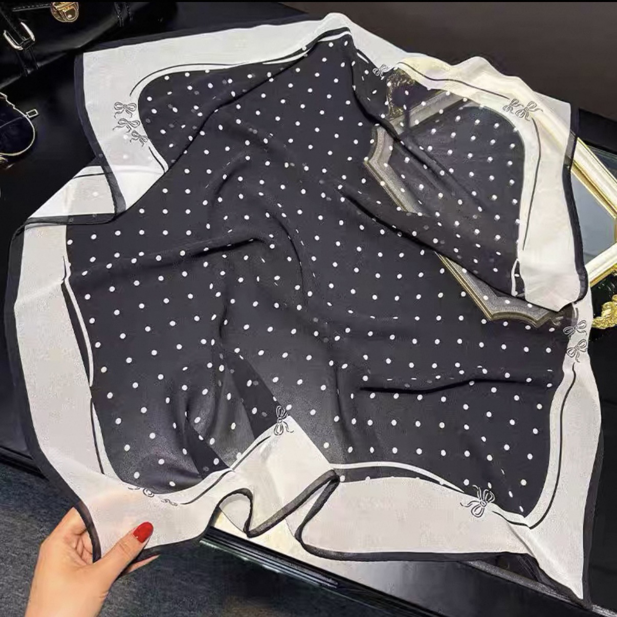 • 65*65cm [실크 크레이프드신] 동백땡땡이 블랙