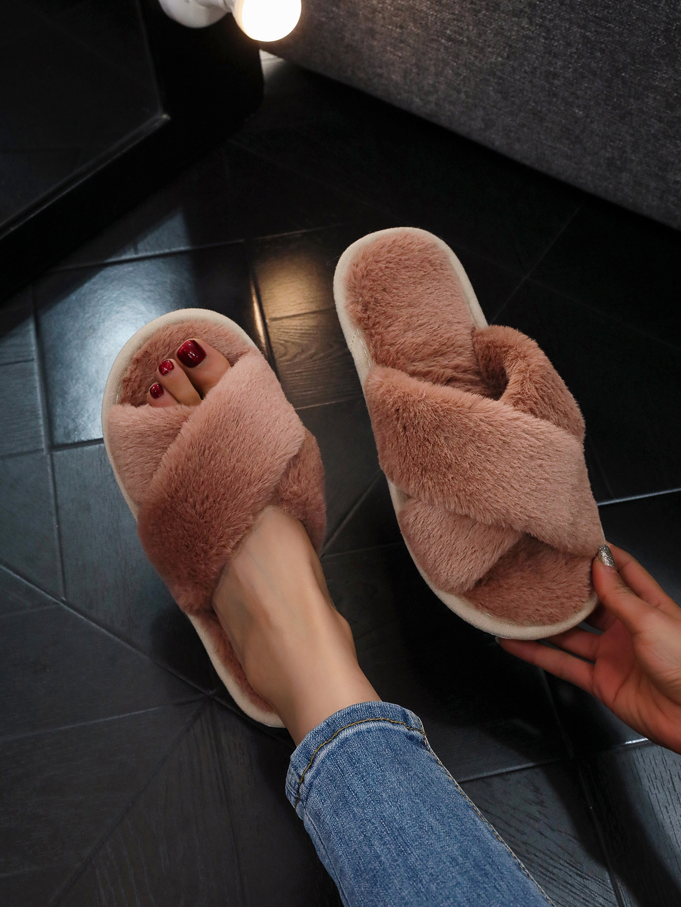 크로스 스트랩 여성용 털 슬리퍼 오픈토 슬리퍼 홈용 여성용 따뜻한 면 슬리퍼스토어 가기