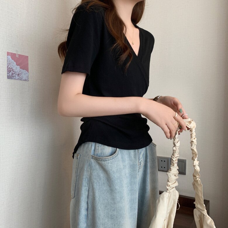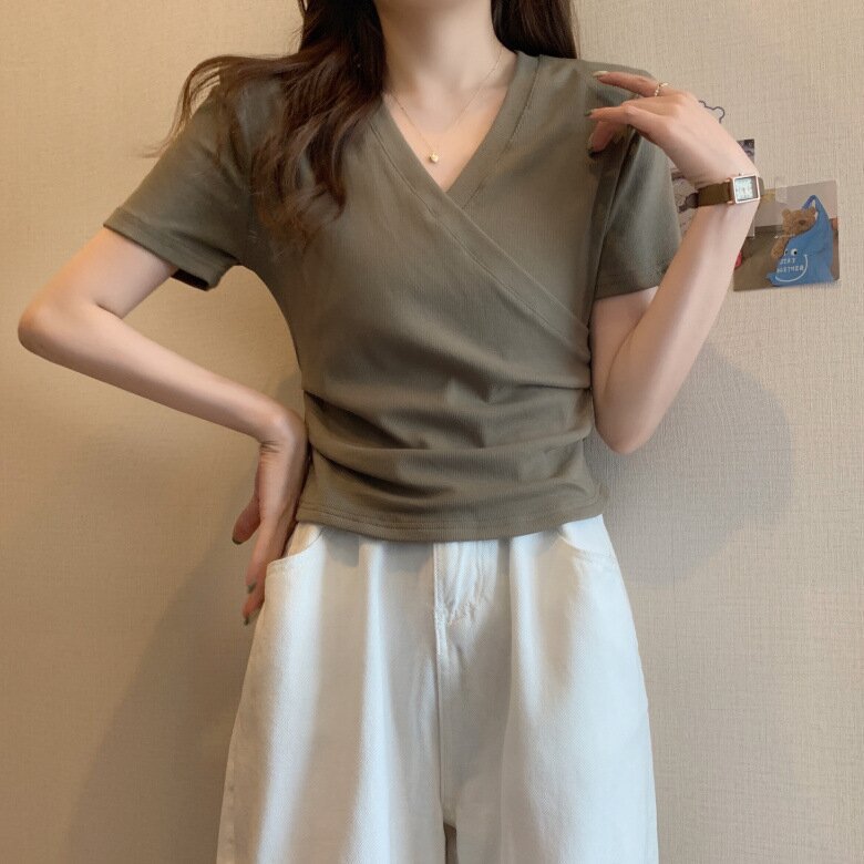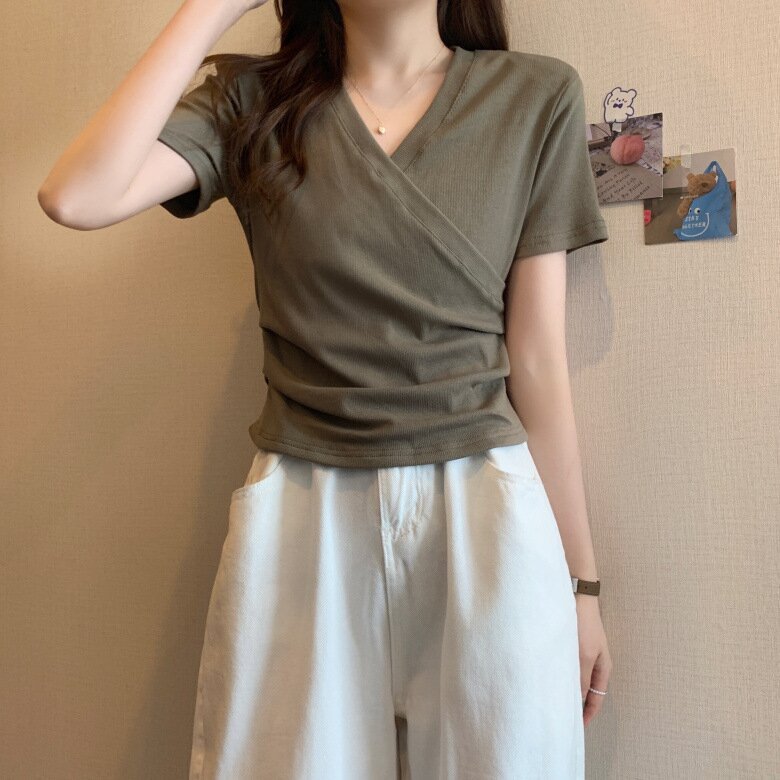 여성용 크로스 브이넥 반팔 티셔츠 2025 여름 새로운 디자인 슬림핏 짧은 학생 슬림핏 탑 트렌디스토어 가기