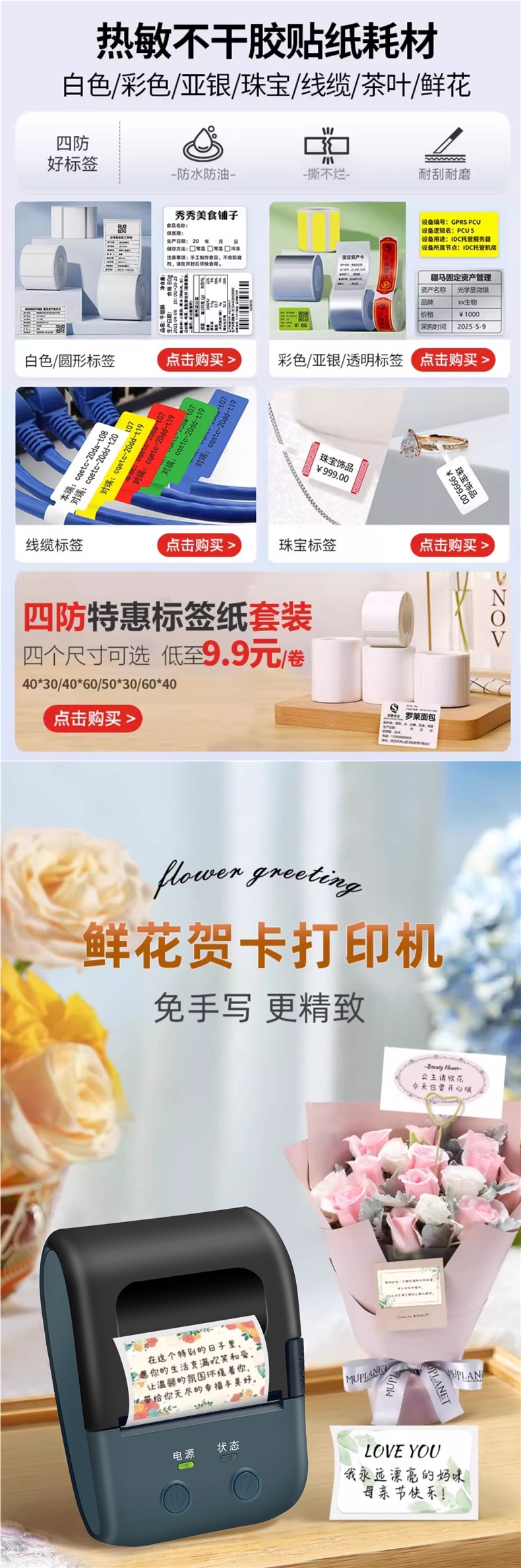 L7 꽃집 인사말 카드 프린터 작은 카드 생일 인사말 로고 아이콘 QR 코드 꽃 녹색 식물 유지 보수 파란색