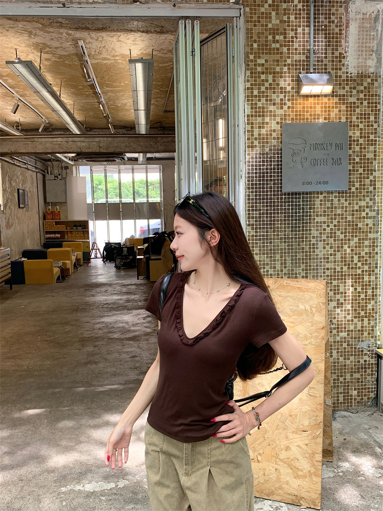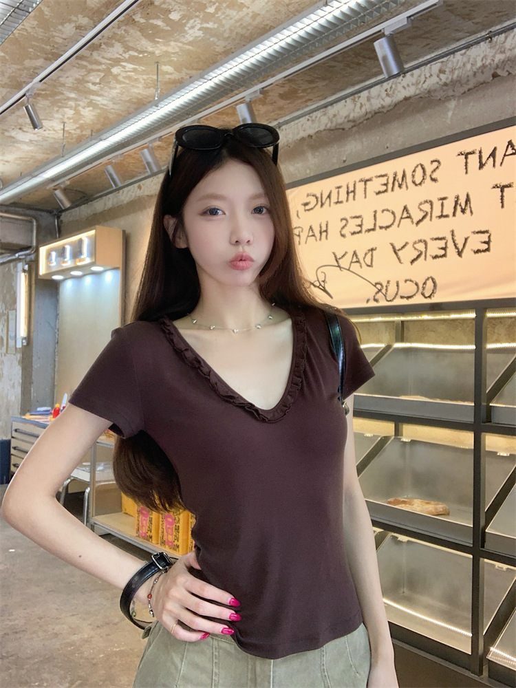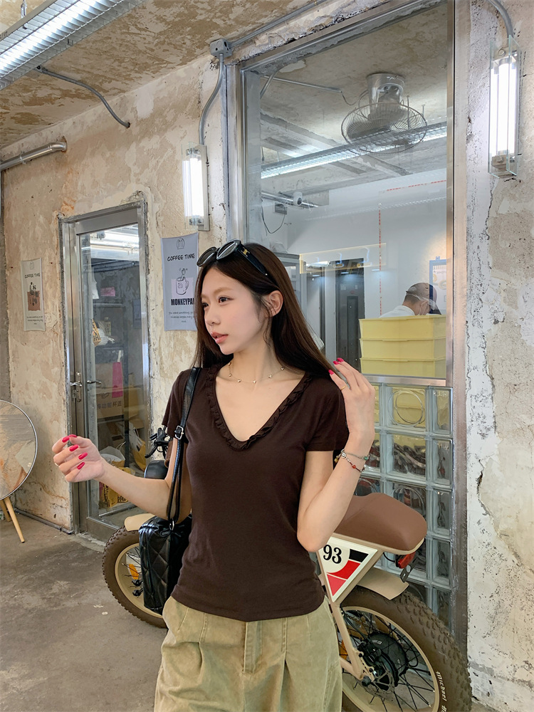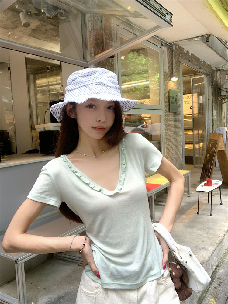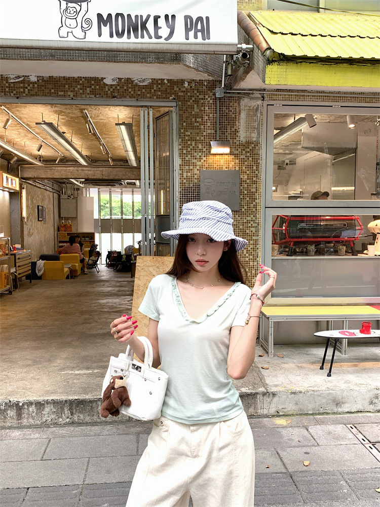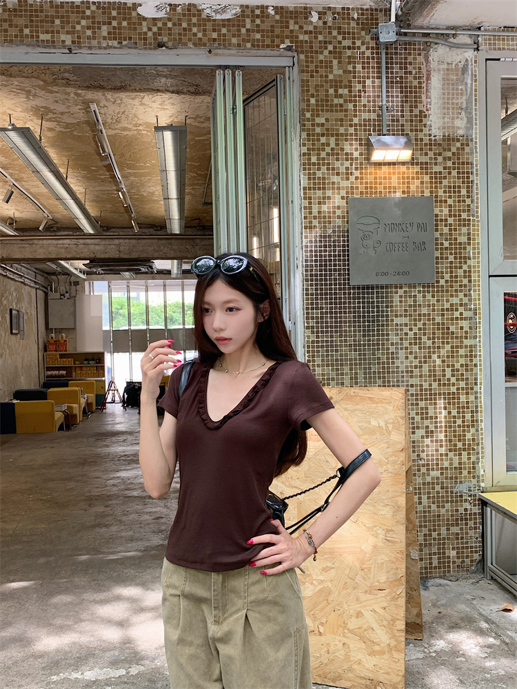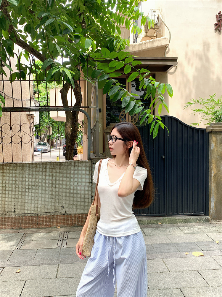 2025夏季新款纯欲轻薄花边V领修身显瘦微透舒适百搭短袖T恤上衣女스토어 가기
