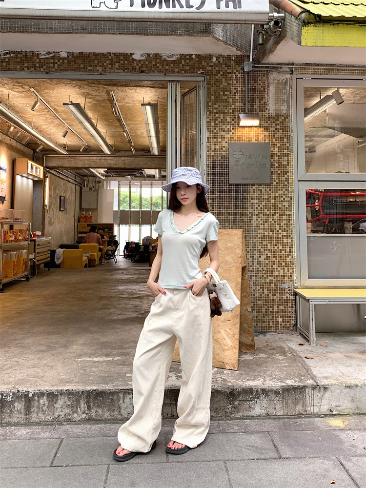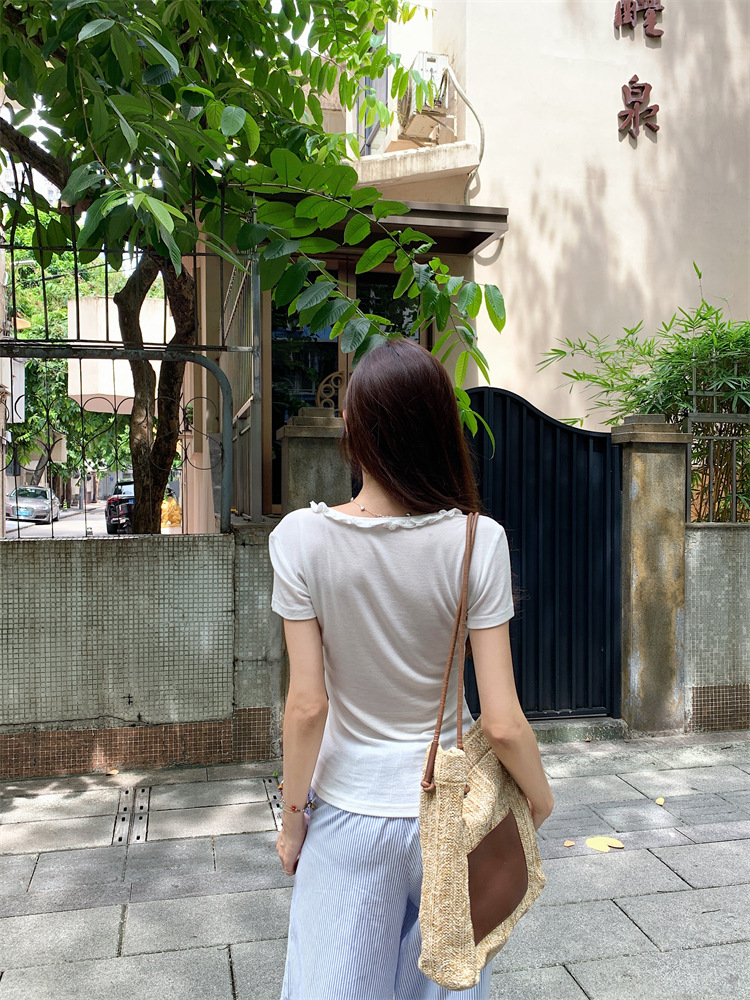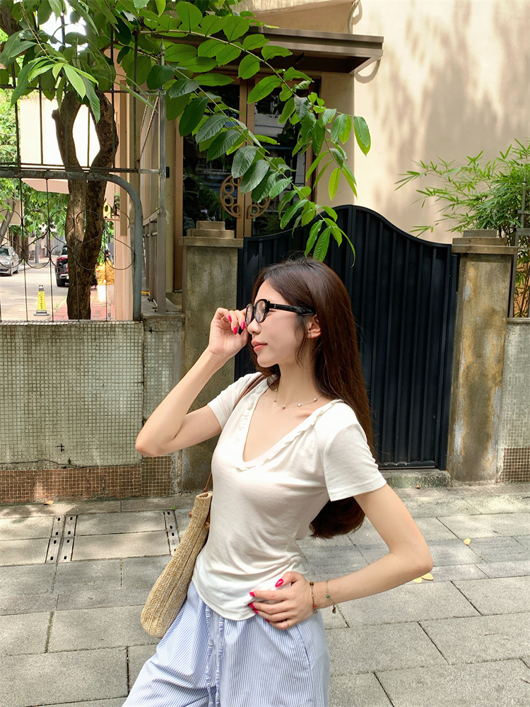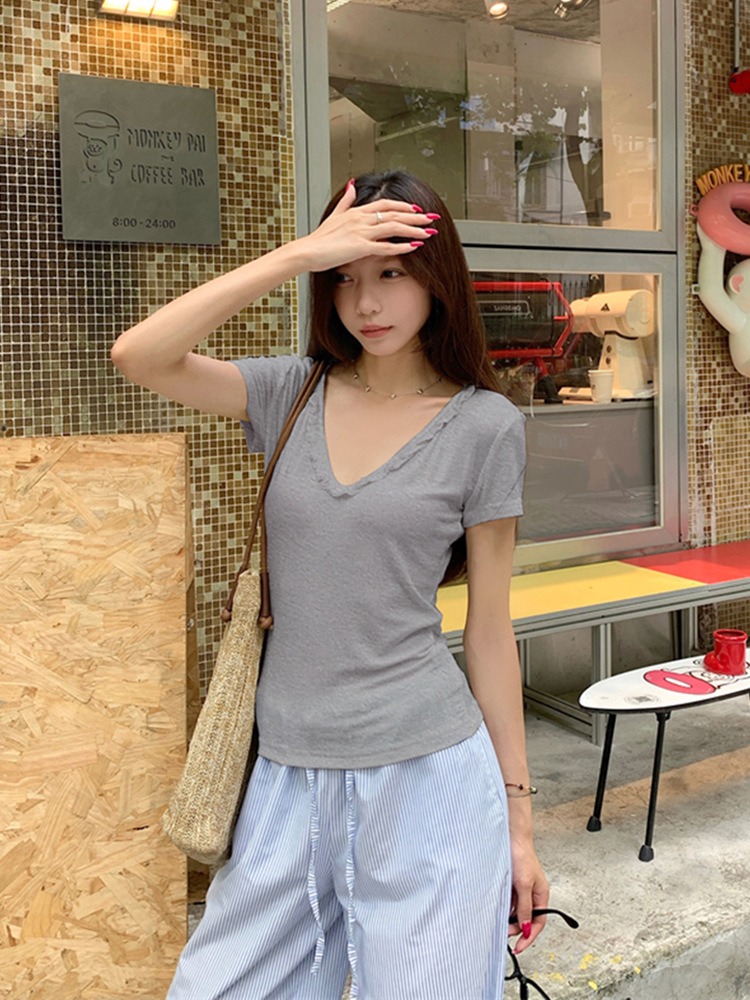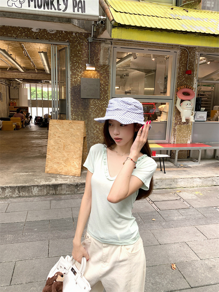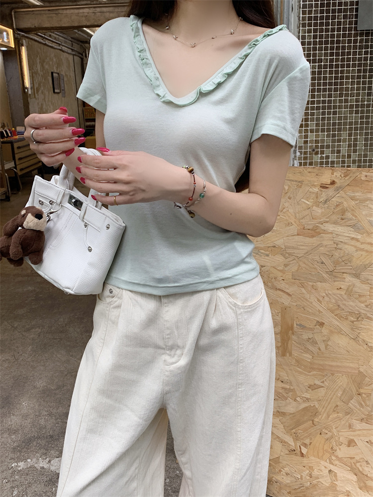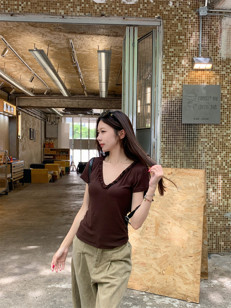 2025夏季新款纯欲轻薄花边V领修身显瘦微透舒适百搭短袖T恤上衣女스토어 가기