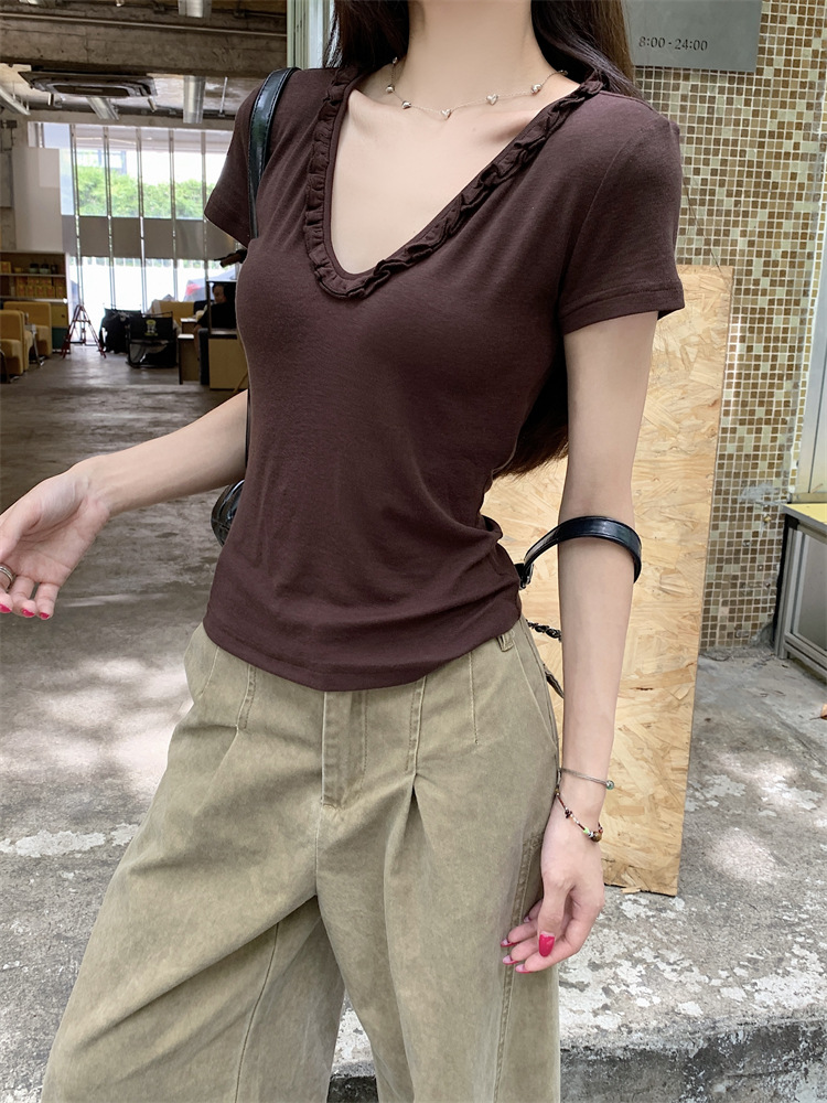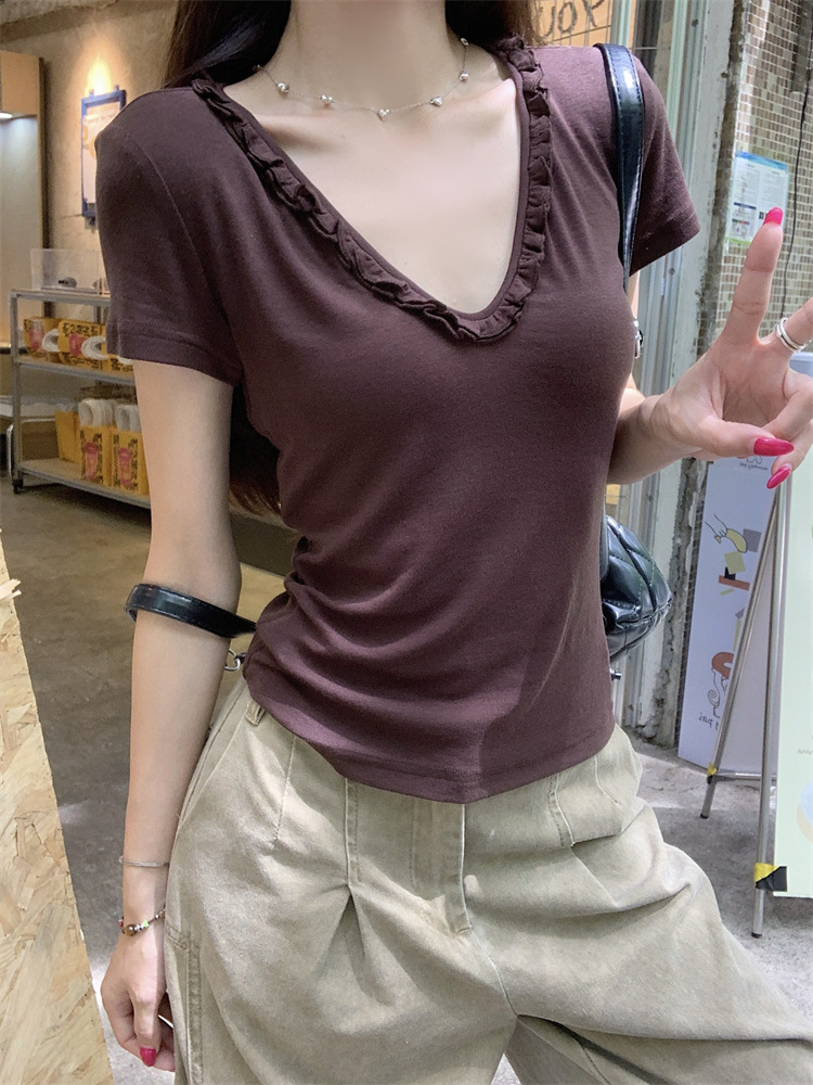 2025夏季新款纯欲轻薄花边V领修身显瘦微透舒适百搭短袖T恤上衣女