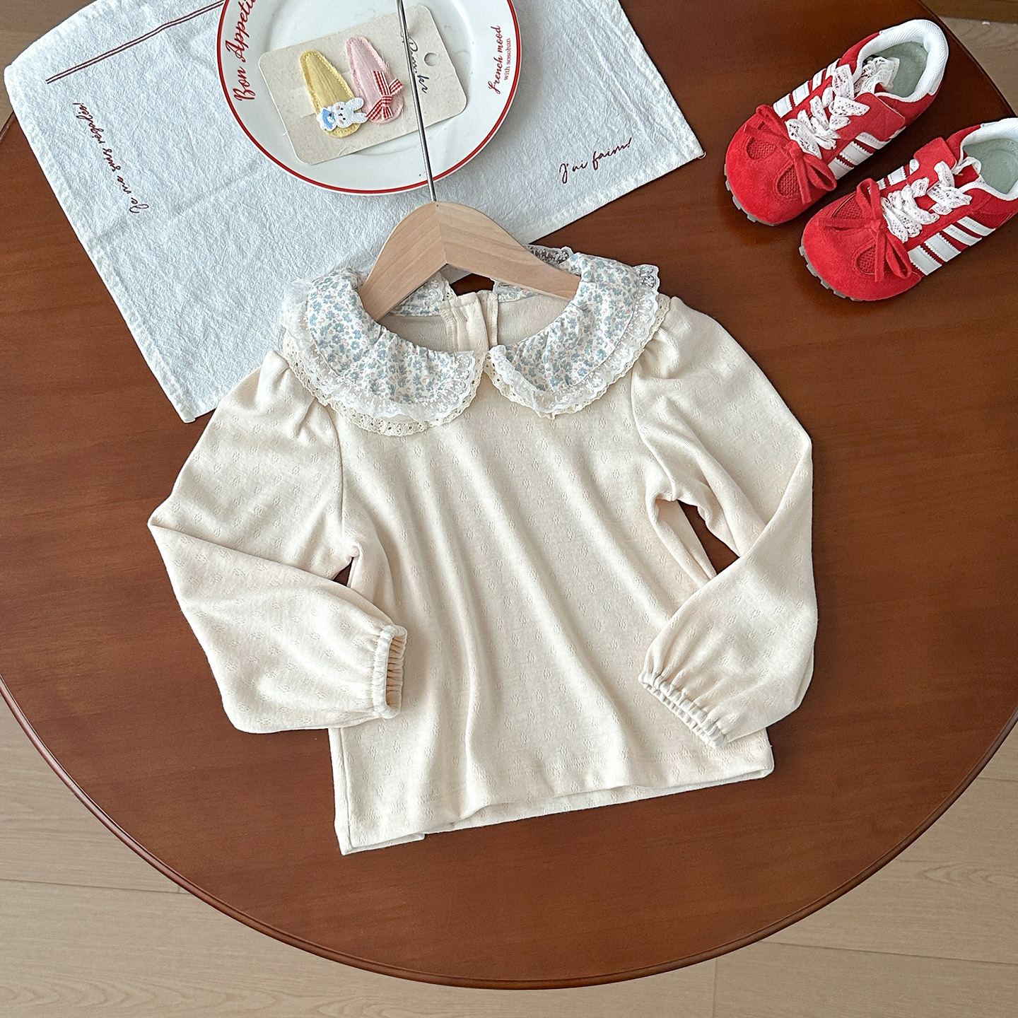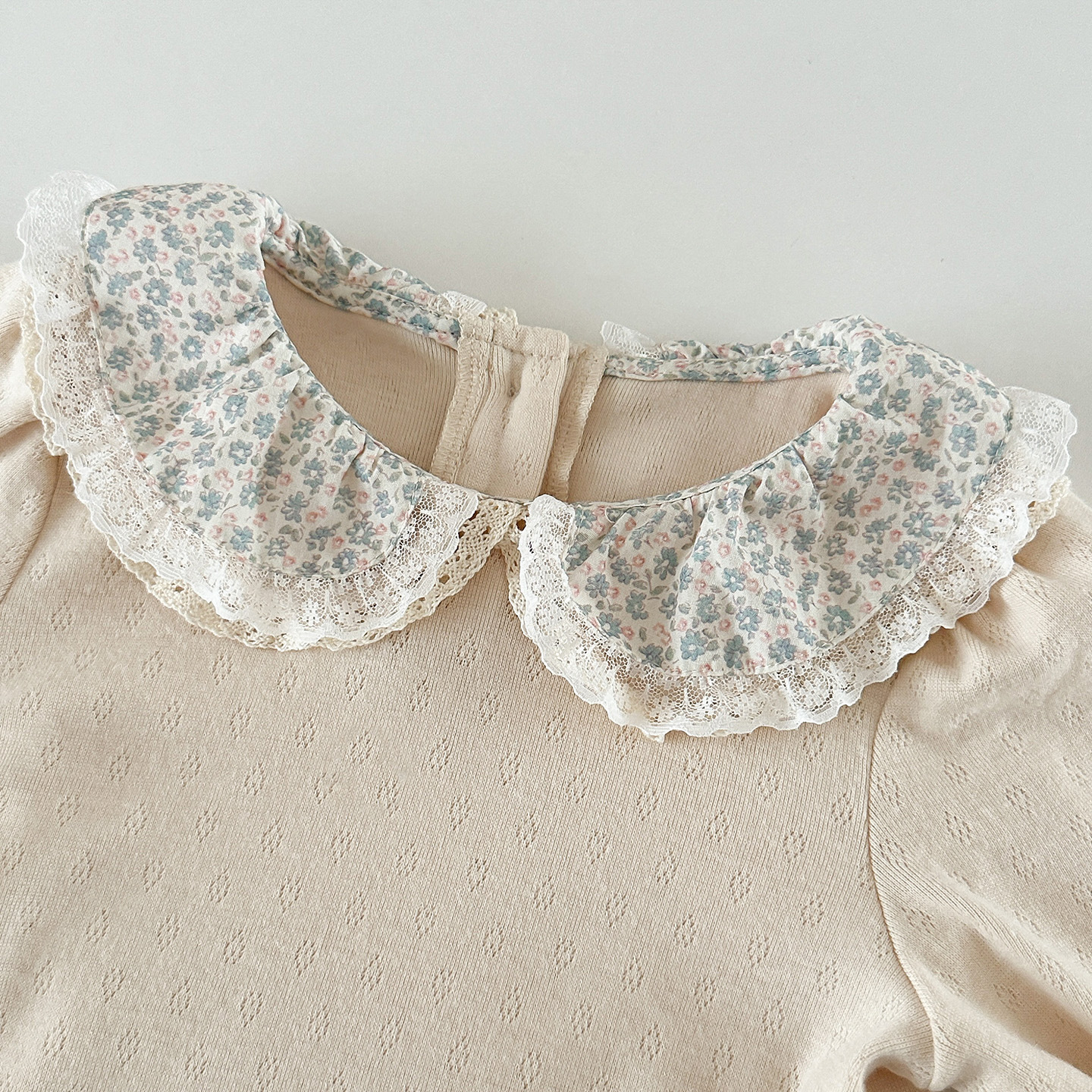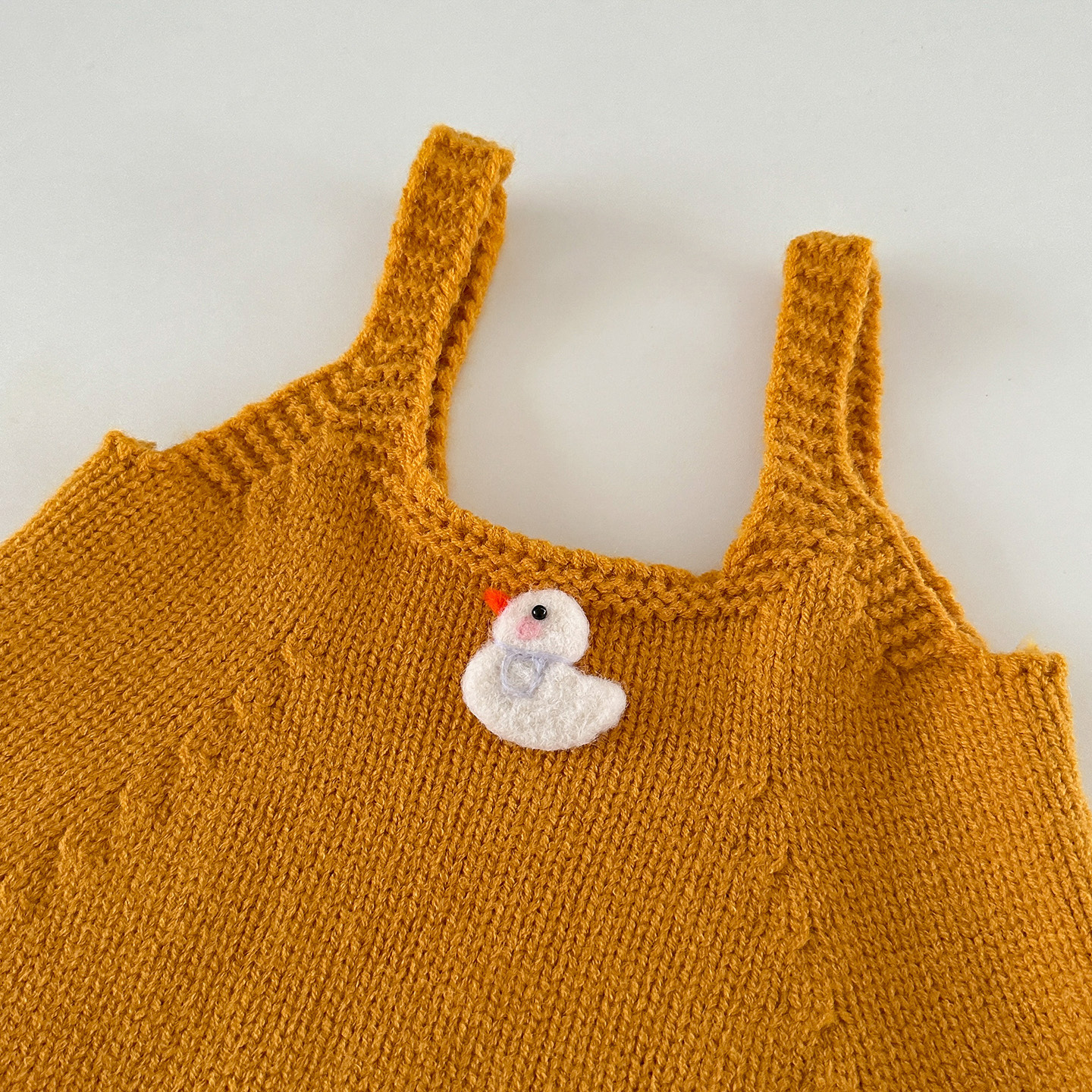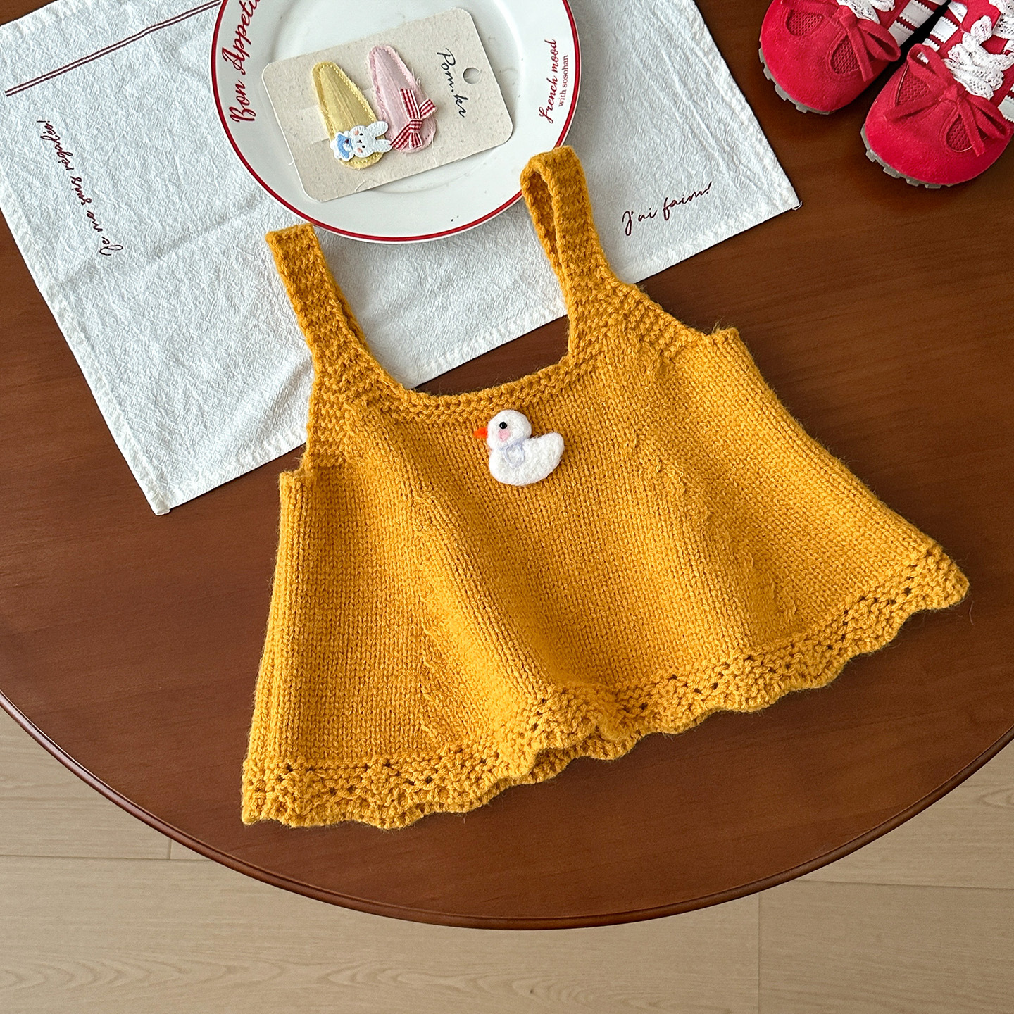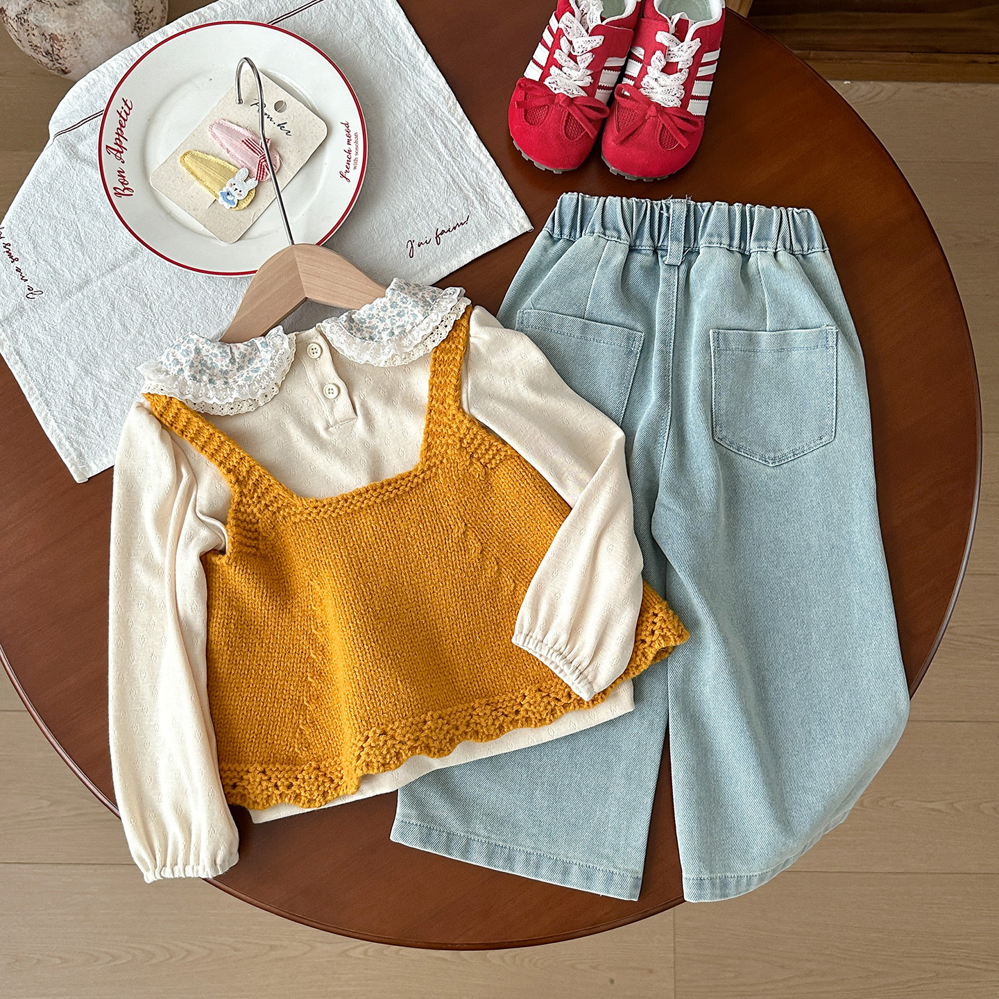 한국 여아 봄, 가을 슈트 작은 노란색 오리 니트 조끼 + 꽃무늬 칼라 셔츠 + 데님 와이드 팬츠 3피스 세트