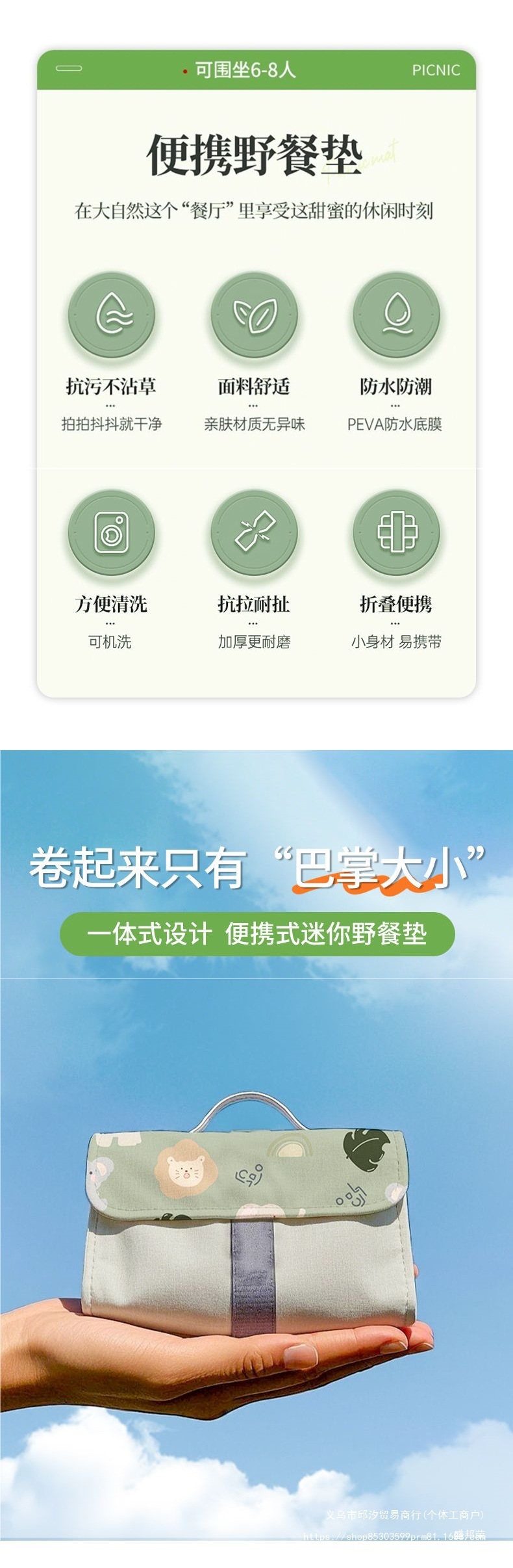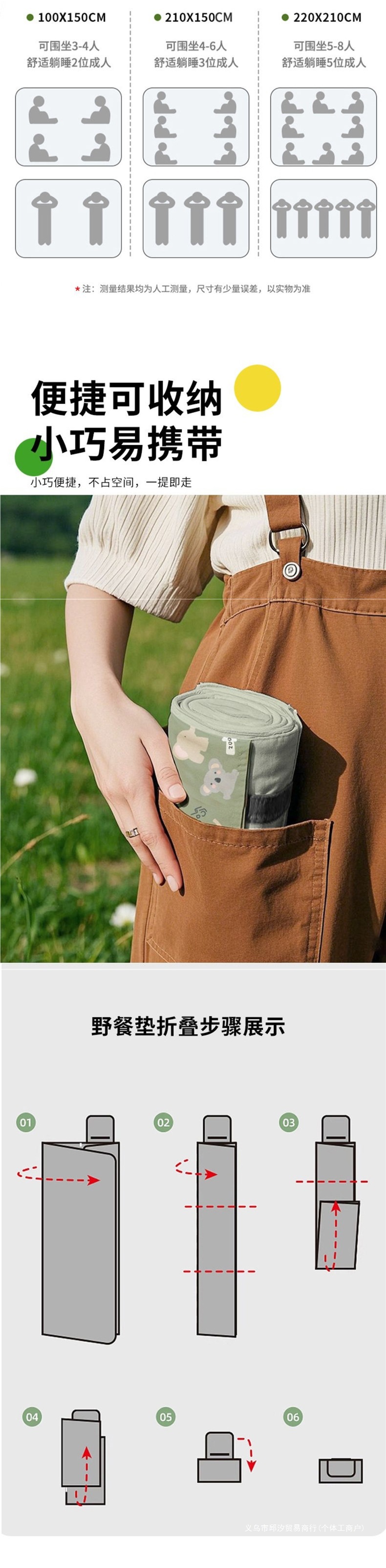 • 밀리터리 그린[1*1.5m]은 2~4명이 앉을 수 있으며 소파처럼 부드럽고 손바닥만한 크기로 말아 올릴 수 있습니다.