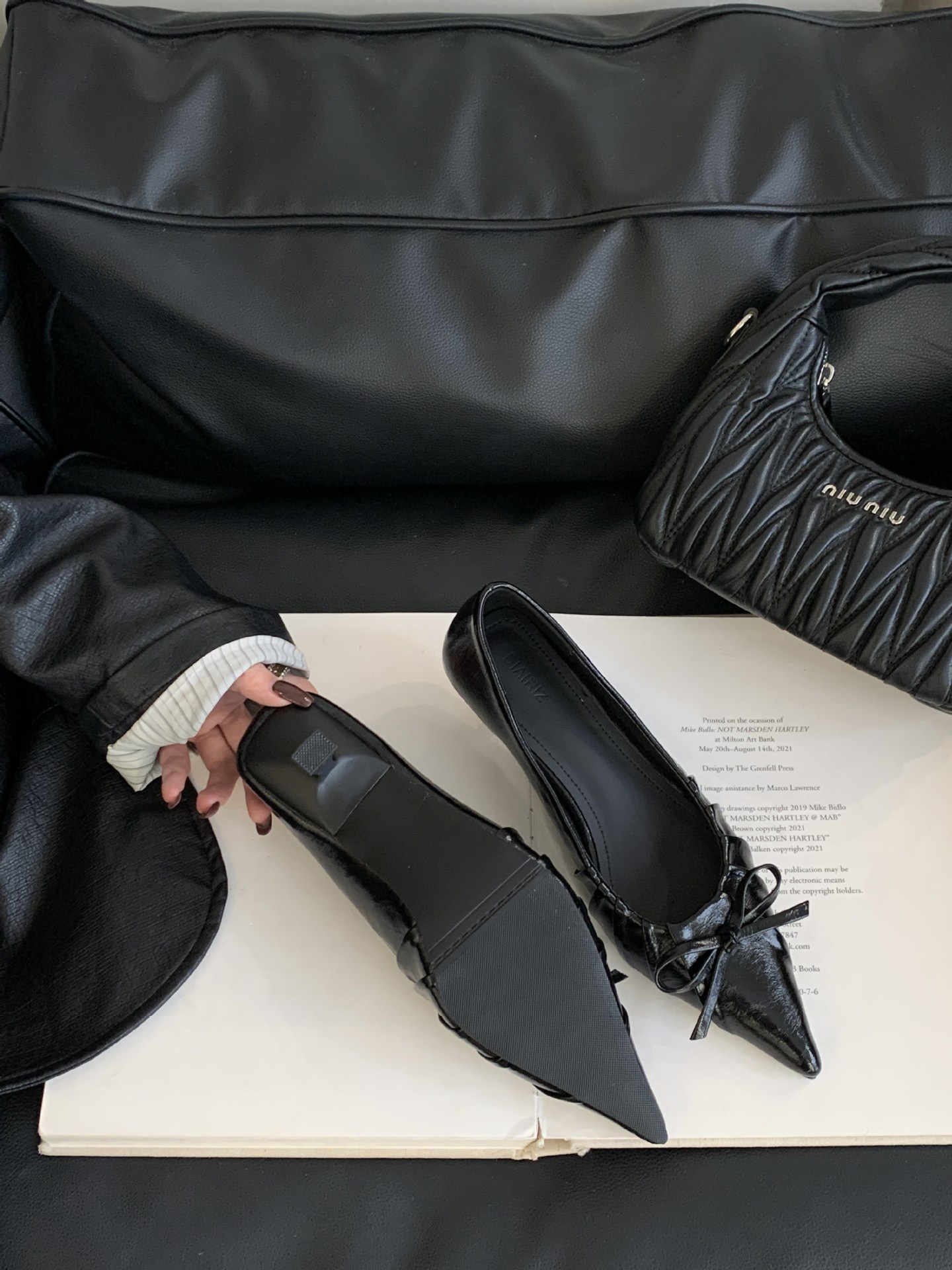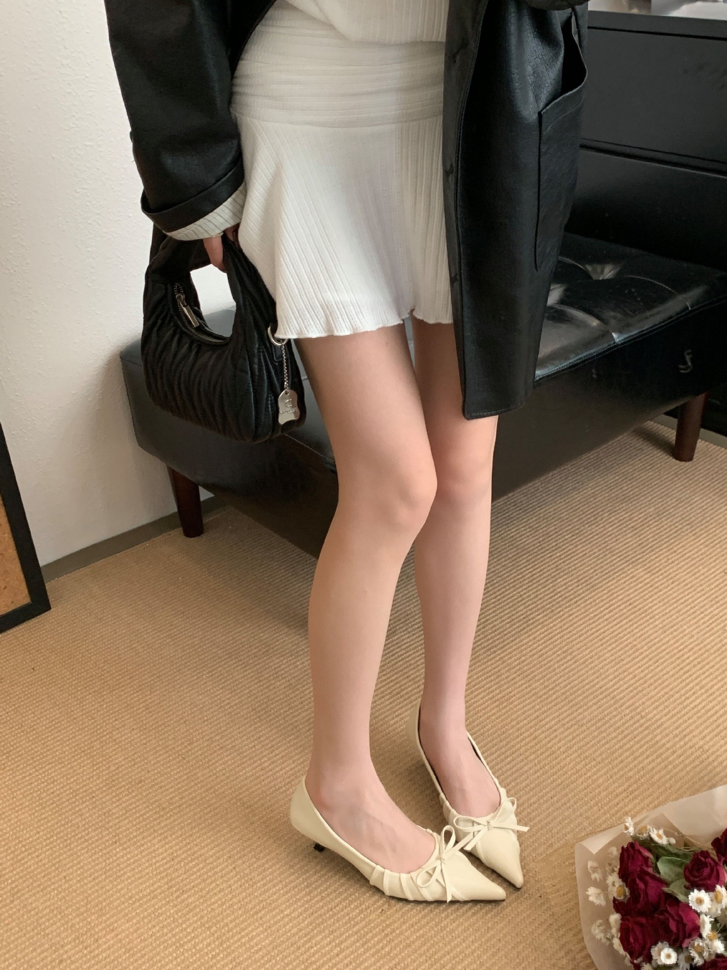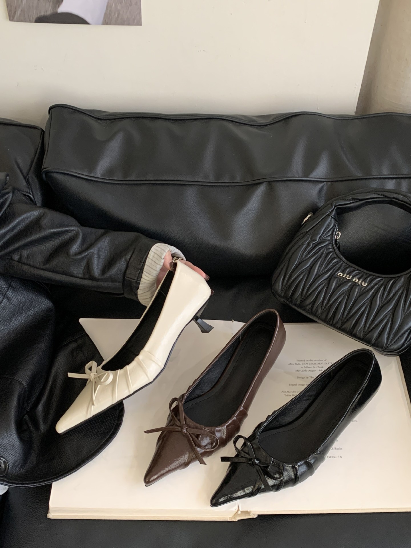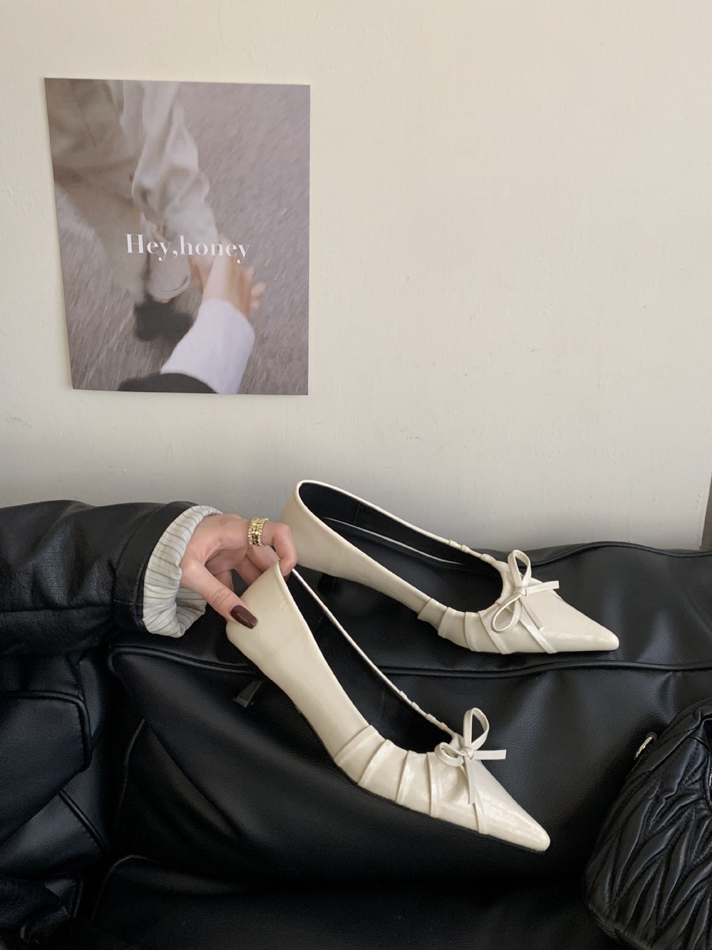 뾰족한 주름 리본 얇은 굽 프렌치 스타일 부드러운 펌프스 캣힐 가을 여성용 대형 통근화
