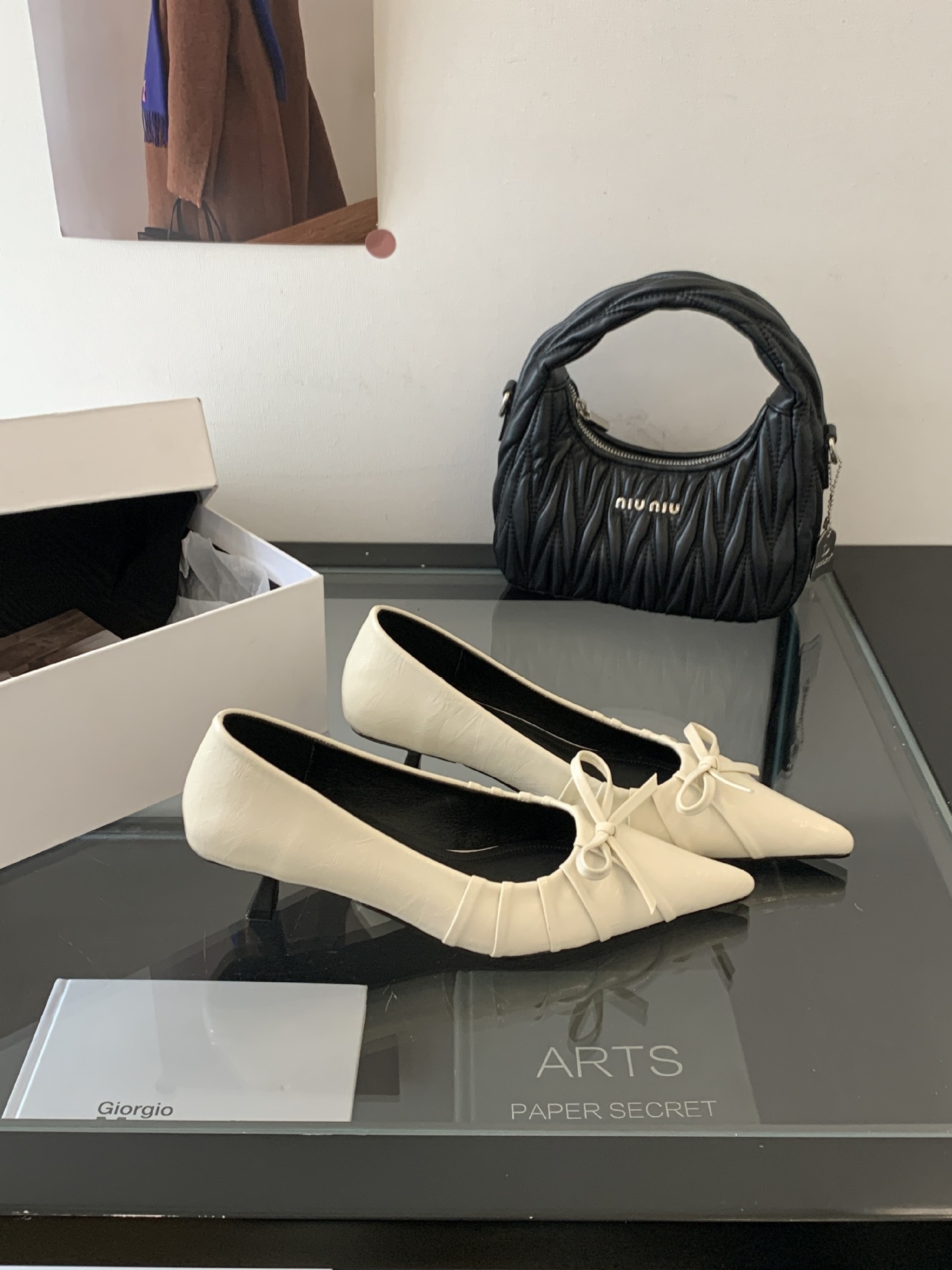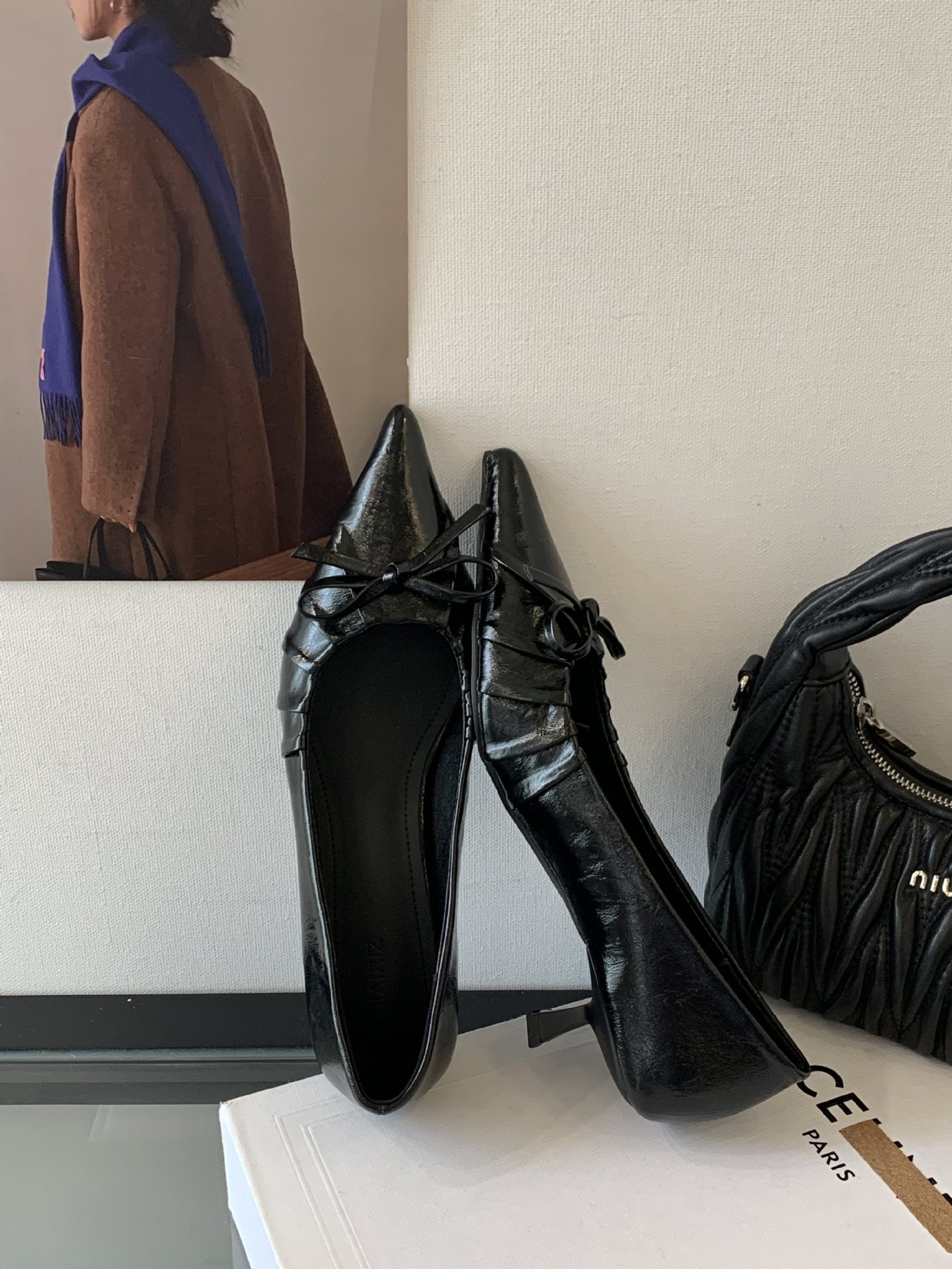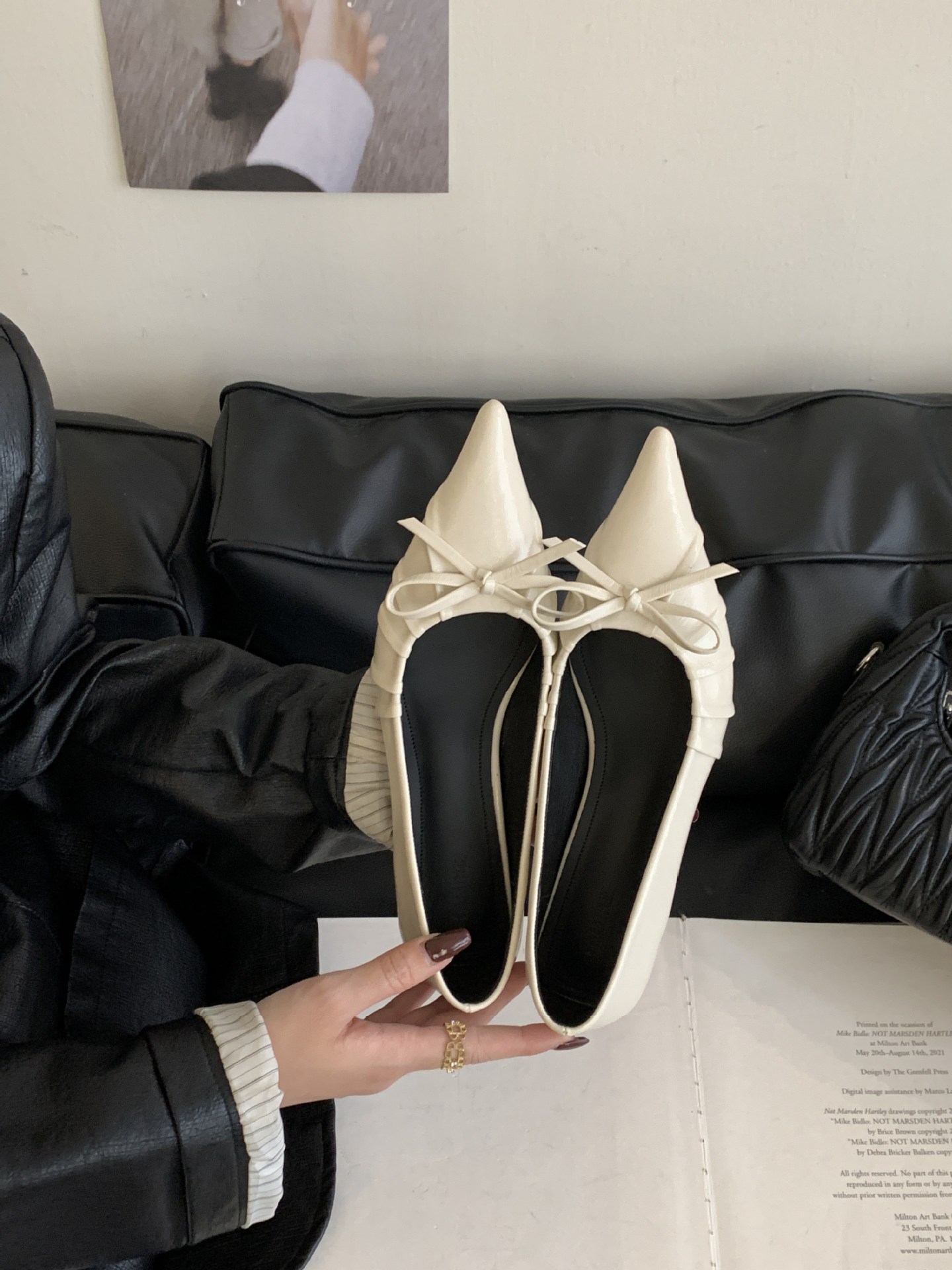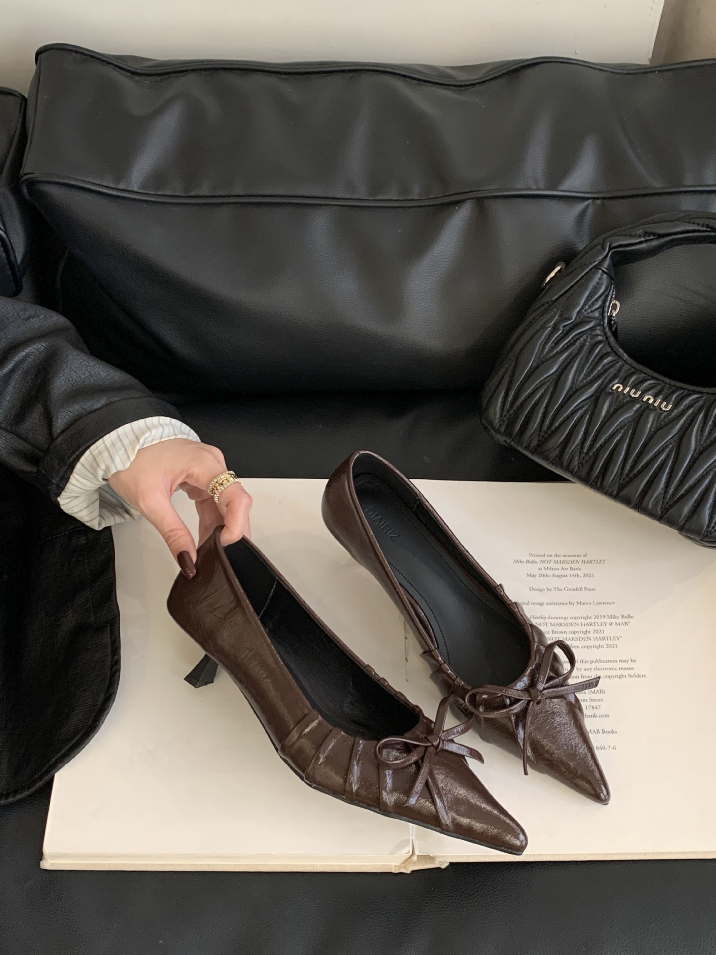 뾰족한 주름 리본 얇은 굽 프렌치 스타일 부드러운 펌프스 캣힐 가을 여성용 대형 통근화