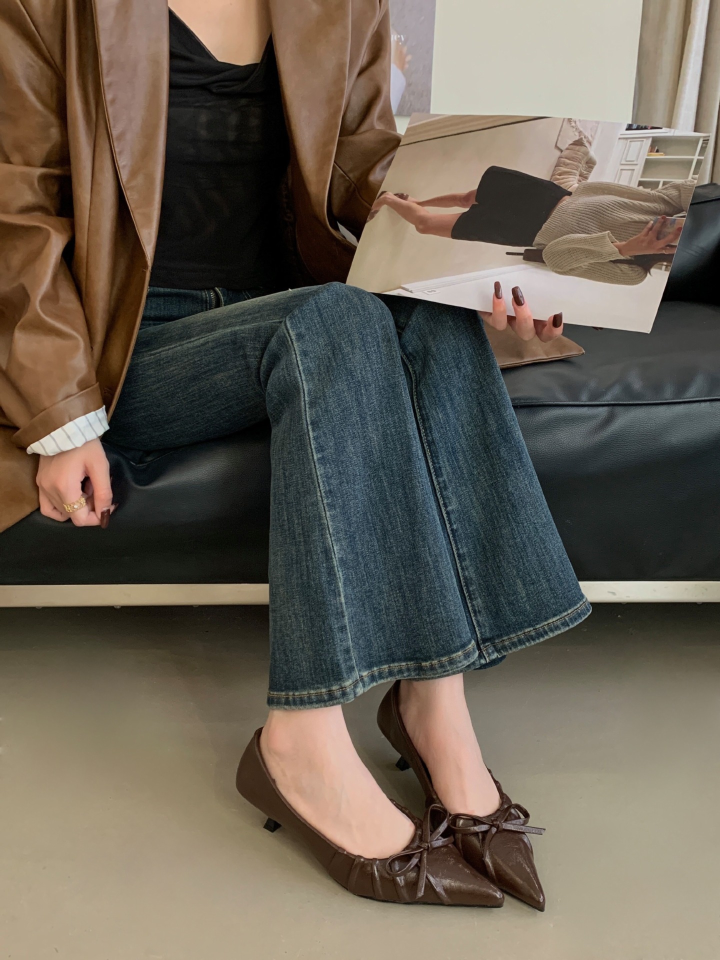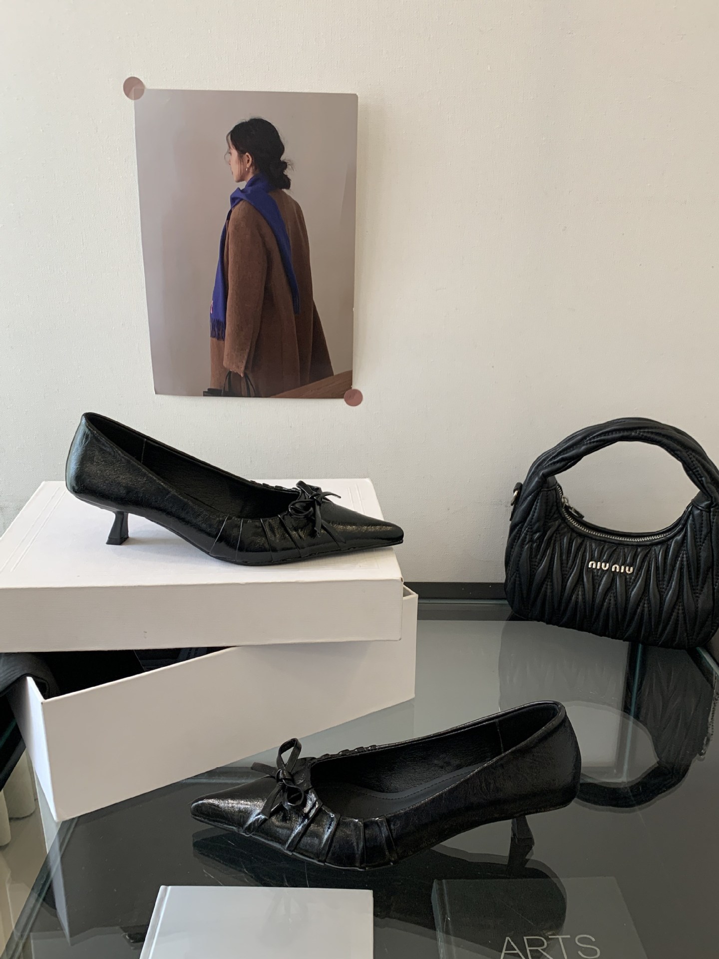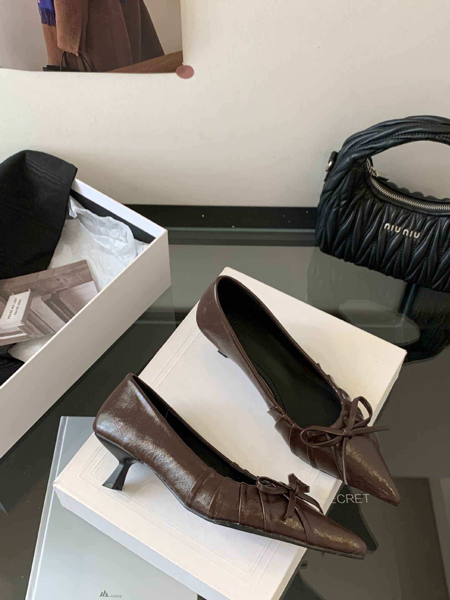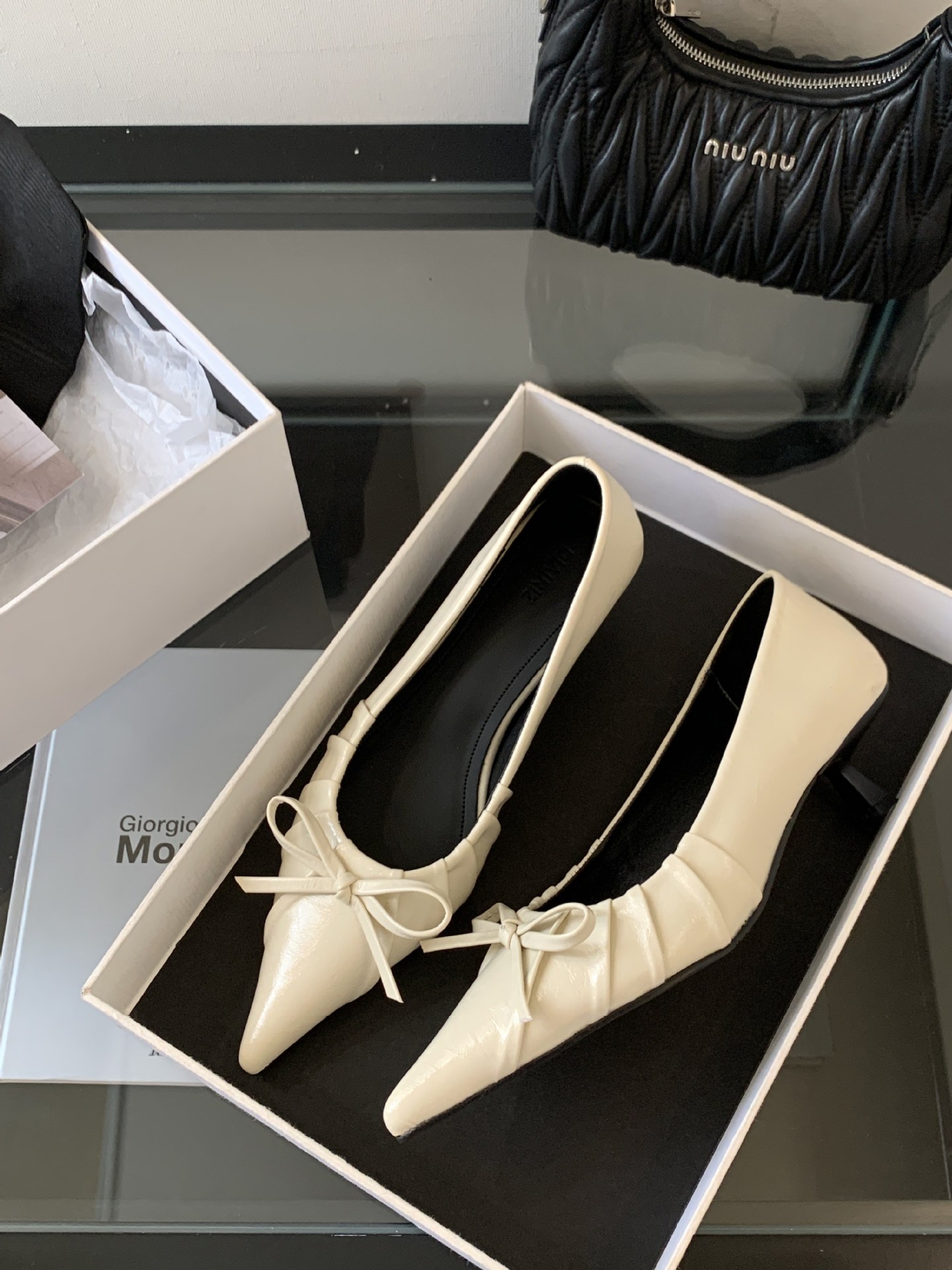 뾰족한 주름 리본 얇은 굽 프렌치 스타일 부드러운 펌프스 캣힐 가을 여성용 대형 통근화