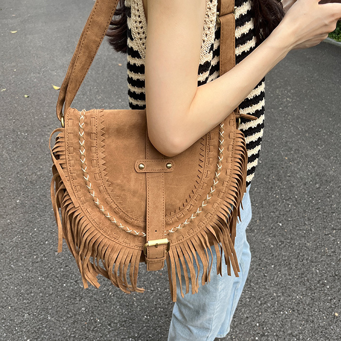 새로운 모조 스웨이드 카멜 태슬 백 여성 아메리칸 빈티지 보헤미안 스타일 크로스 바디 안장 백 에스닉 스타일 가방스토어 가기