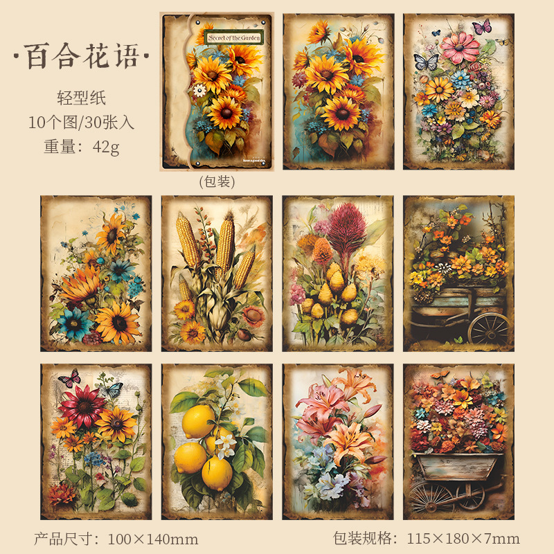 정원의 비밀 시리즈 아름다운 날 소재 종이 복고풍 식물 배경 핸드북 소재 30장 6가지 스타일