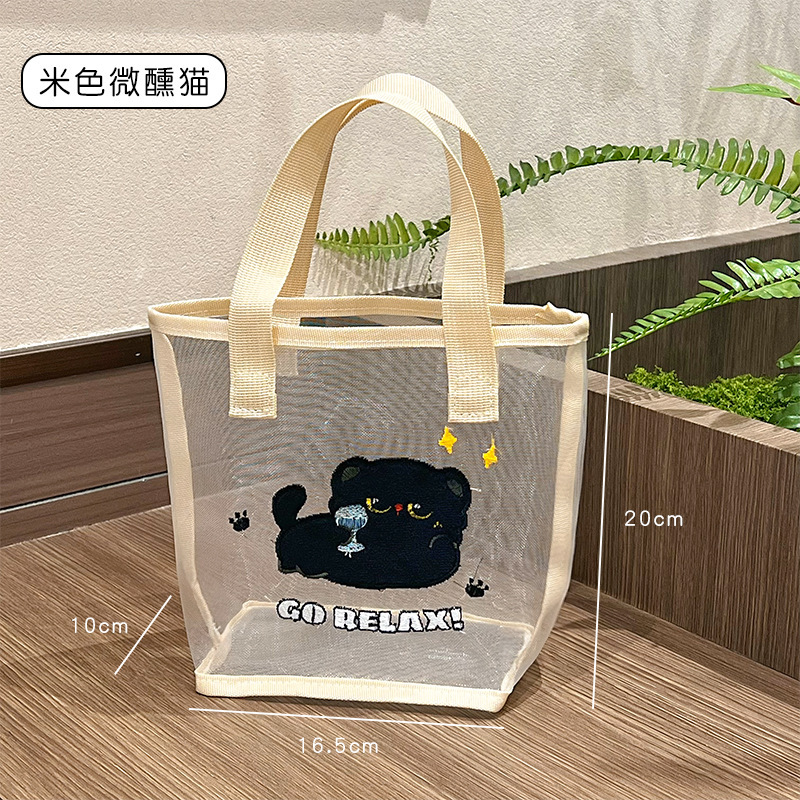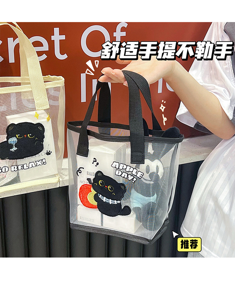 黑色小猫手提包网纱旅行沙滩收纳包透明网纱便携挎包购物袋子批发스토어 가기