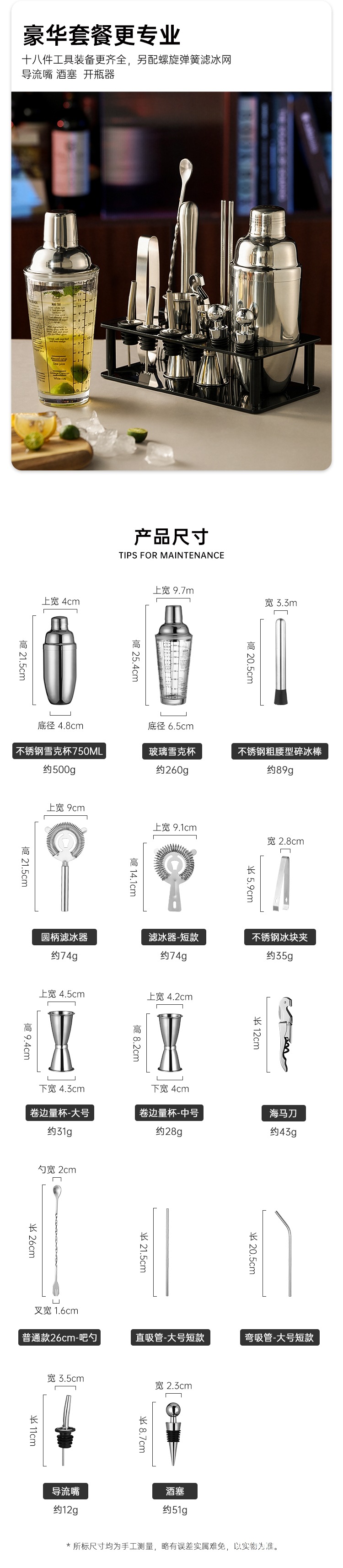 • [미세조정이 가능한 실용적인 4종 세트] 올스틸 모델 550ml + 얼음 깨는 망치 + 바 스푼 + 계량컵.