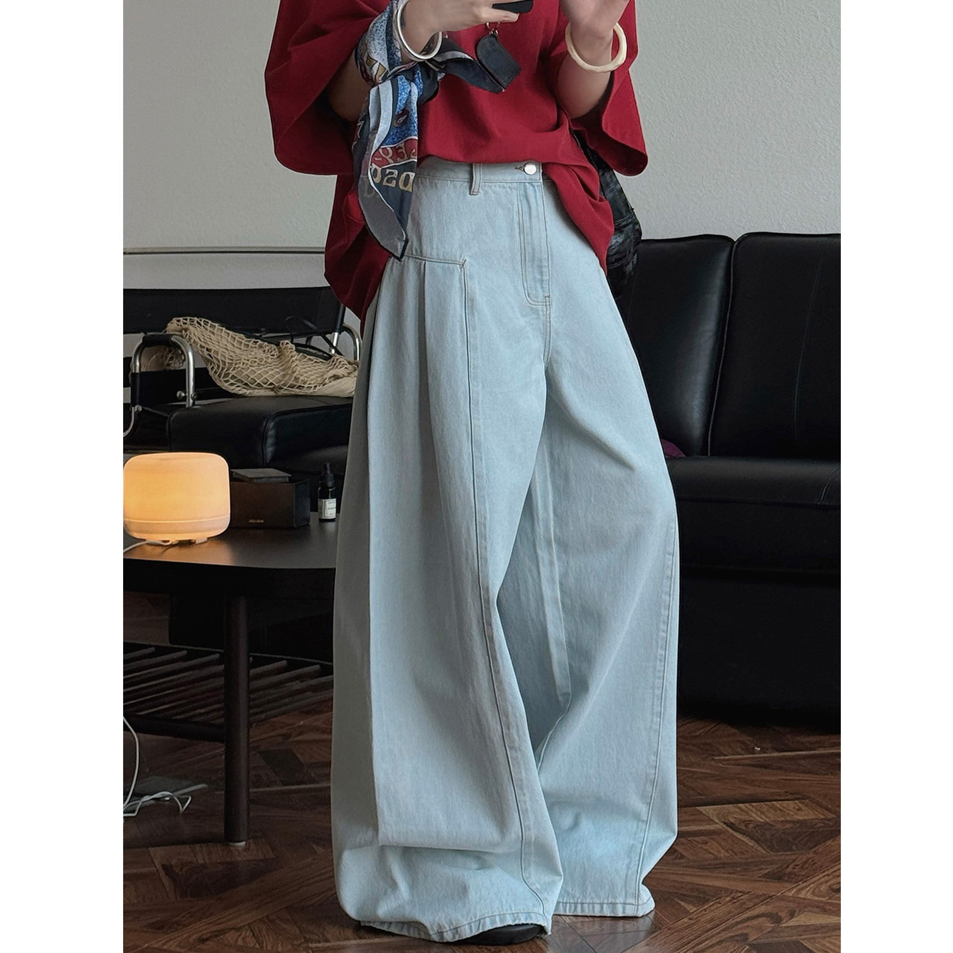 루브르 초가을 새로운 한국 스타일 INS 블로거 스타일 입체 해체 플레어 청바지 여성용 루즈한 와이드 팬츠스토어 가기