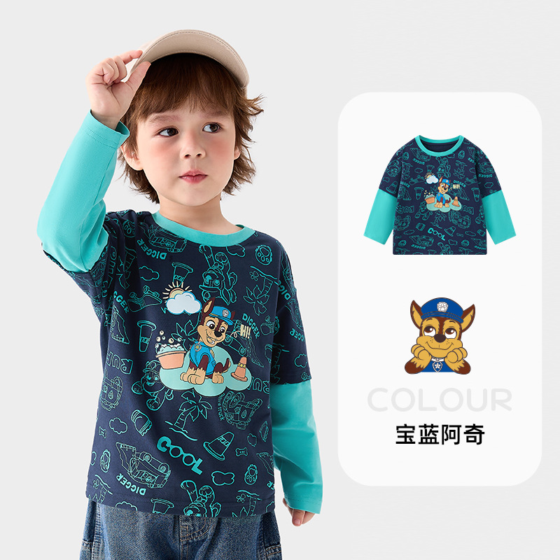 Paw Patrol Boys 가짜 투피스 긴팔 티셔츠 카테고리 A 아동용 탑 봄, 가을 베이비 보이 바닥 셔츠 열전사 인쇄