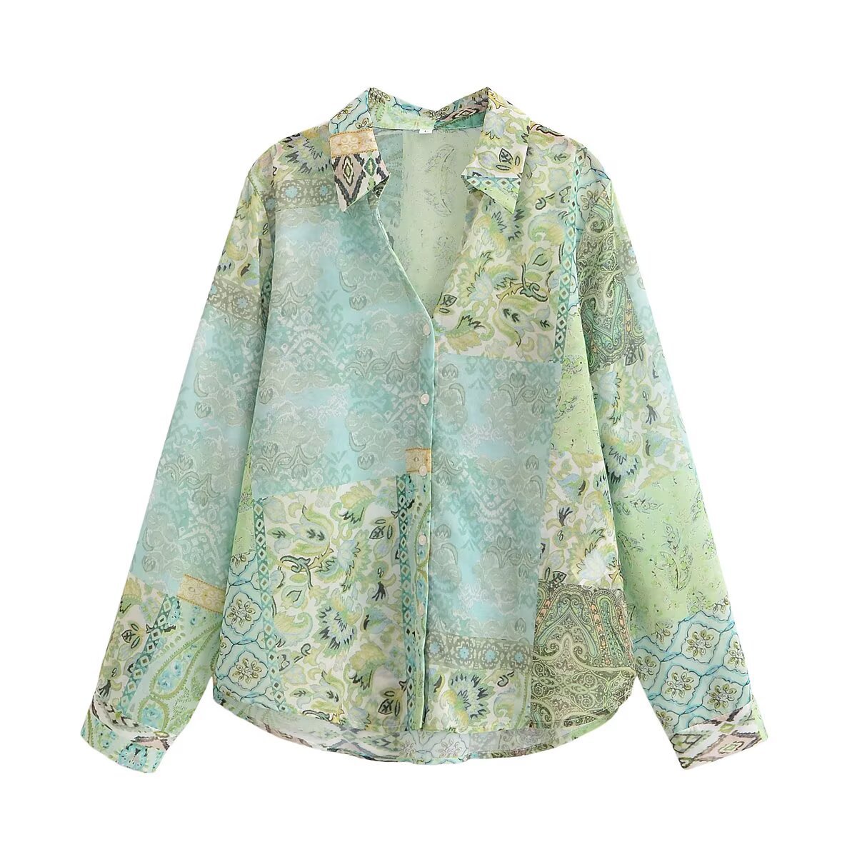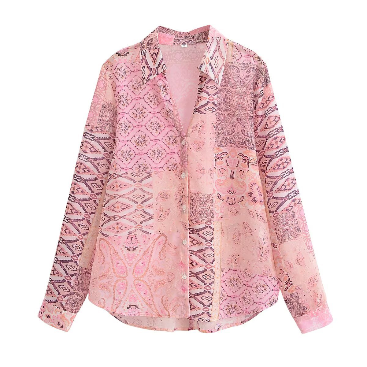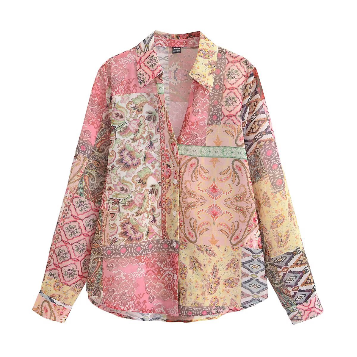 PB&ZA 여성 205 가을 새로운 달콤한 스타일 루즈 스타일 랜덤 프린트 쉬폰 라펠 긴팔 셔츠