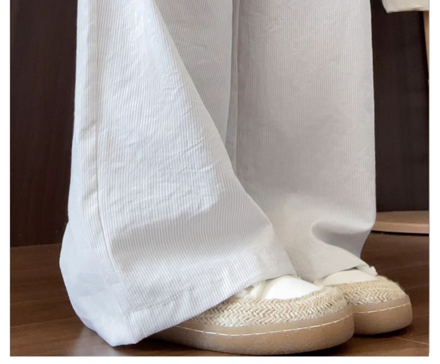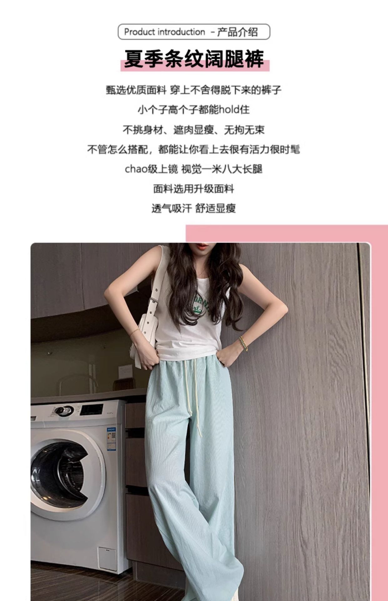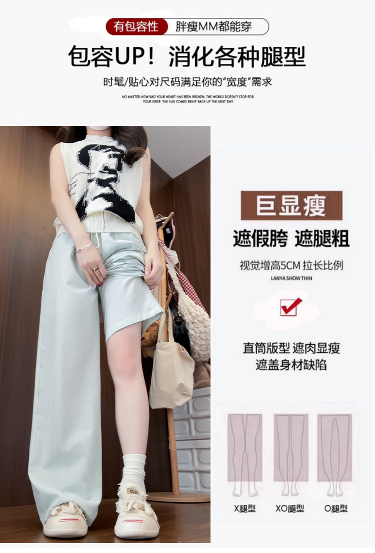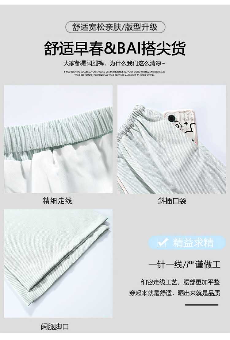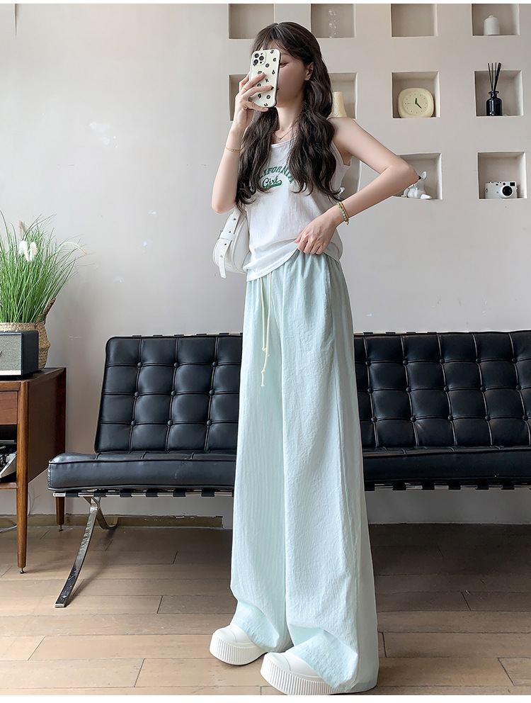 여성용 녹색 고리버들 스트라이프 바지 여름 얇은 2025 새로운 하이 웨이스트 캐주얼 작은 게으른 스타일 와이드 레그 팬츠스토어 가기