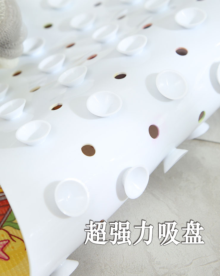 使用方法及安全提示:多个强力吸盘,使用前请先将地面用湿拖把拖净(防滑垫吸盘在湿地面砖上容易牢牢吸住),或者给地面洒水再把防滑垫铺在地砖上,最好再站上去踩几下,就与地面贴得牢牢的了。