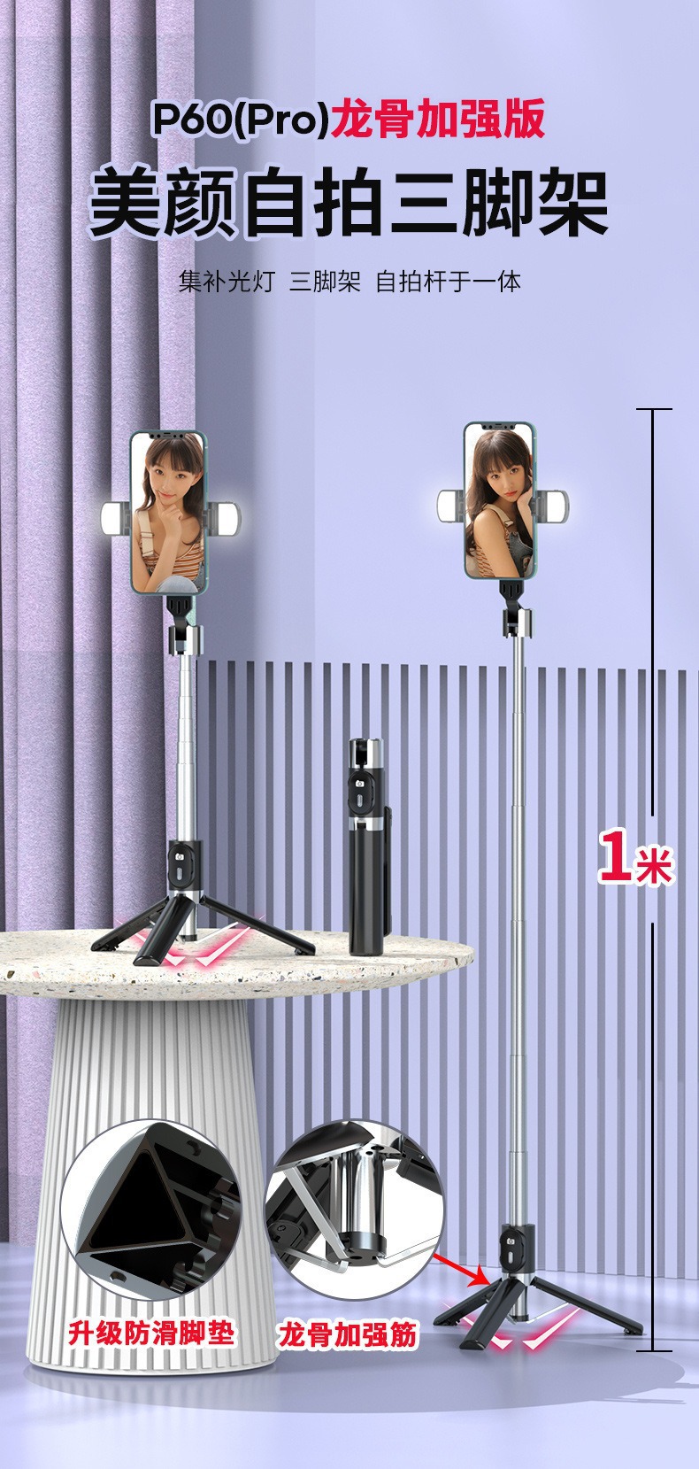새로운 P60 PLUS 블루투스 셀카봉, 흔들림 방지 휴대폰 셀카 아티팩트, 뷰티 필 라이트, 라이브 스트리밍 삼각대스토어 가기