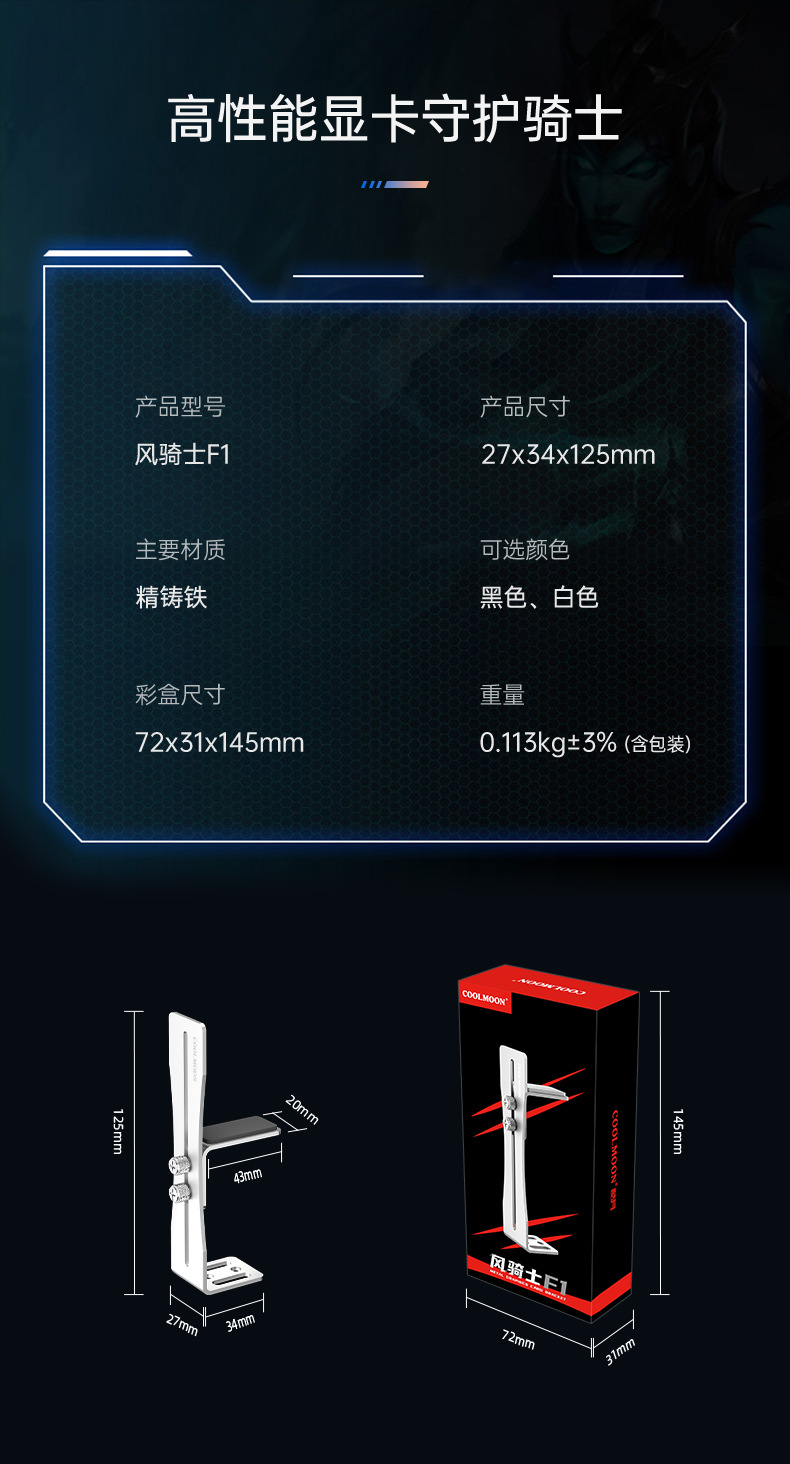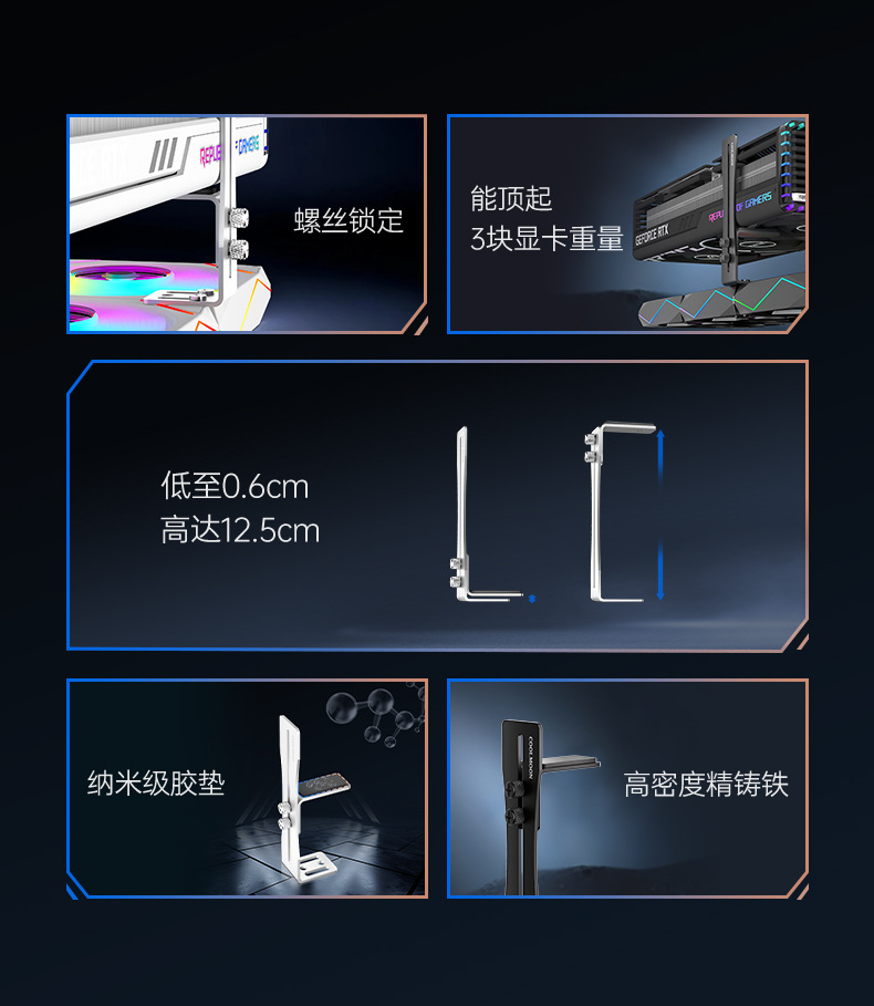 酷月F1风骑士铝合金显卡支架,支撑高度低至0.6cm,高达12.5cm,铝合金金属材质,超薄机身设计,强力支撑显卡,防止显卡下垂变形,独立彩盒包装,品牌现货供应,欢迎下单!