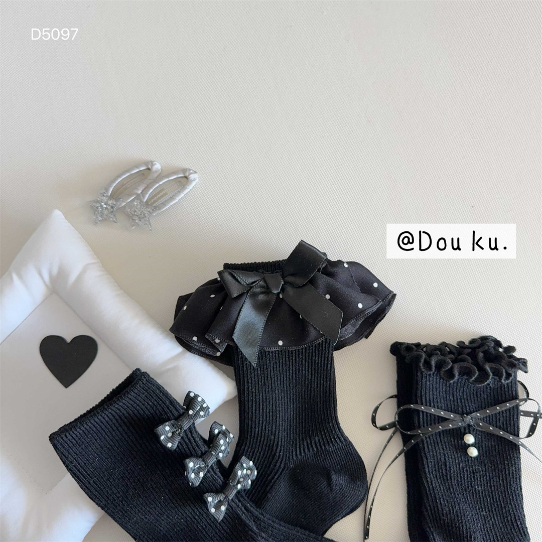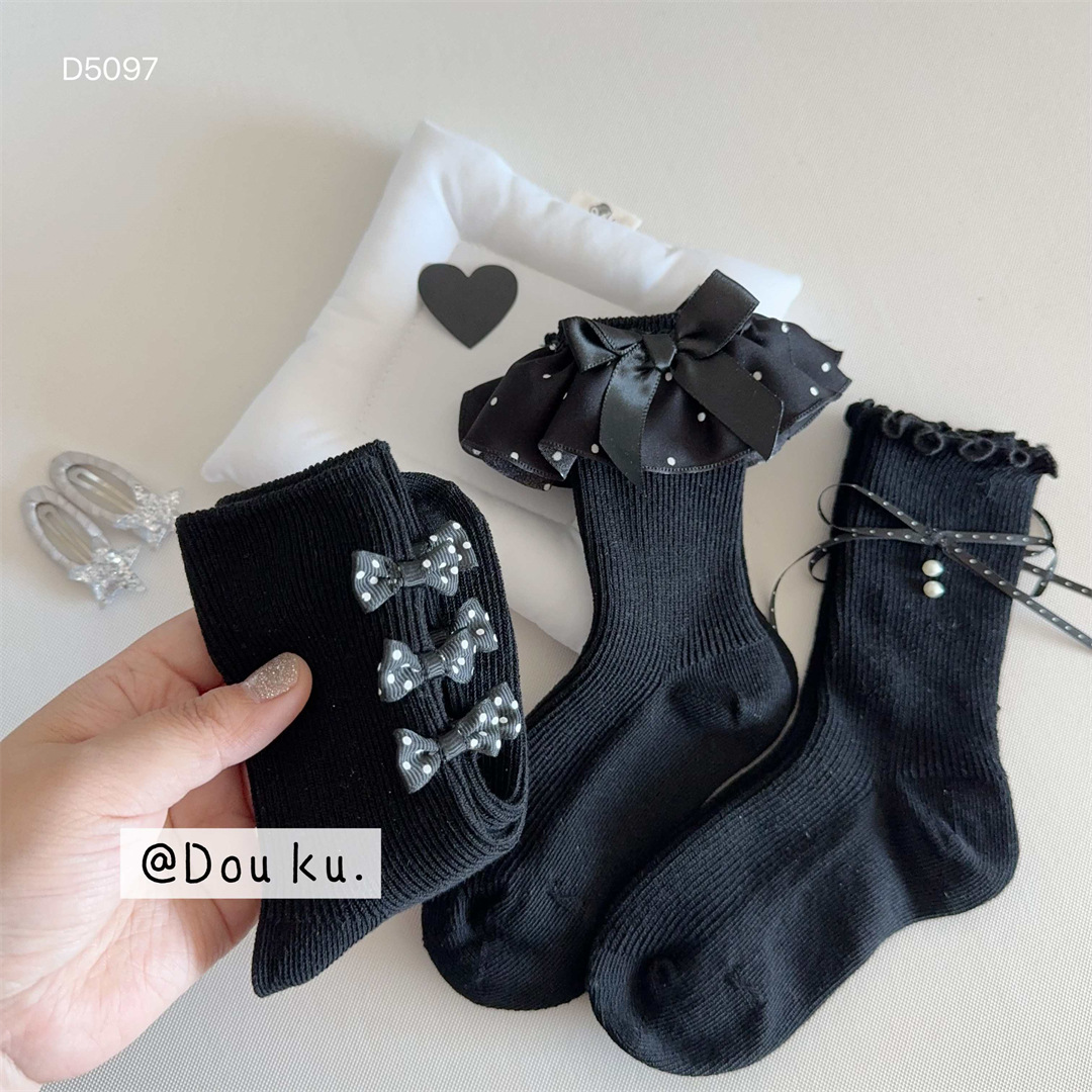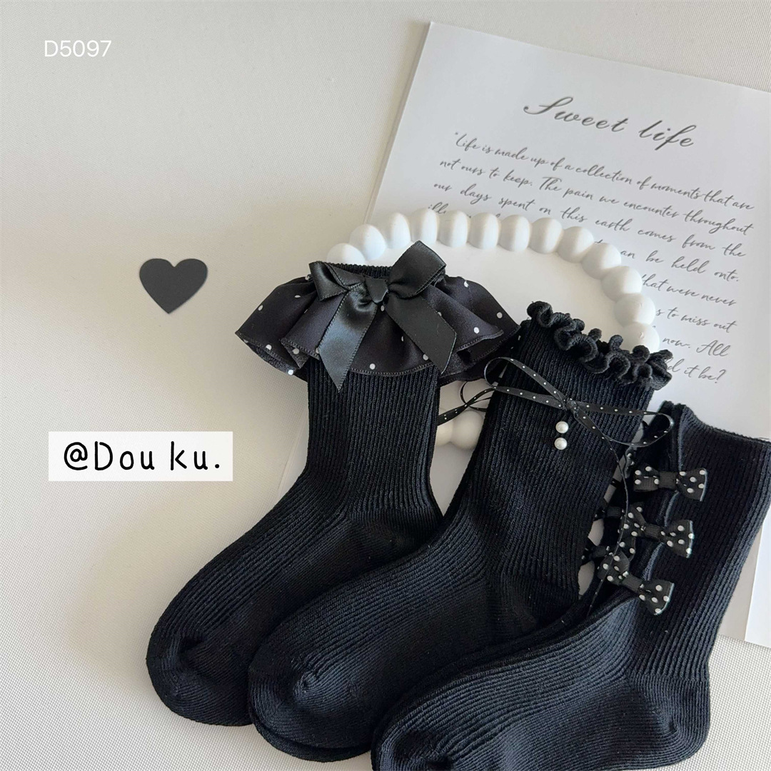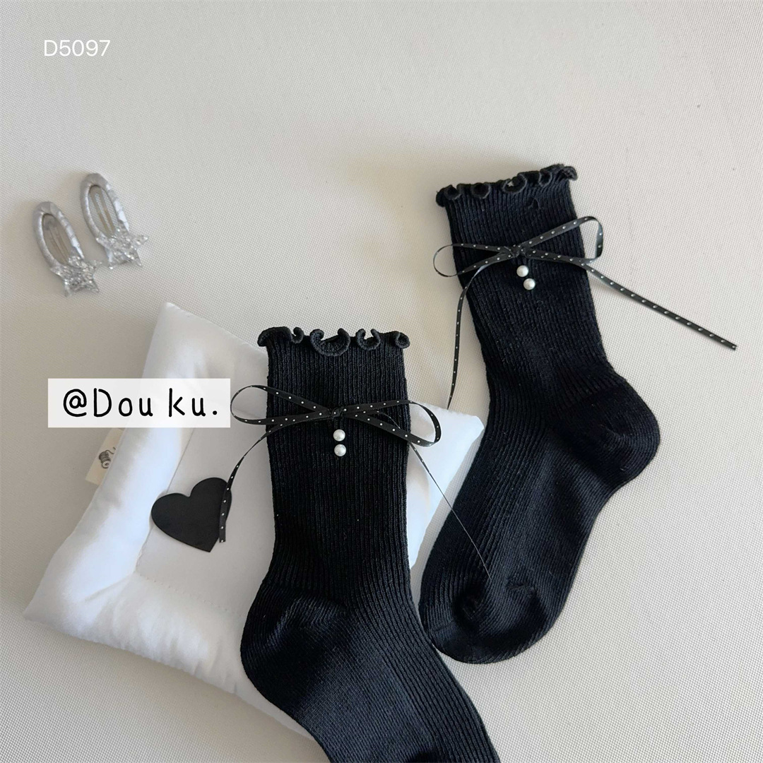 Duku 2025 가을 겨울 남성용 및 여성용 종아리 중간 양말, 한국식 검은색 레이스 리본면 양말 2-12세 D5097스토어 가기