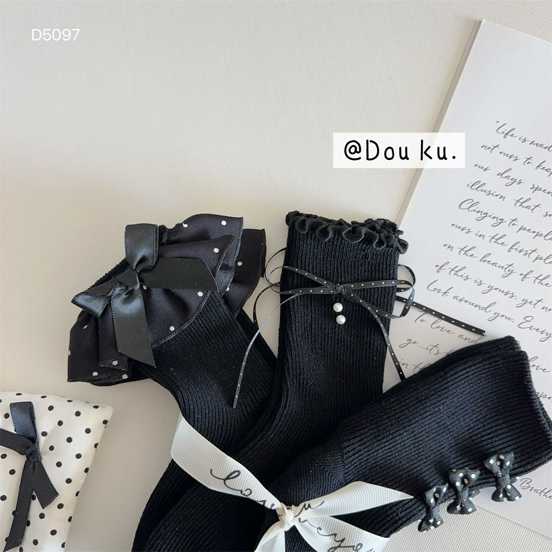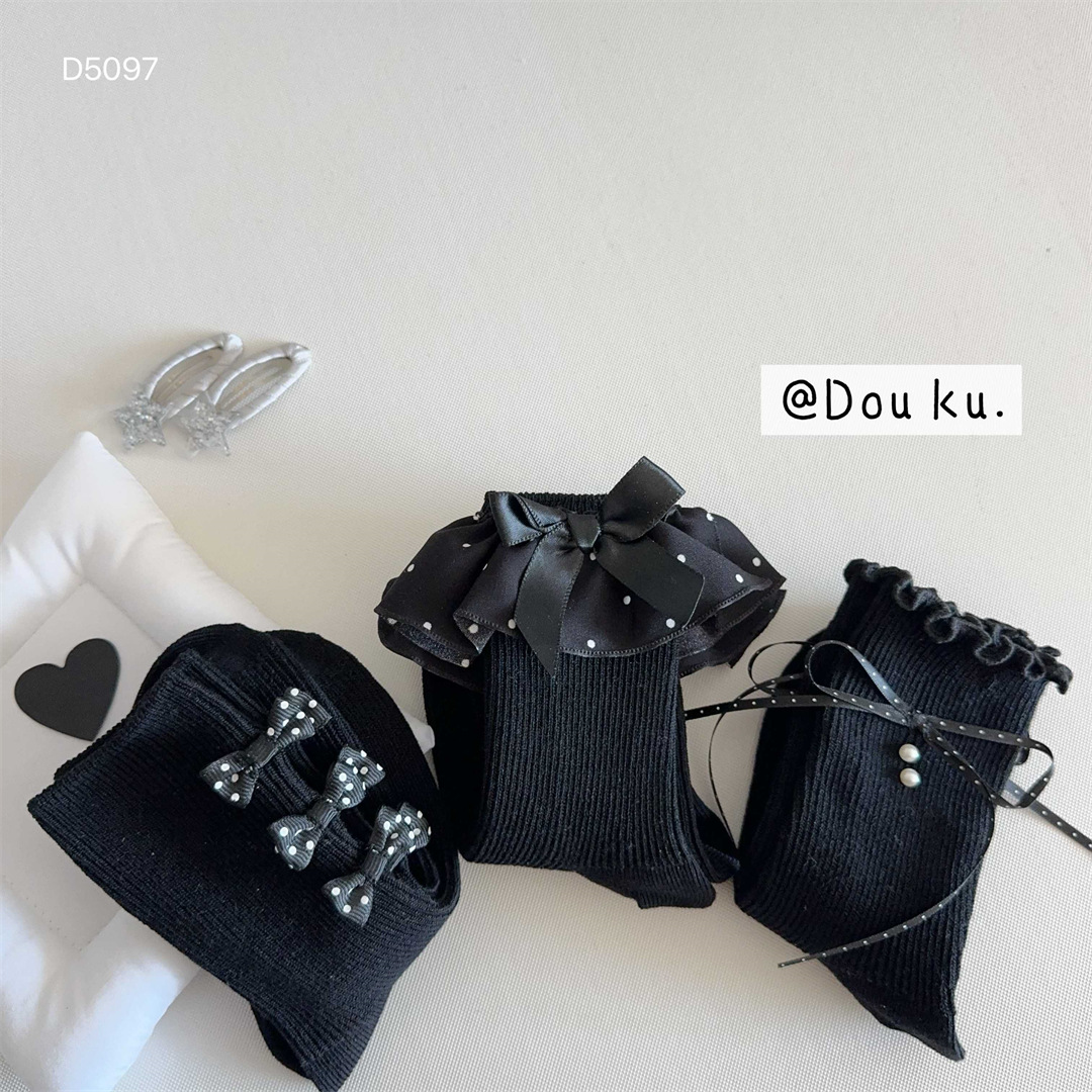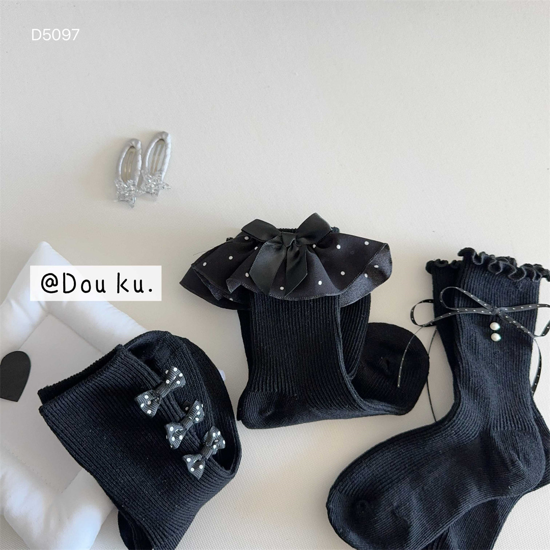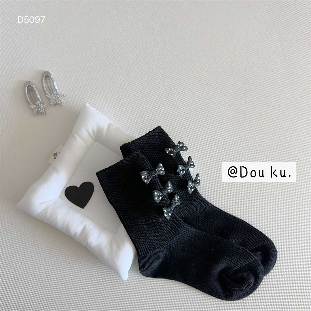 Duku 2025 가을 겨울 남성용 및 여성용 종아리 중간 양말, 한국식 검은색 레이스 리본면 양말 2-12세 D5097스토어 가기