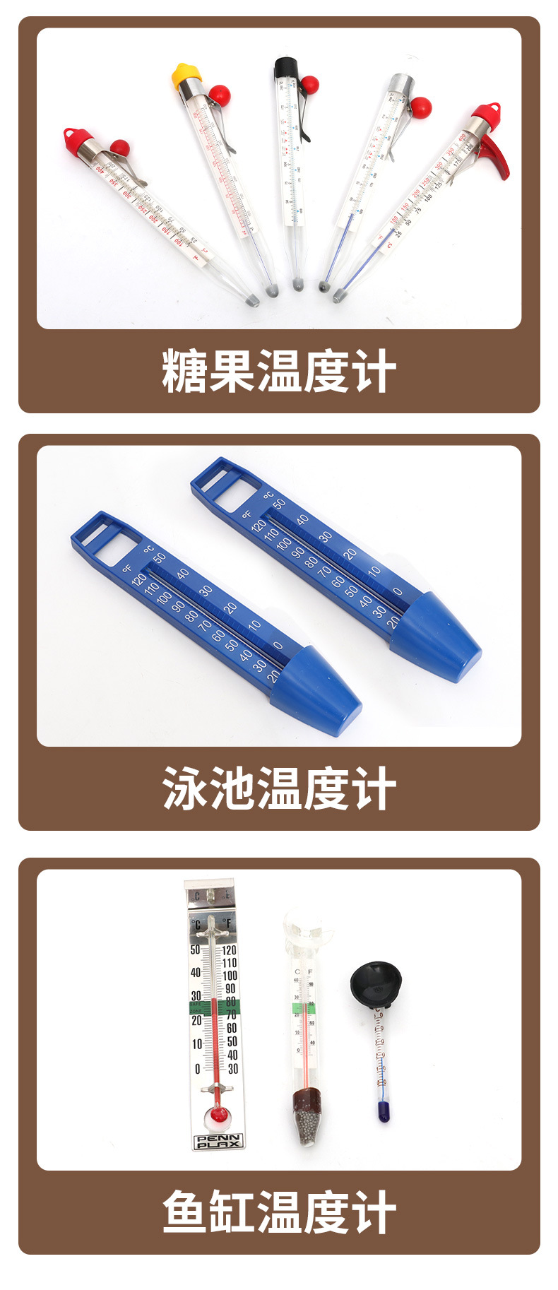 宁波市鄞州姜山迎丰温度计厂原公司名为(宁波市鄞州姜山永爱温度计厂)我们是一家以生产红酒温度计、厨房温度计、泳池温度计、糖果温度计,多种棒式温度计、PVC温度计等产品的生产商,拥有完整、科学的质量管理体系。