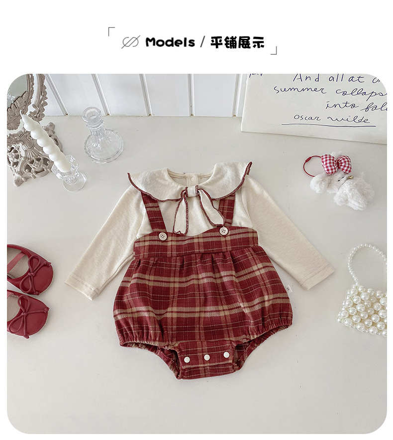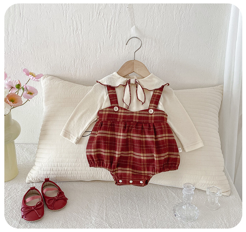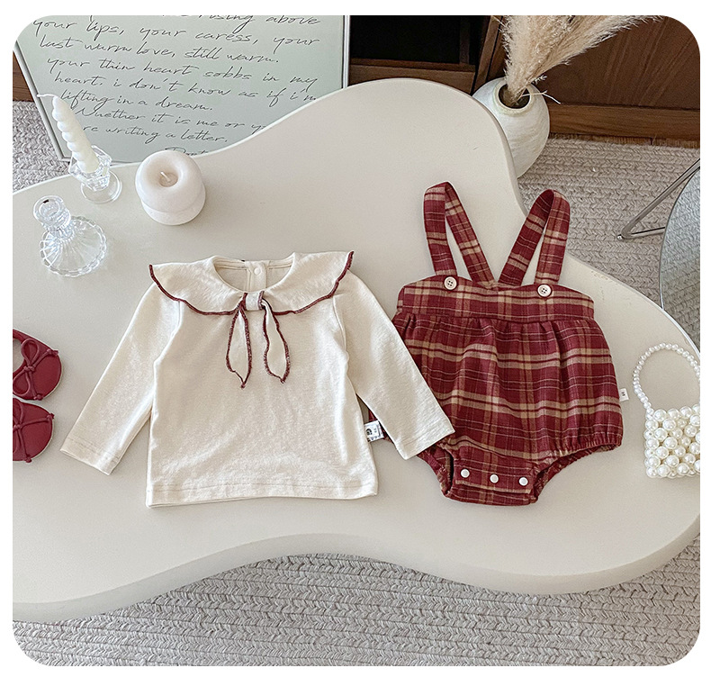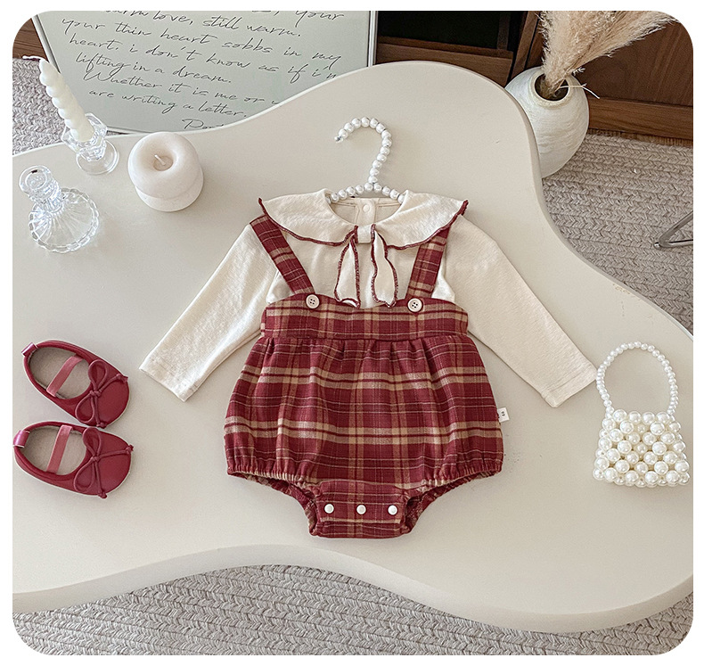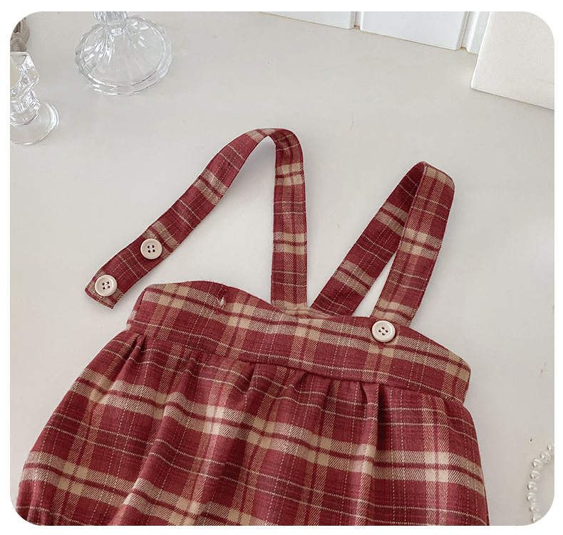 Dianxi 2025 새로운 가을 스타일 유아 격자 무늬 작업복 정장 아기 소녀 바닥 셔츠 투피스 세트