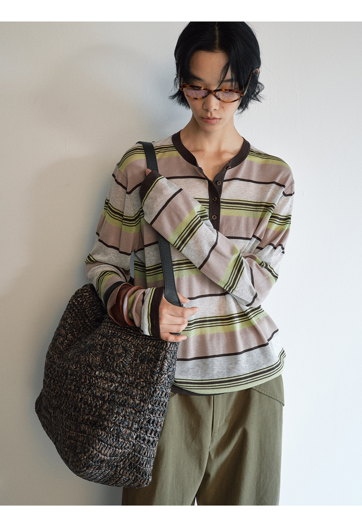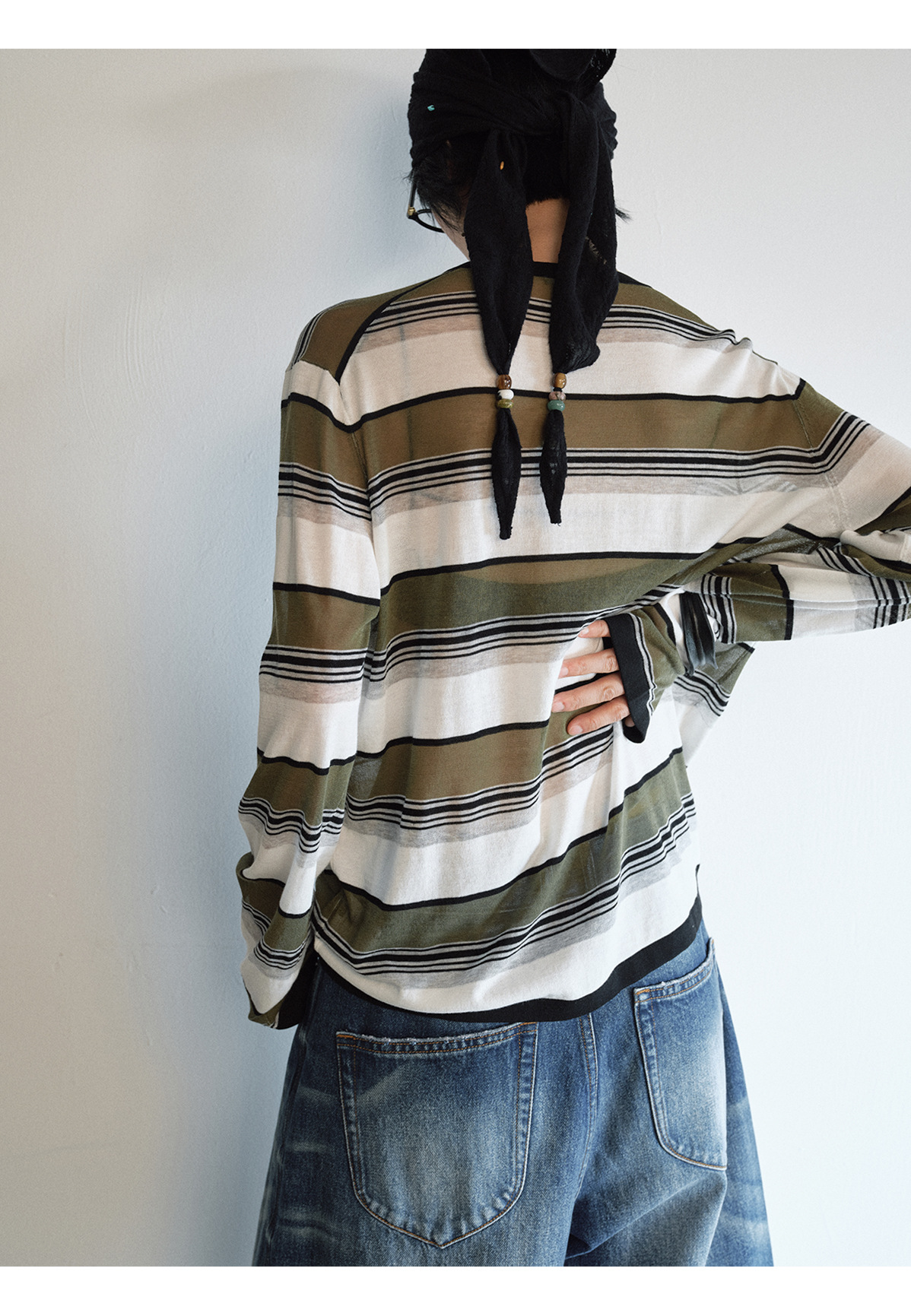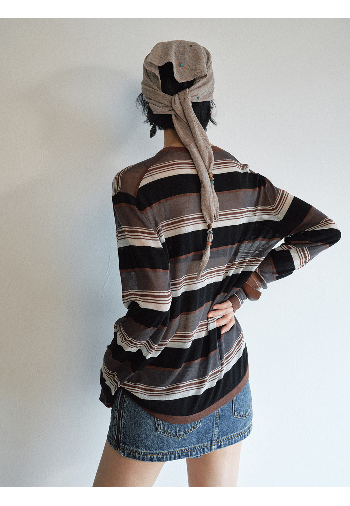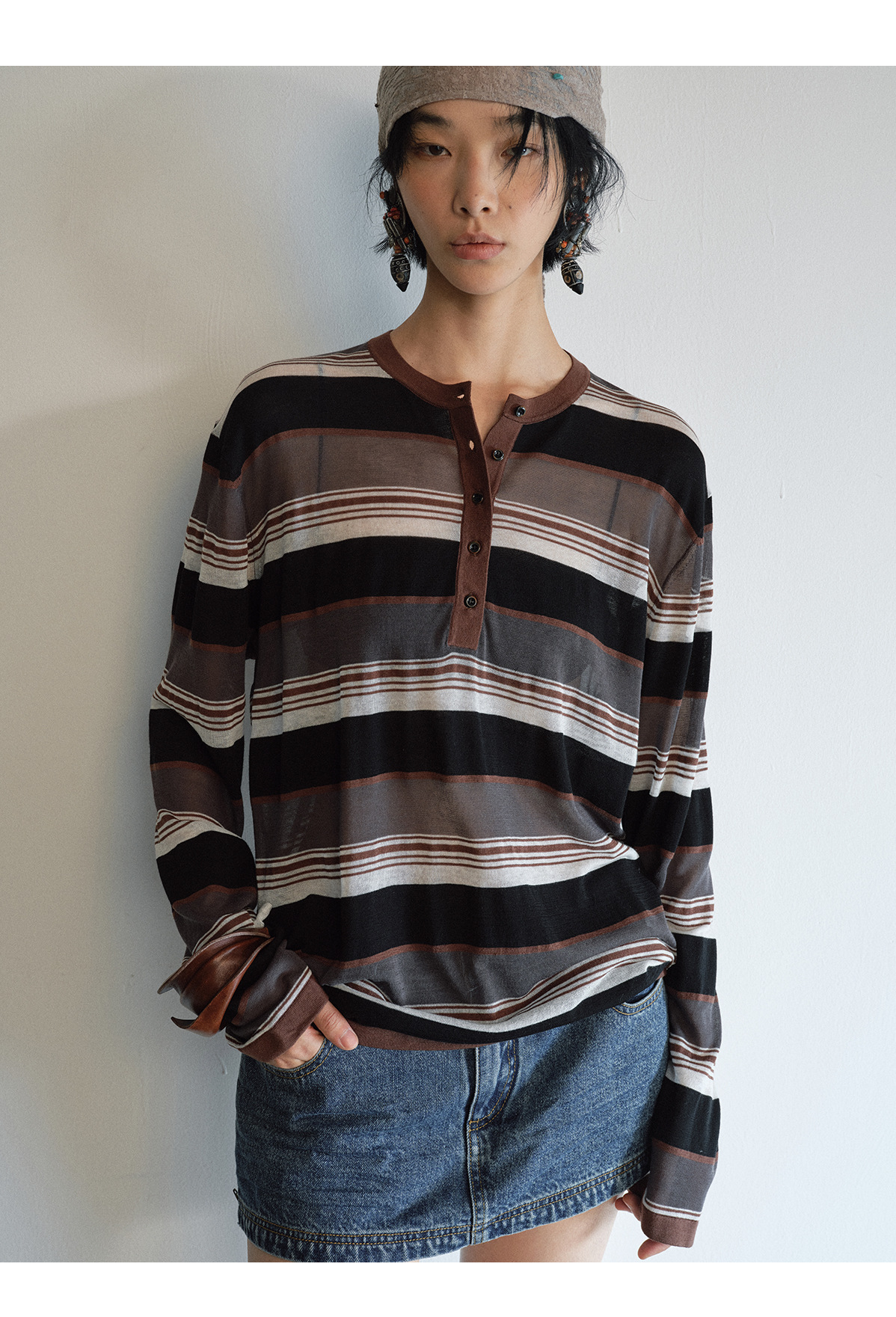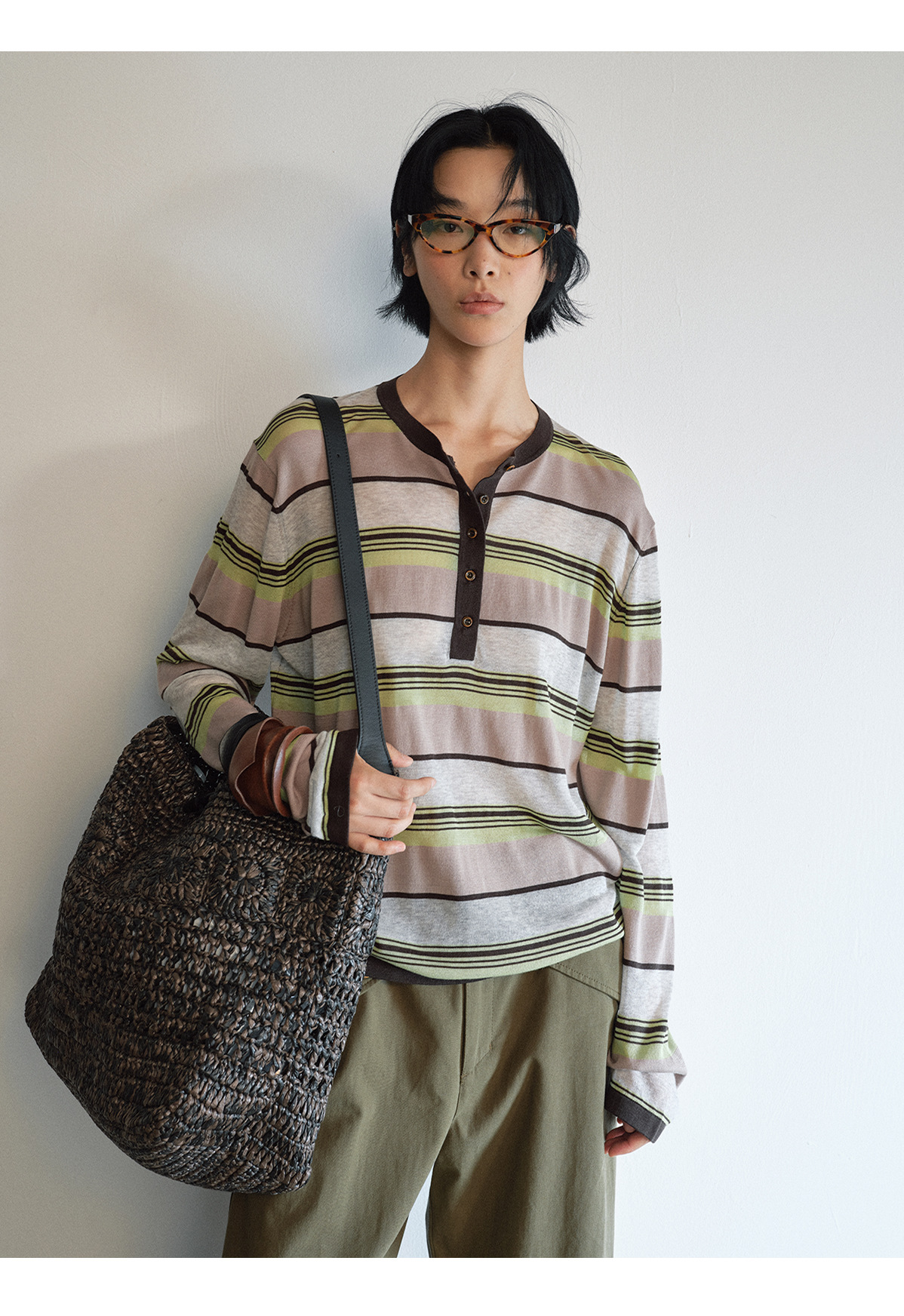 [시시] 초가을 신상 텐셀 레트로 스트라이프 니트 얇고 투명한 긴팔 헨리넥 탑 여성용 V9264